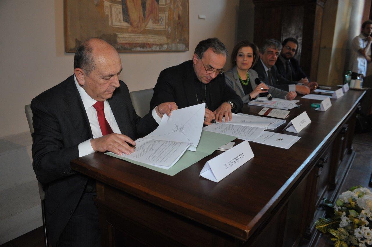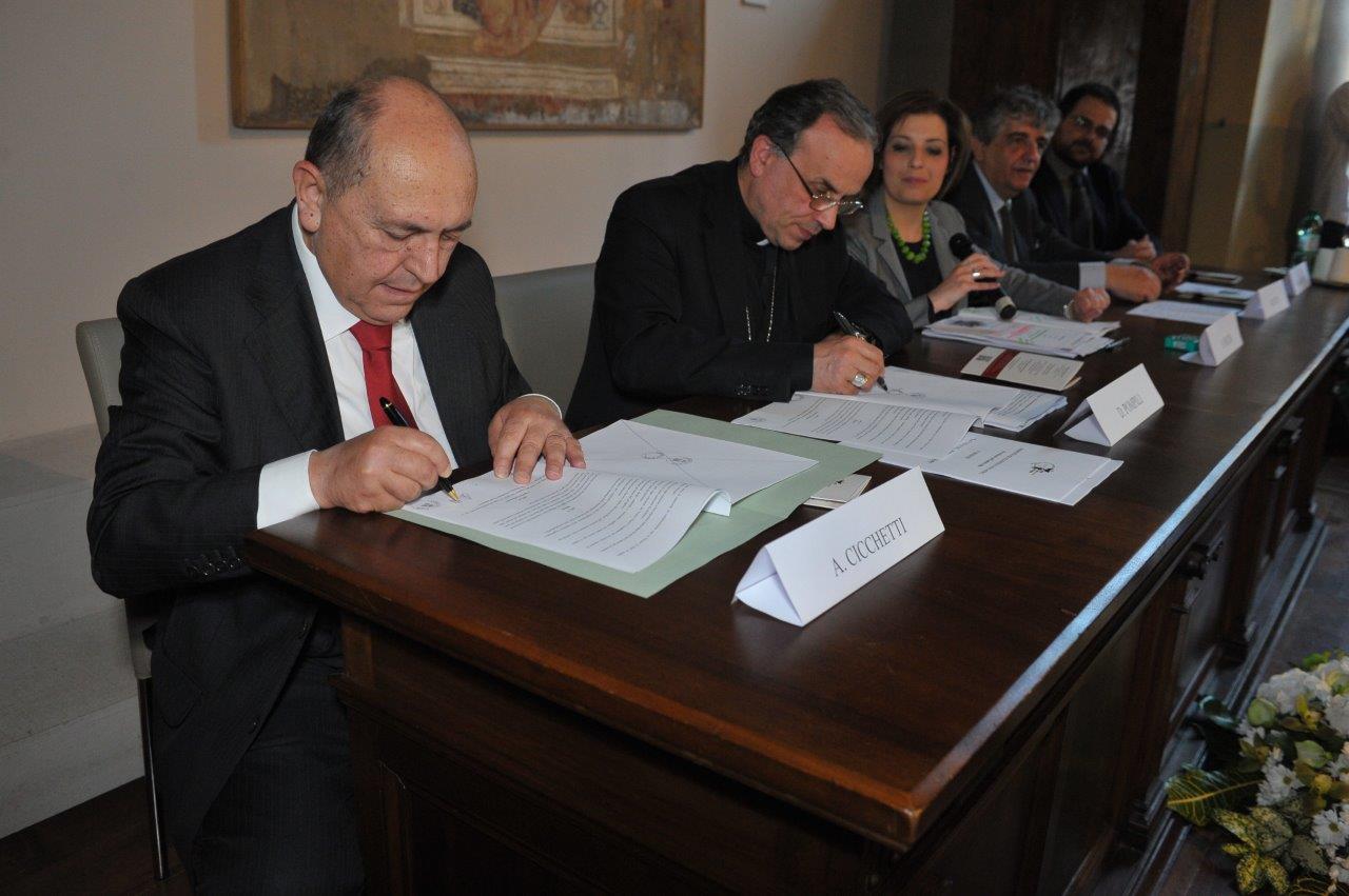 Prima della firma del protocollo che ha sancito l’accordo, anche la riflessione del sindaco di Rieti Antonio Cicchetti, che ha ribadito la volontà di sancire e sottoscrivere un accordo congiunto per portare avanti l’importante progetto di valorizzazione dell’intuizione di Francesco: «Da Rieti può partire un messaggio di serenità di rapporti, dobbiamo fare di questa città un punto di incontro distensivo. Noi siamo un esempio di come le civiltà possano essere compatibili, per guardare avanti insieme, perchè la pace non è solo frutto di buoni sentimenti e buone intenzioni, ma spesso è la risultante dell’assenza di interessi prevalenti che spingono verso la guerra: dobbiamo fare di questa città un punto di incontro distensivo, dove si possa guardare alla cultura degli altri con serenità. Quello che ci è mancato finora non sono solo le strade: ma dobbiamo ritrovare i motivi per venire a Rieti, per andare in un luogo che abbia un significato, che eserciti un richiamo. Noi vogliamo lavorare per questo».