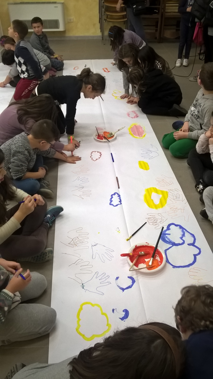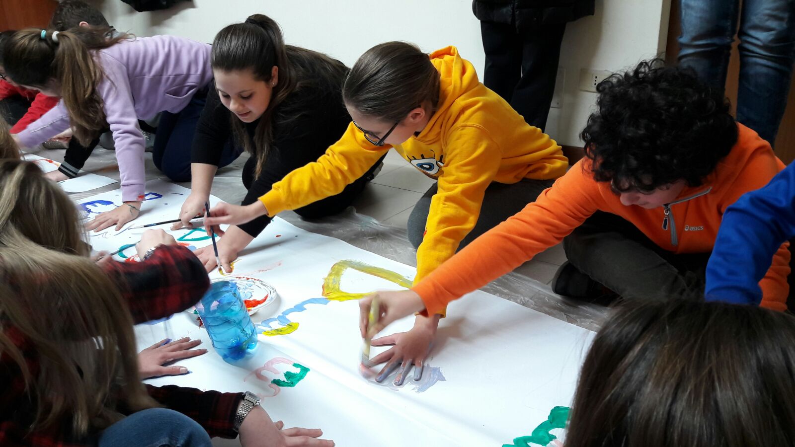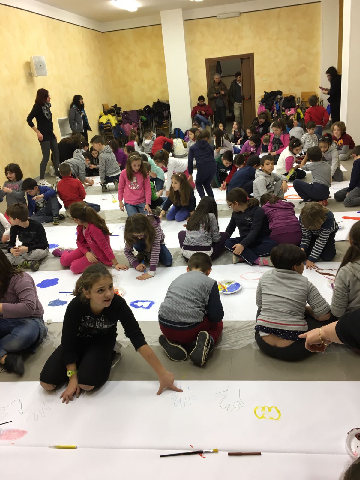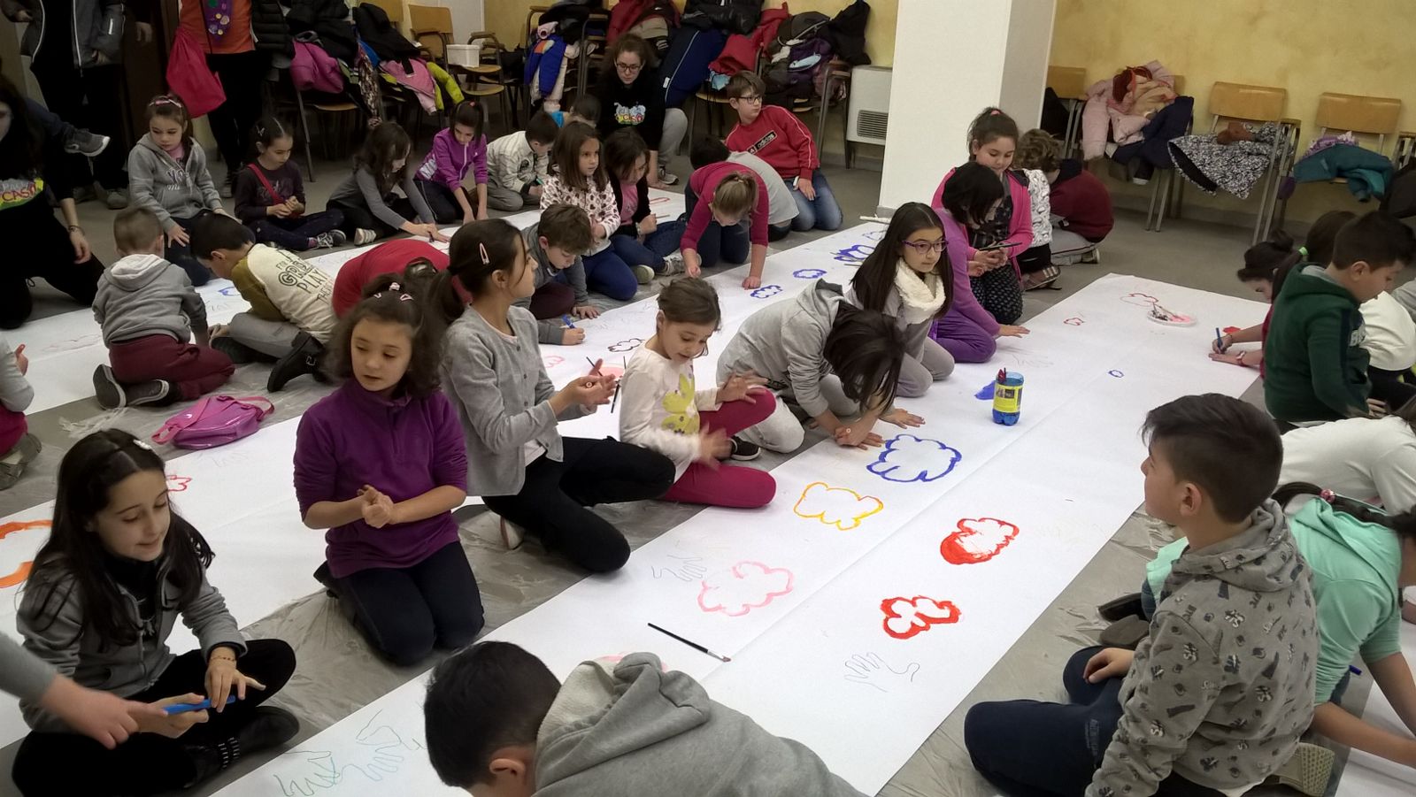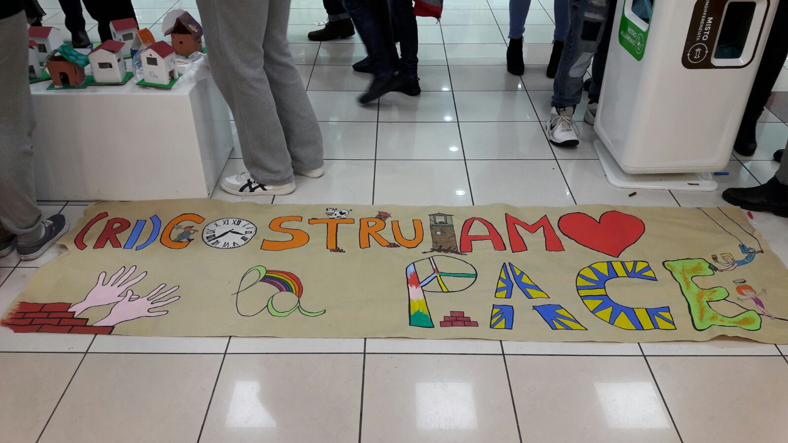 Suddivisi per fasce d’eta, i più giovani hanno verniciato una casa stilizzata (simbolo dell’armonia in famiglia), le proprie mani unite (richiamo all’armonia nei rapporti con gli altri) e una nuvoletta di fumetto-sogno (a simboleggiare l’impegno di realizzare un futuro di pace).