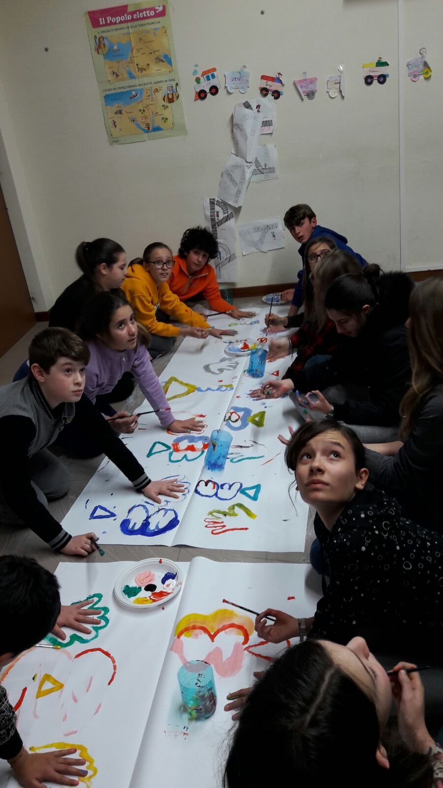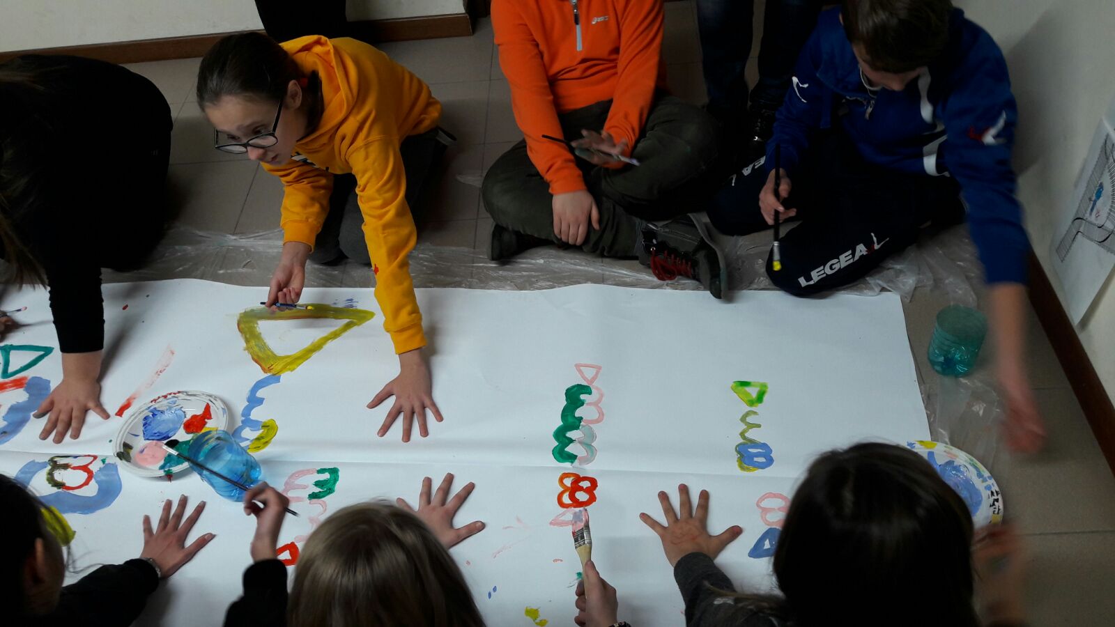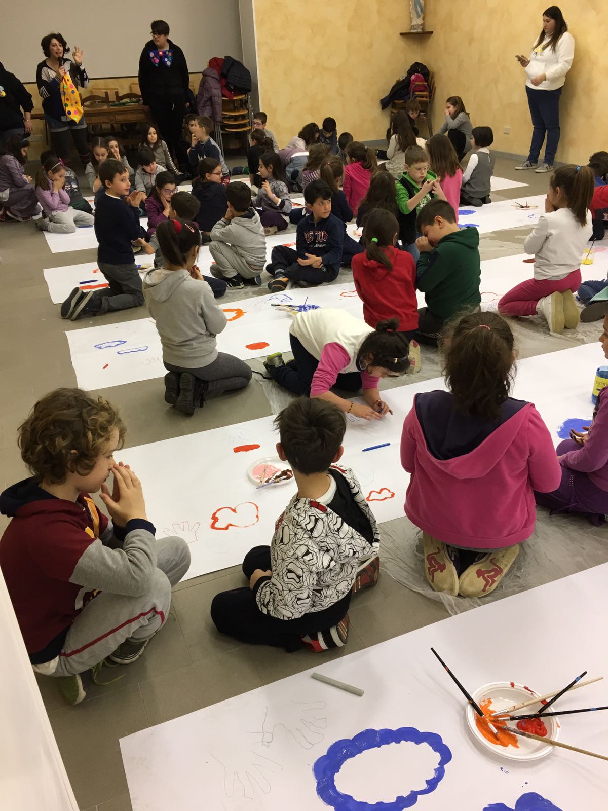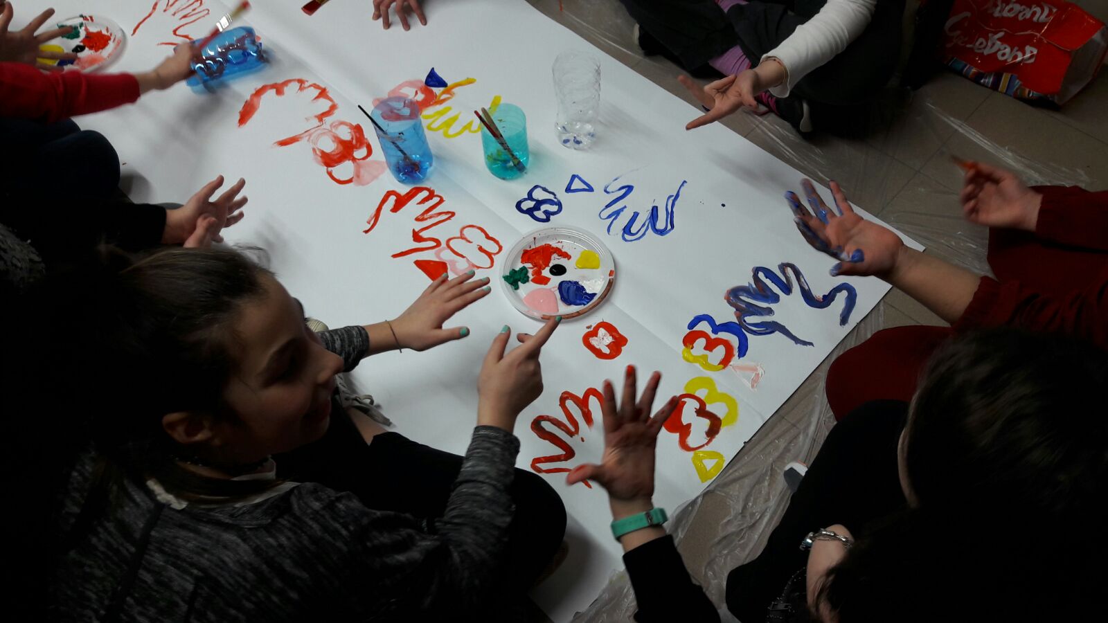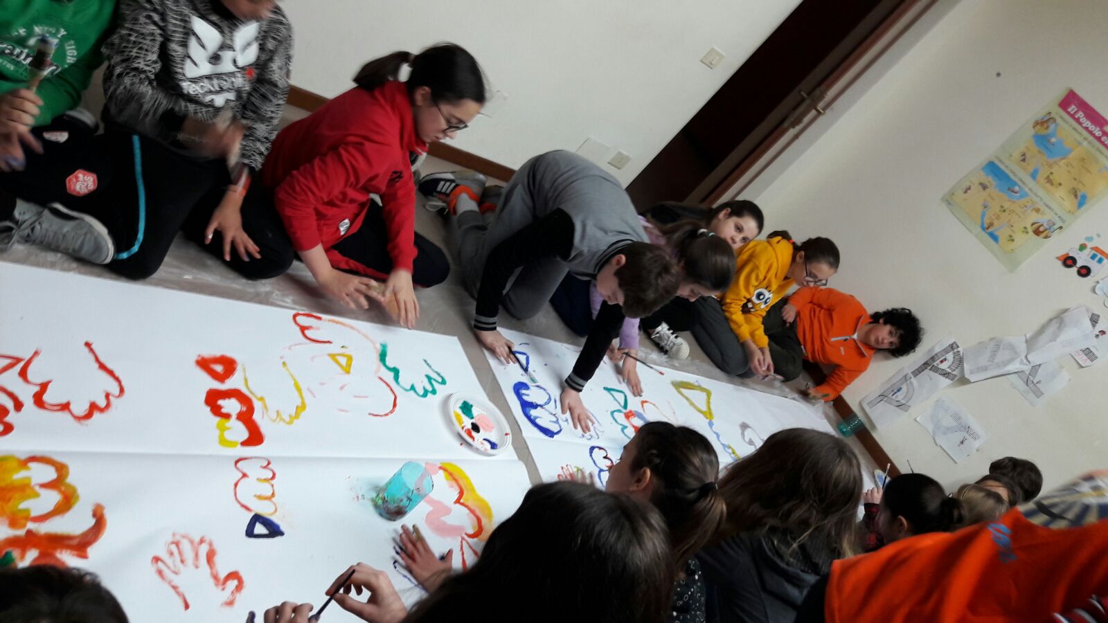 Suddivisi per fasce d’eta, i più giovani hanno verniciato una casa stilizzata (simbolo dell’armonia in famiglia), le proprie mani unite (richiamo all’armonia nei rapporti con gli altri) e una nuvoletta di fumetto-sogno (a simboleggiare l’impegno di realizzare un futuro di pace).