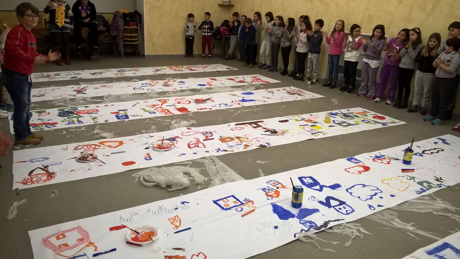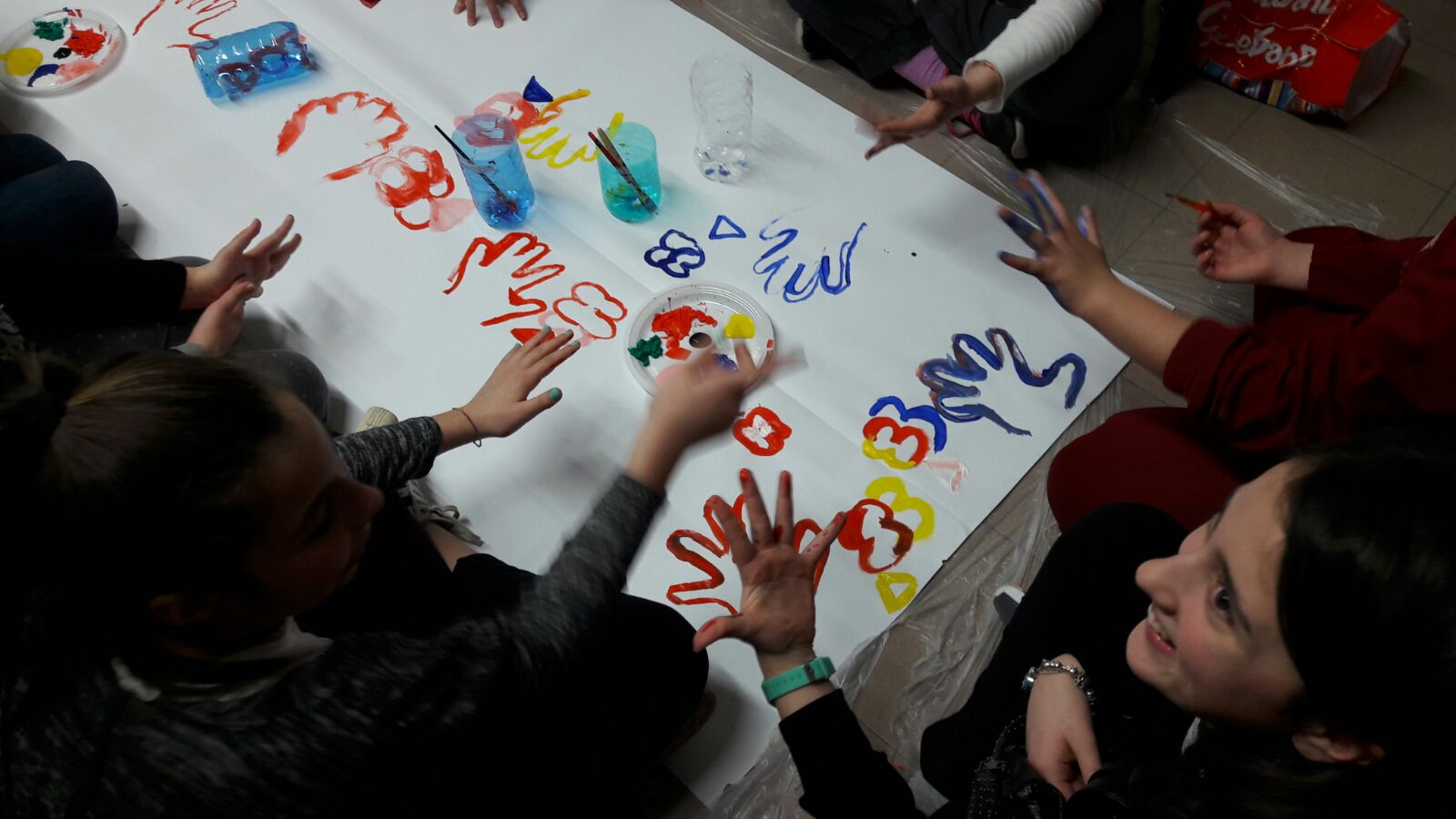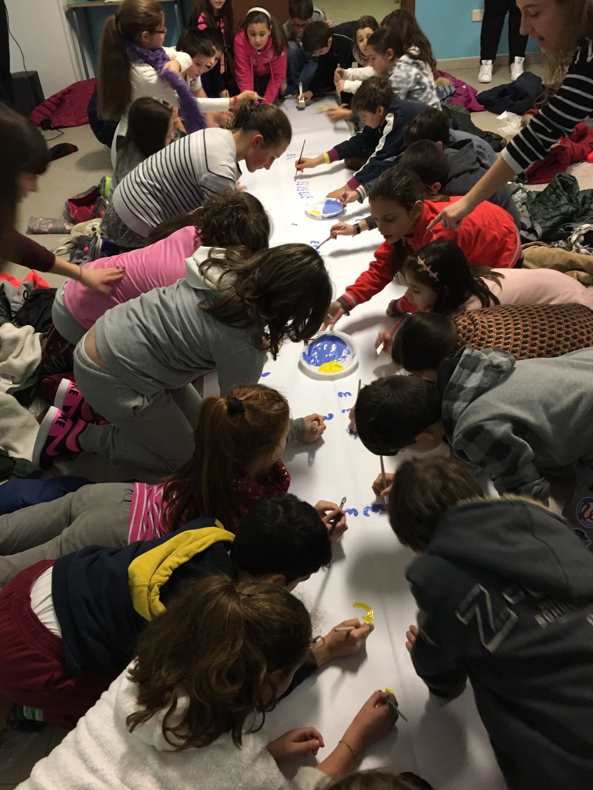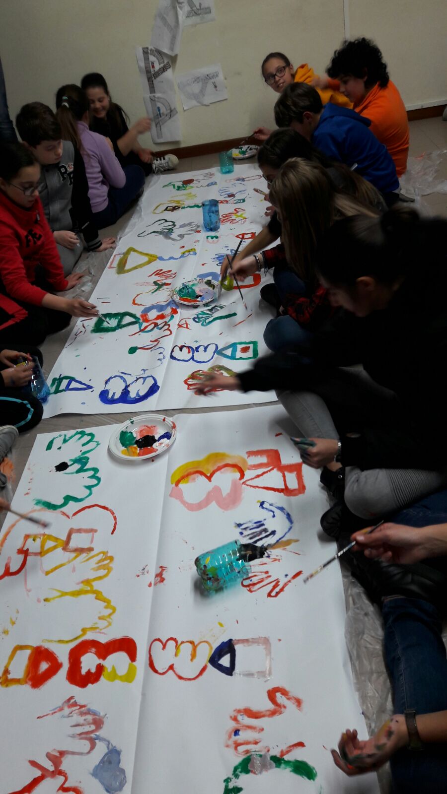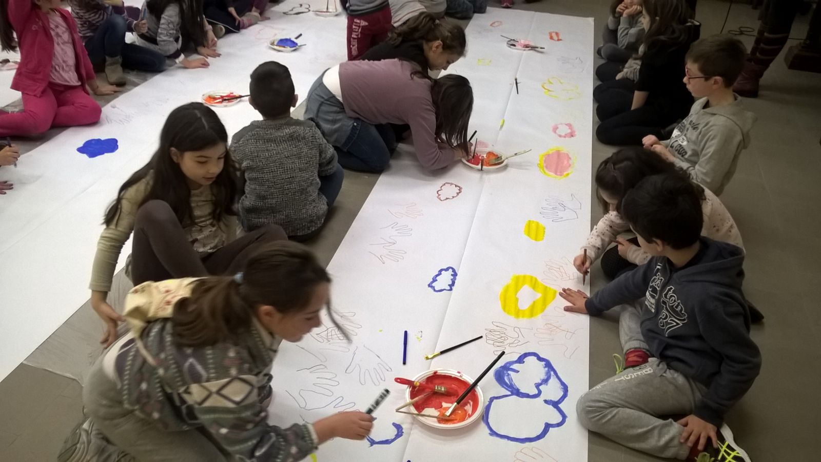 Suddivisi per fasce d’eta, i più giovani hanno verniciato una casa stilizzata (simbolo dell’armonia in famiglia), le proprie mani unite (richiamo all’armonia nei rapporti con gli altri) e una nuvoletta di fumetto-sogno (a simboleggiare l’impegno di realizzare un futuro di pace).