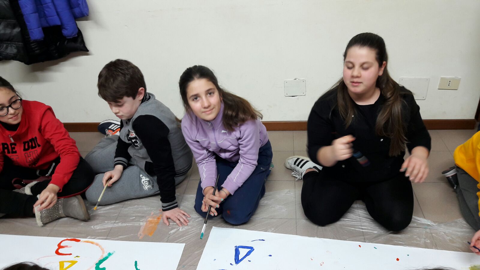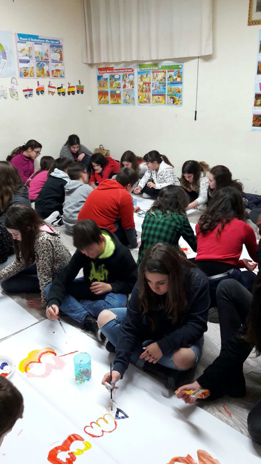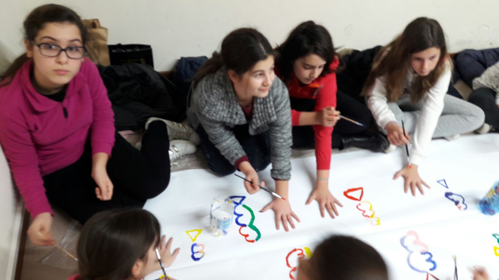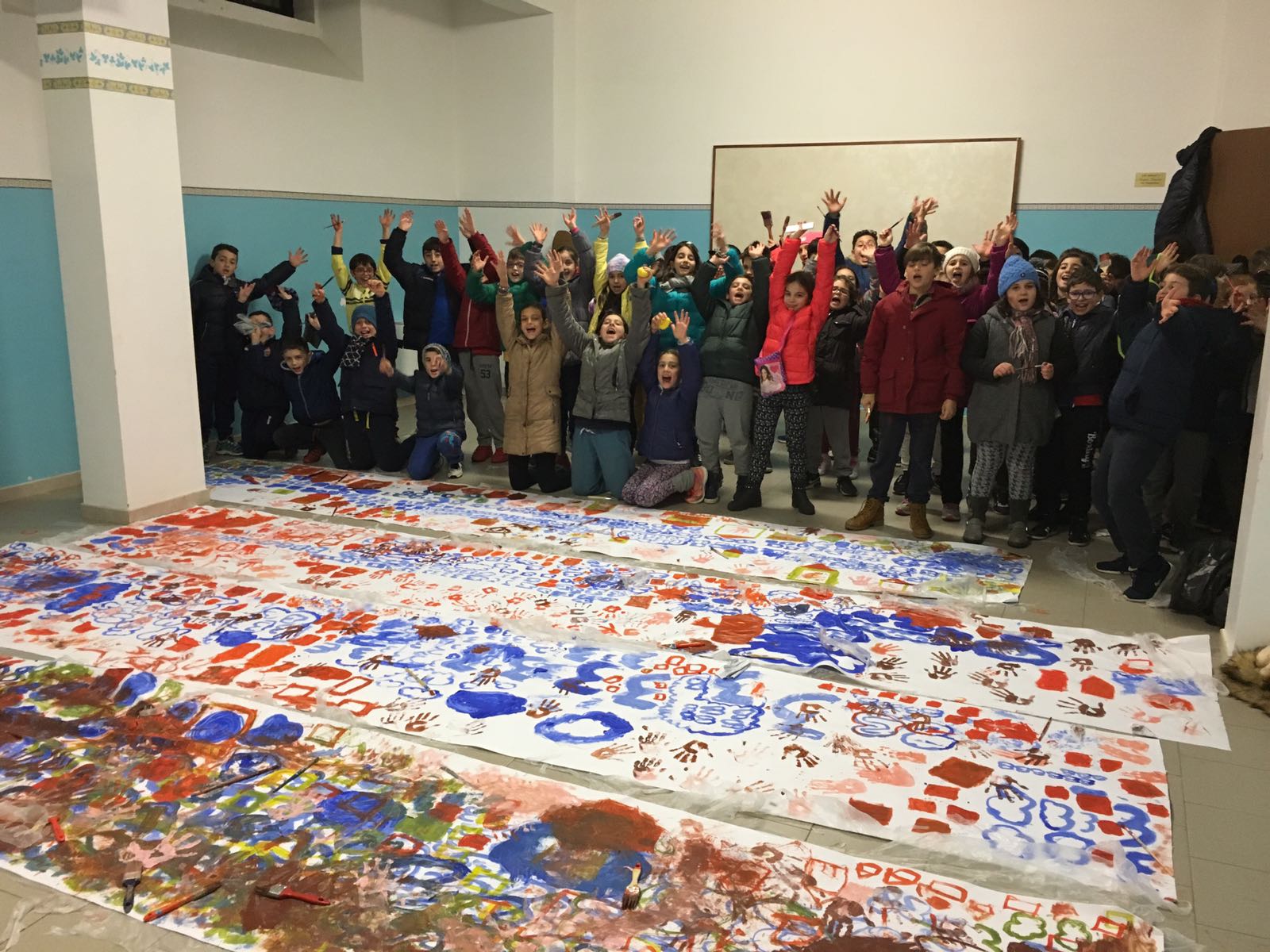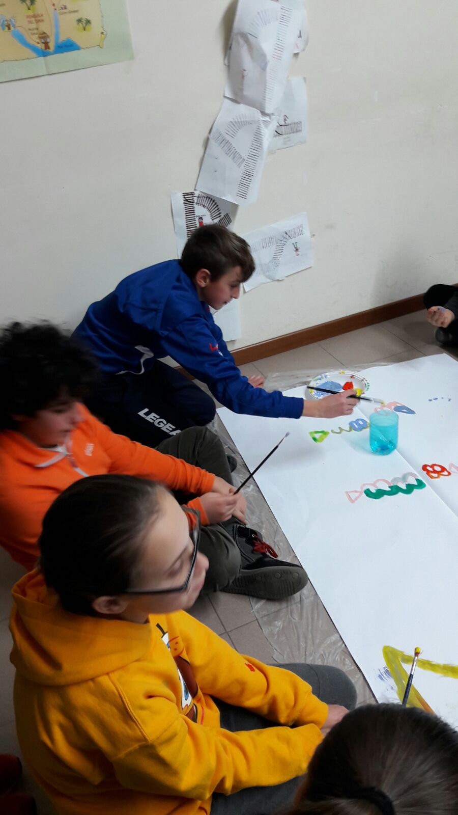Suddivisi per fasce d’eta, i più giovani hanno verniciato una casa stilizzata (simbolo dell’armonia in famiglia), le proprie mani unite (richiamo all’armonia nei rapporti con gli altri) e una nuvoletta di fumetto-sogno (a simboleggiare l’impegno di realizzare un futuro di pace).