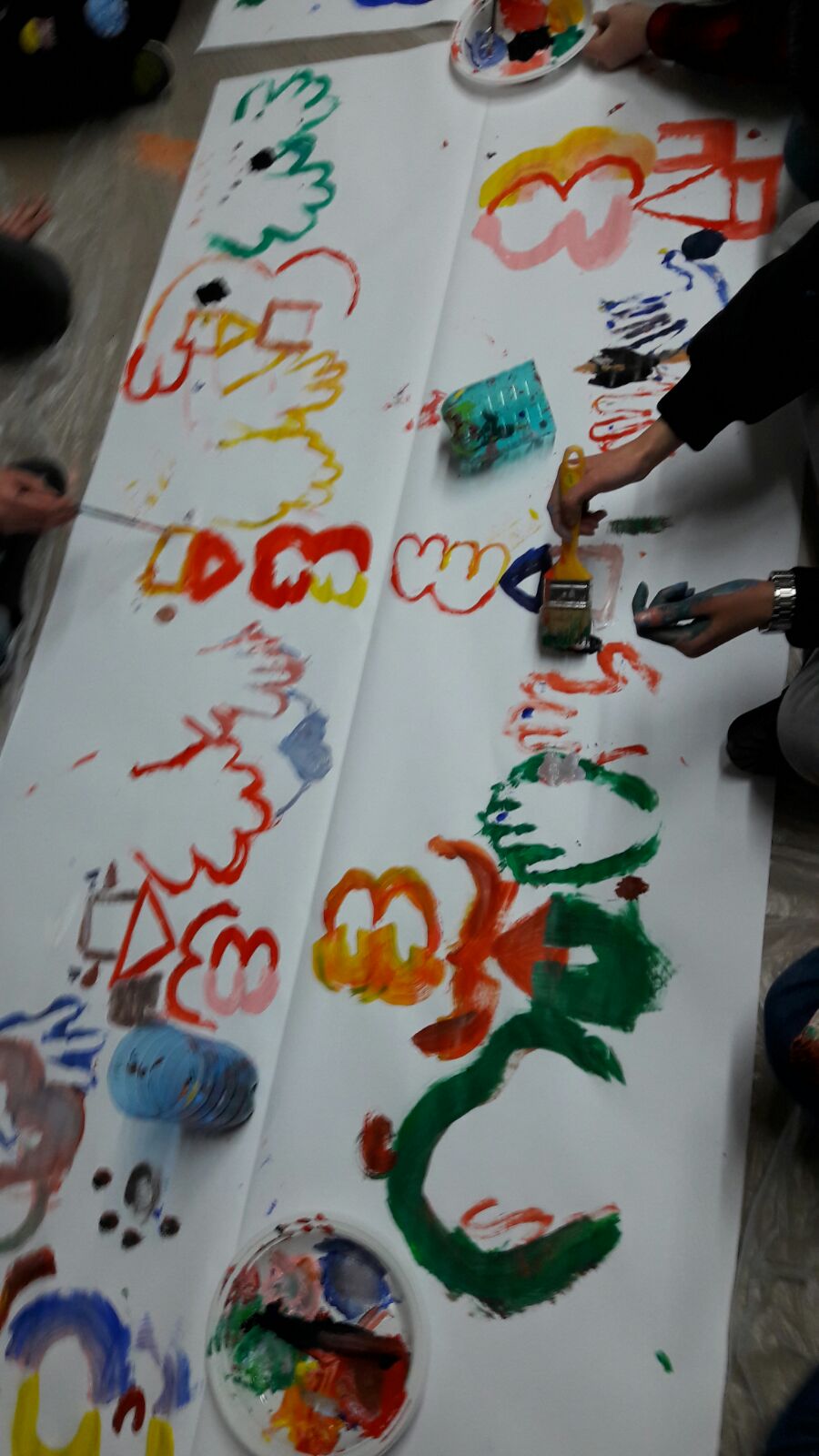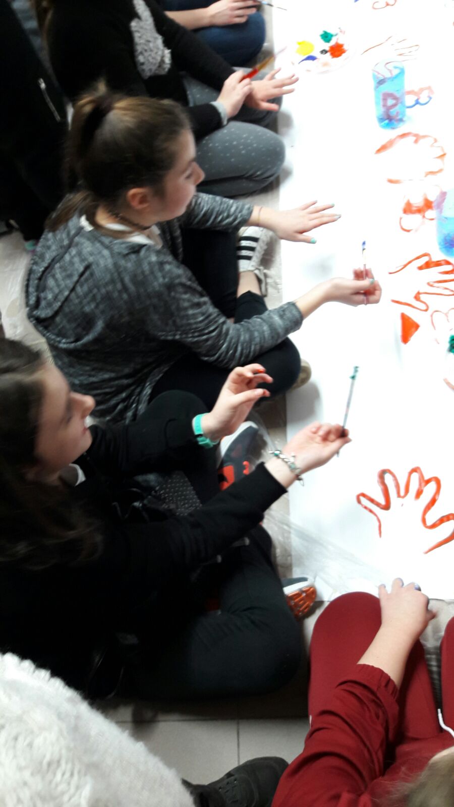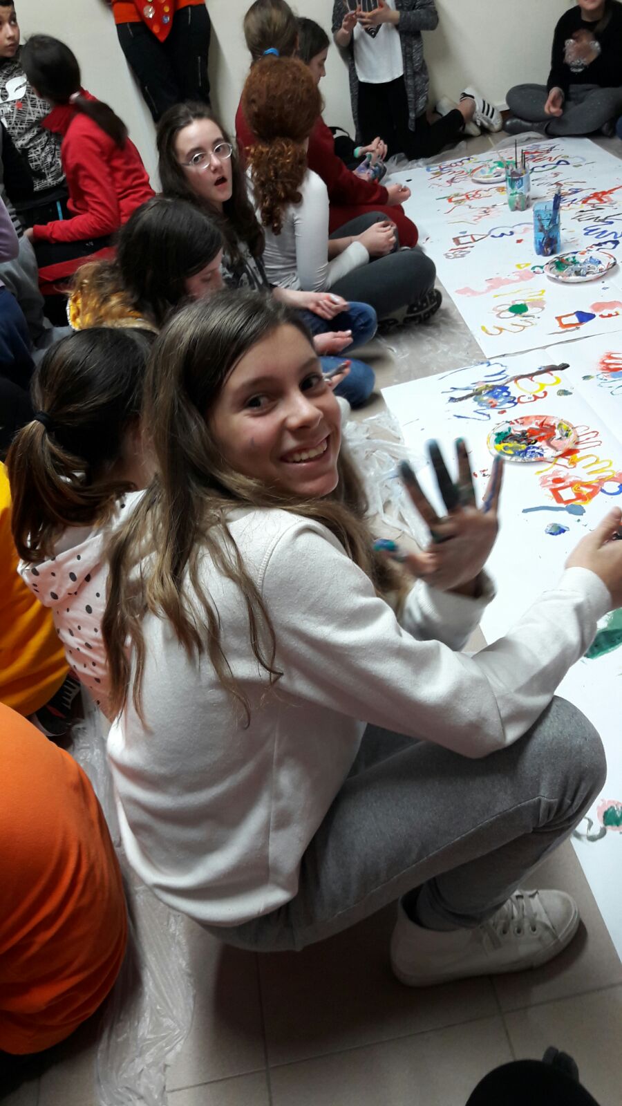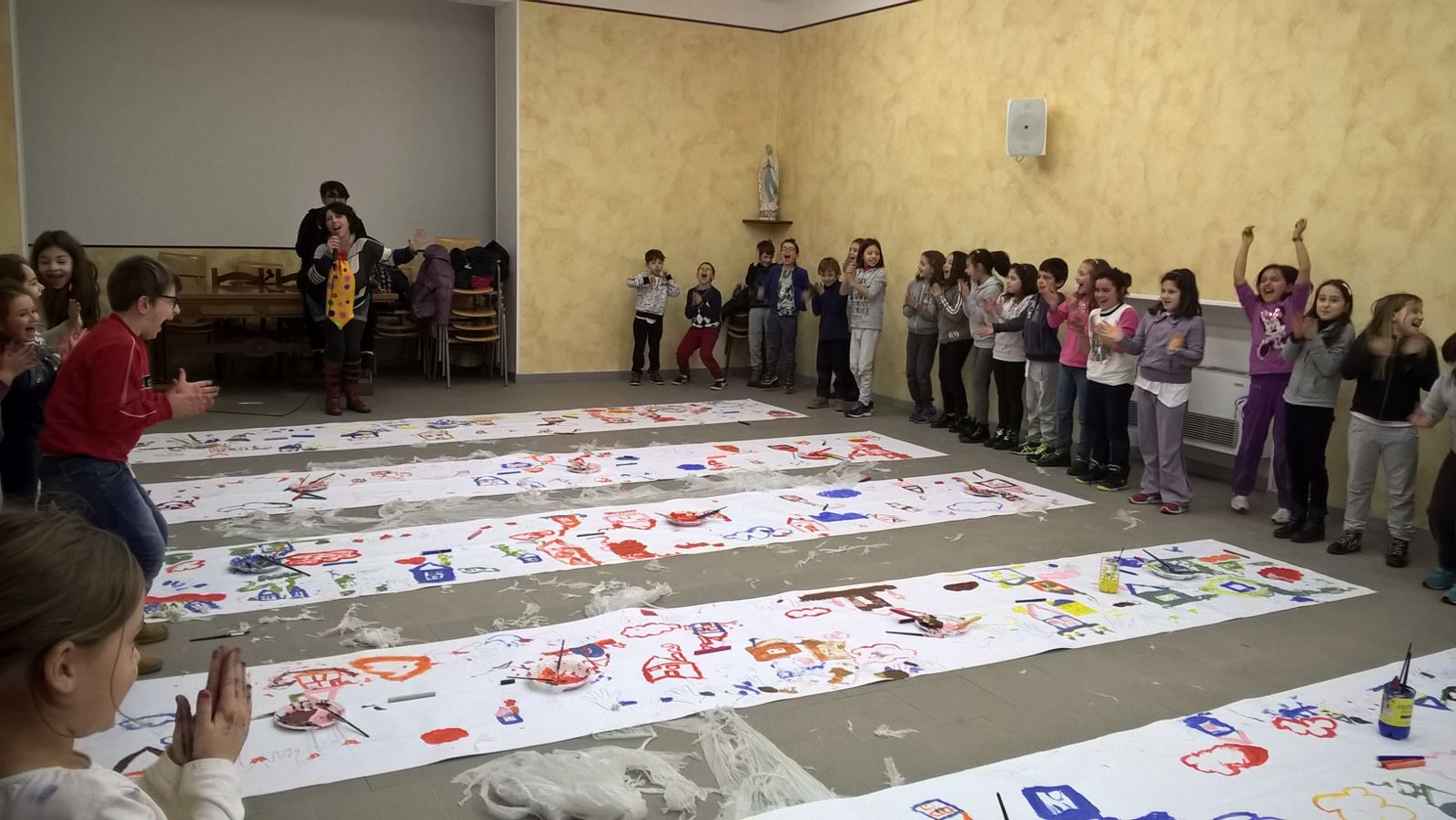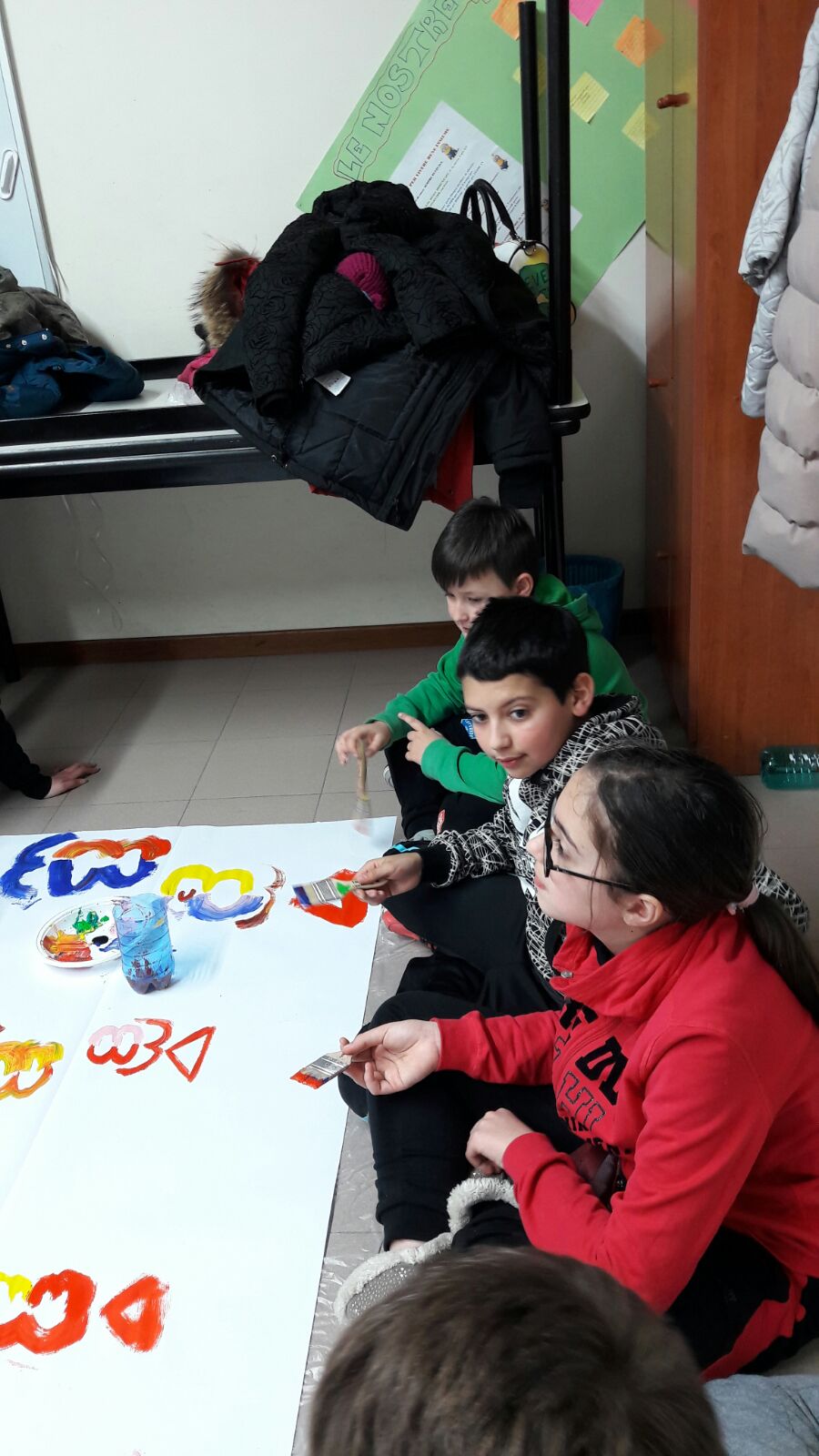 Suddivisi per fasce d’eta, i più giovani hanno verniciato una casa stilizzata (simbolo dell’armonia in famiglia), le proprie mani unite (richiamo all’armonia nei rapporti con gli altri) e una nuvoletta di fumetto-sogno (a simboleggiare l’impegno di realizzare un futuro di pace).