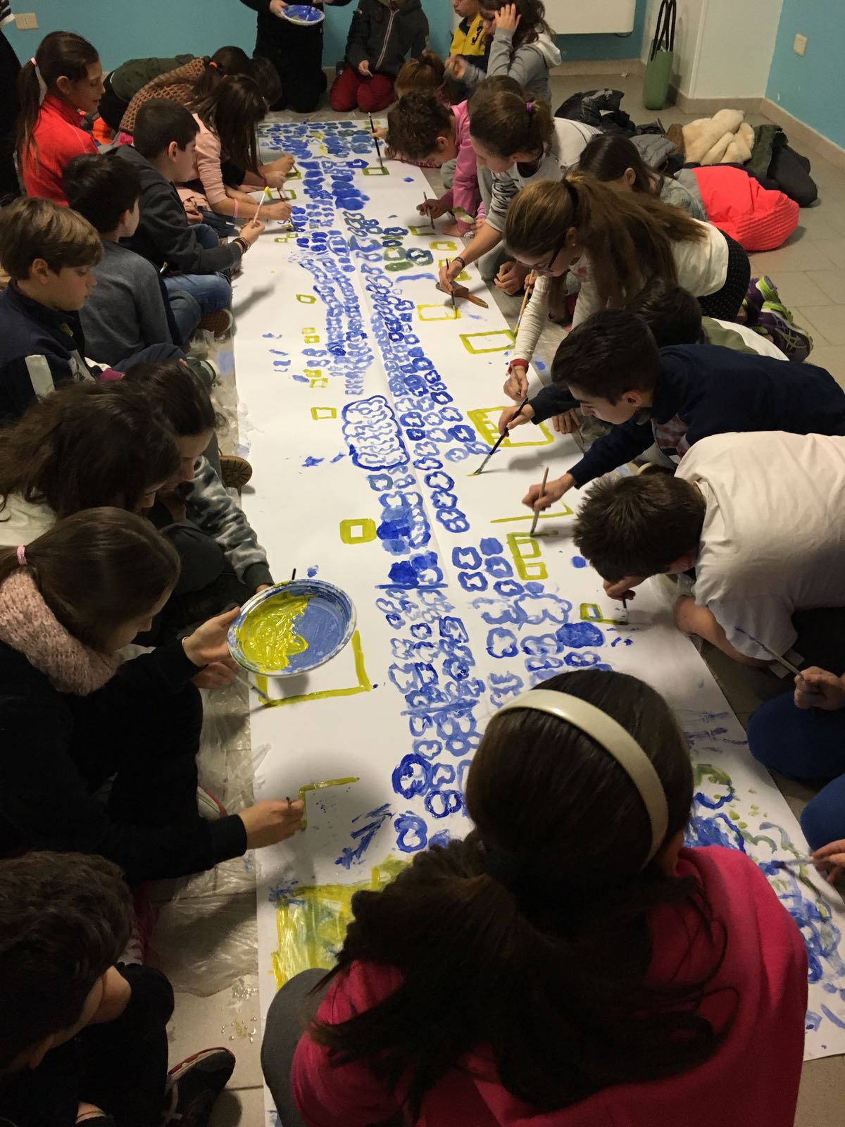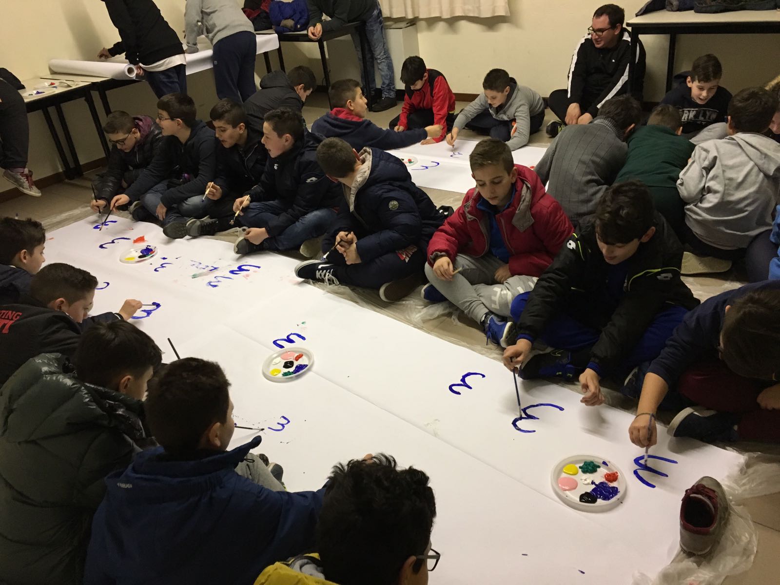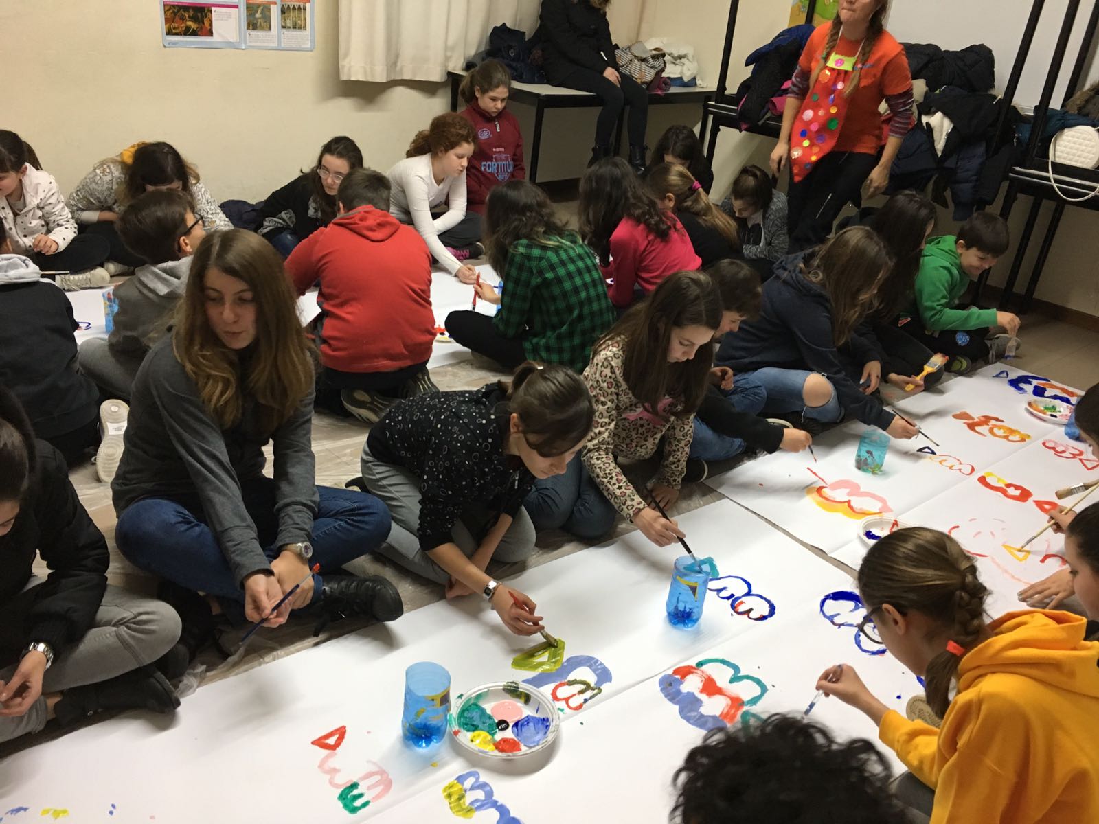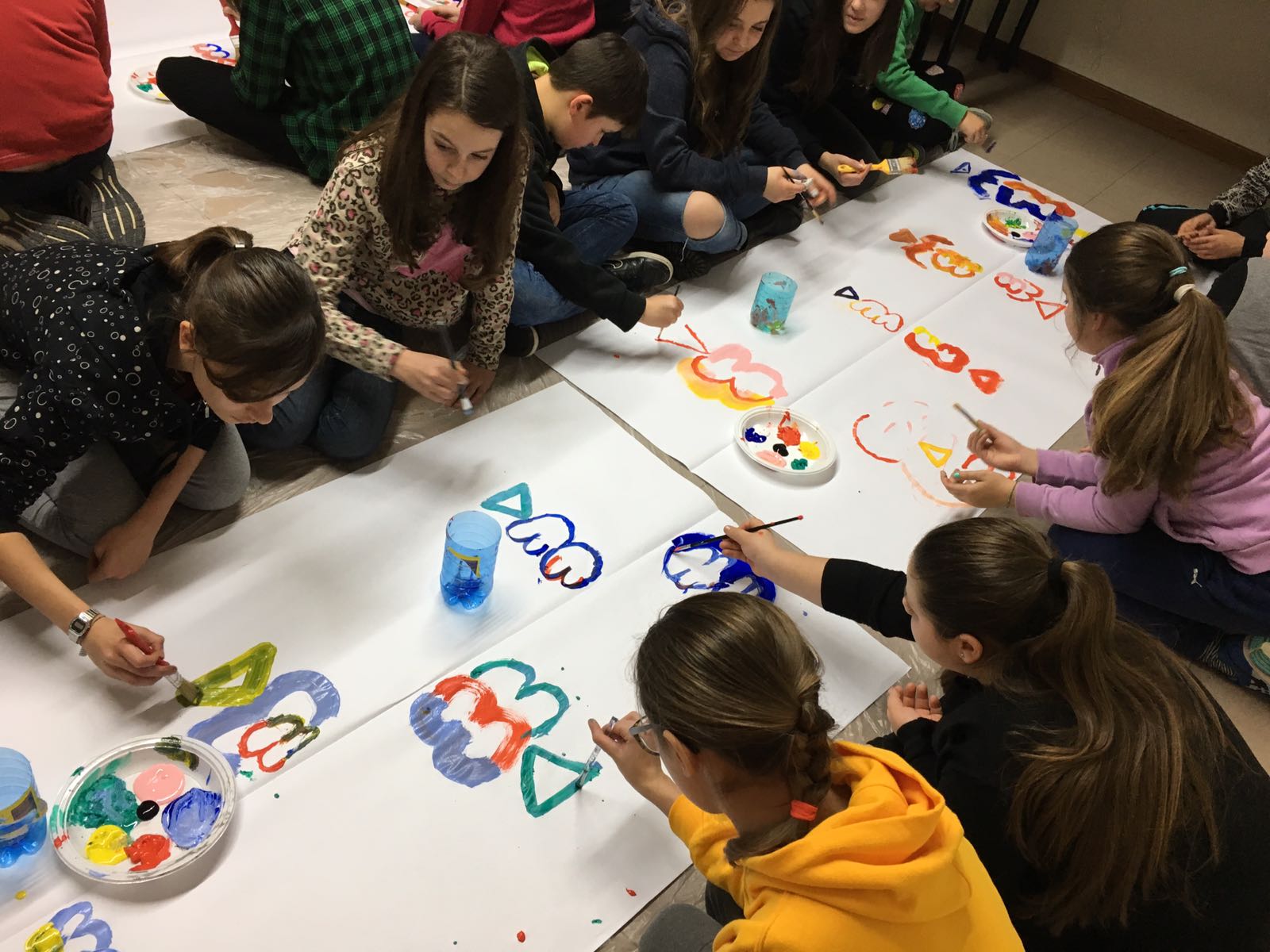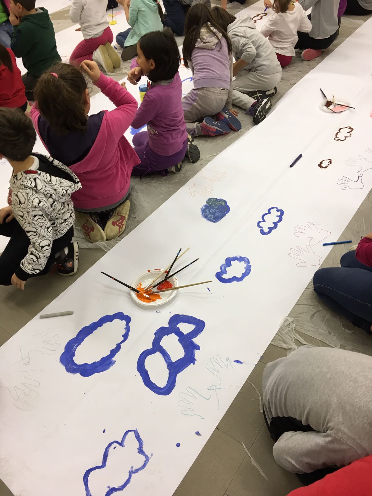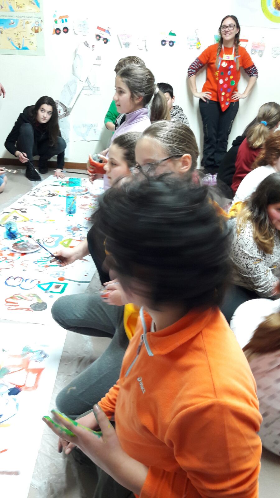 Suddivisi per fasce d’eta, i più giovani hanno verniciato una casa stilizzata (simbolo dell’armonia in famiglia), le proprie mani unite (richiamo all’armonia nei rapporti con gli altri) e una nuvoletta di fumetto-sogno (a simboleggiare l’impegno di realizzare un futuro di pace).