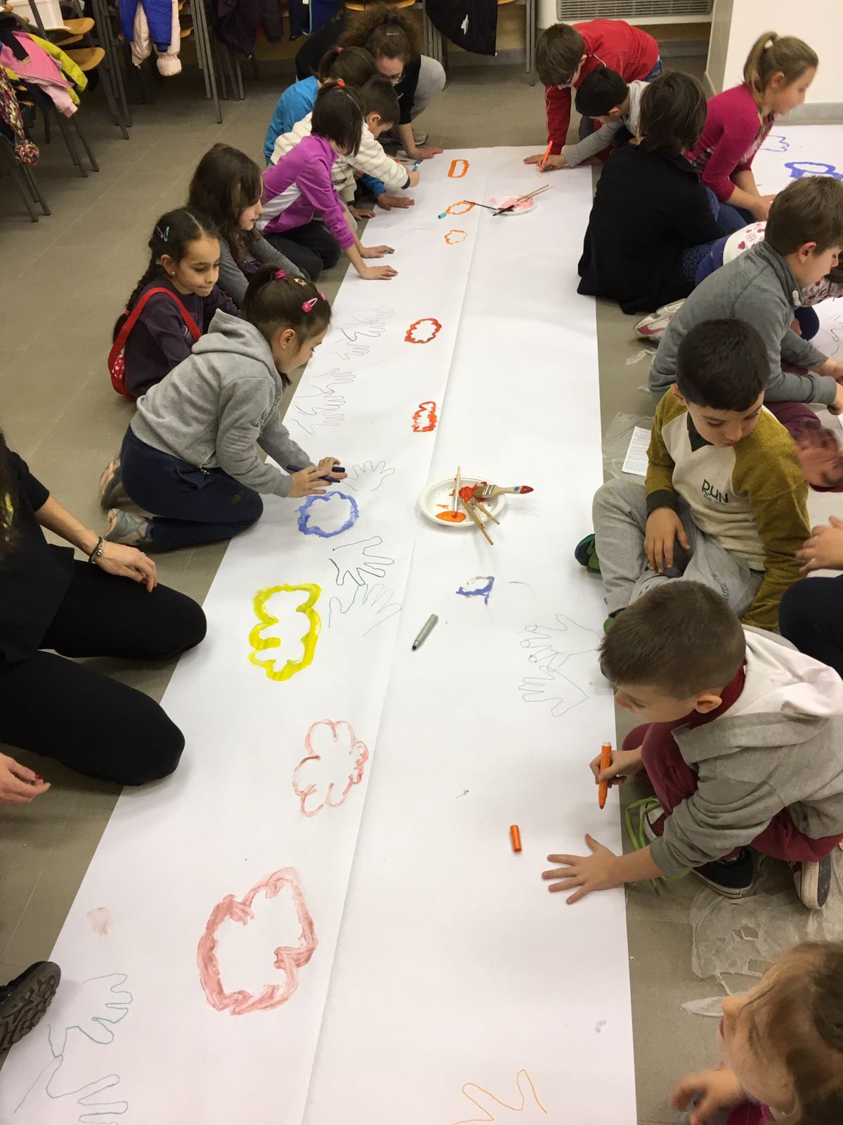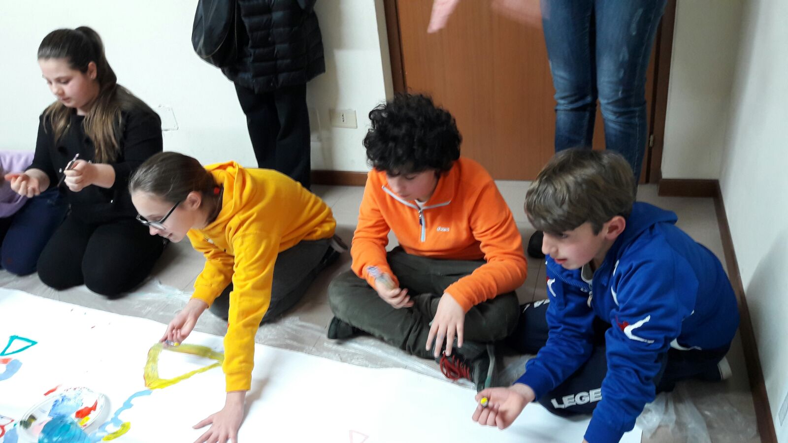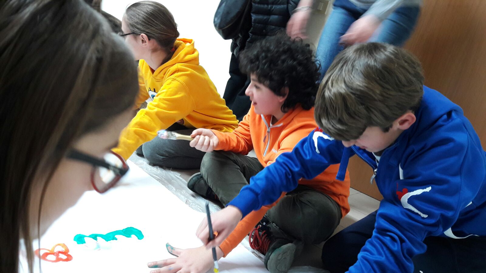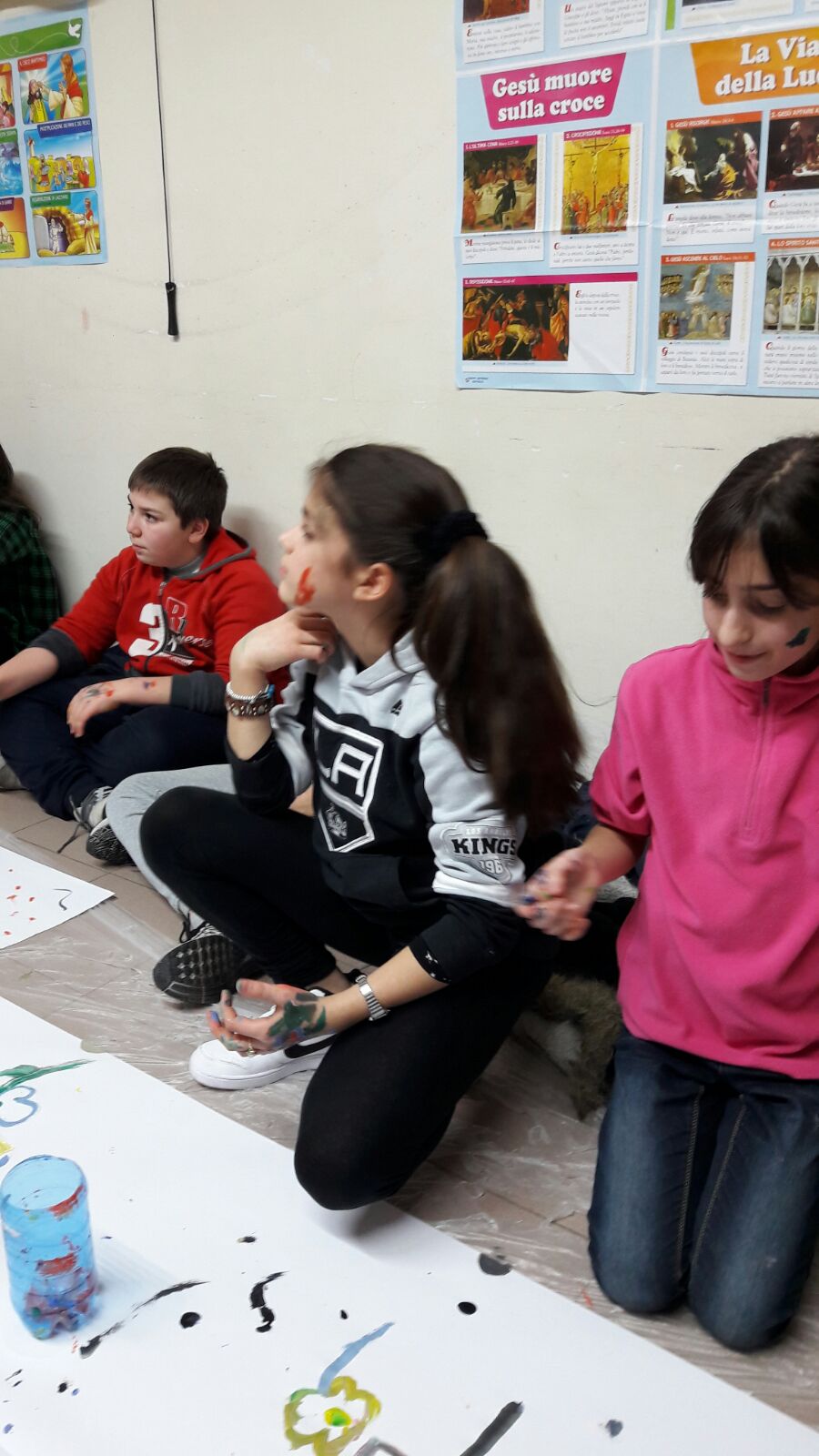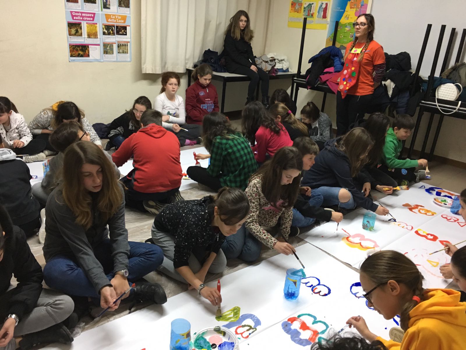 Suddivisi per fasce d’eta, i più giovani hanno verniciato una casa stilizzata (simbolo dell’armonia in famiglia), le proprie mani unite (richiamo all’armonia nei rapporti con gli altri) e una nuvoletta di fumetto-sogno (a simboleggiare l’impegno di realizzare un futuro di pace).