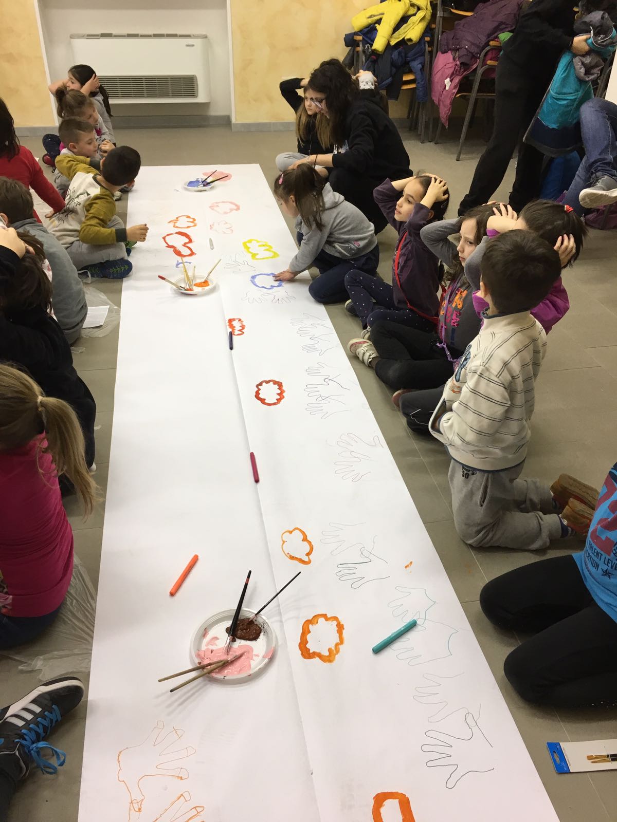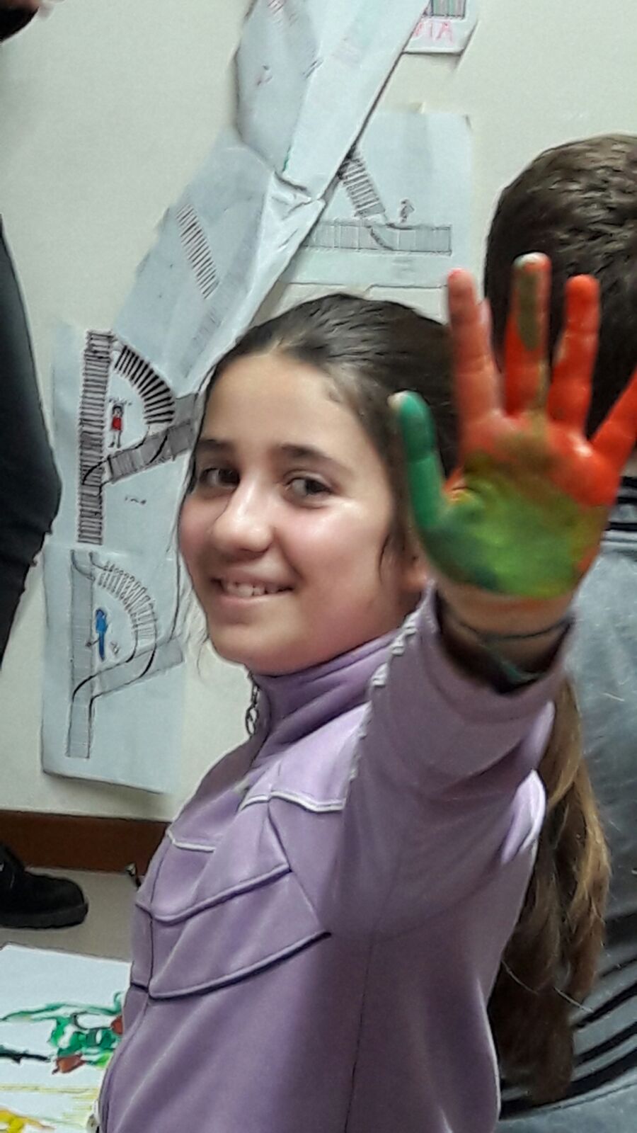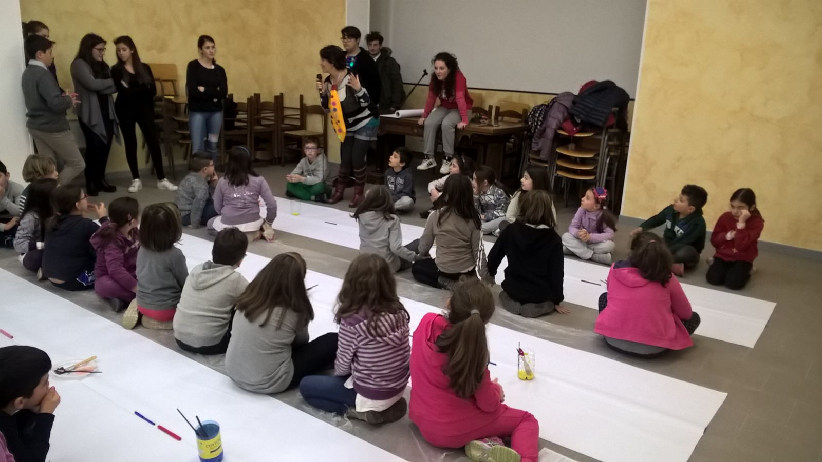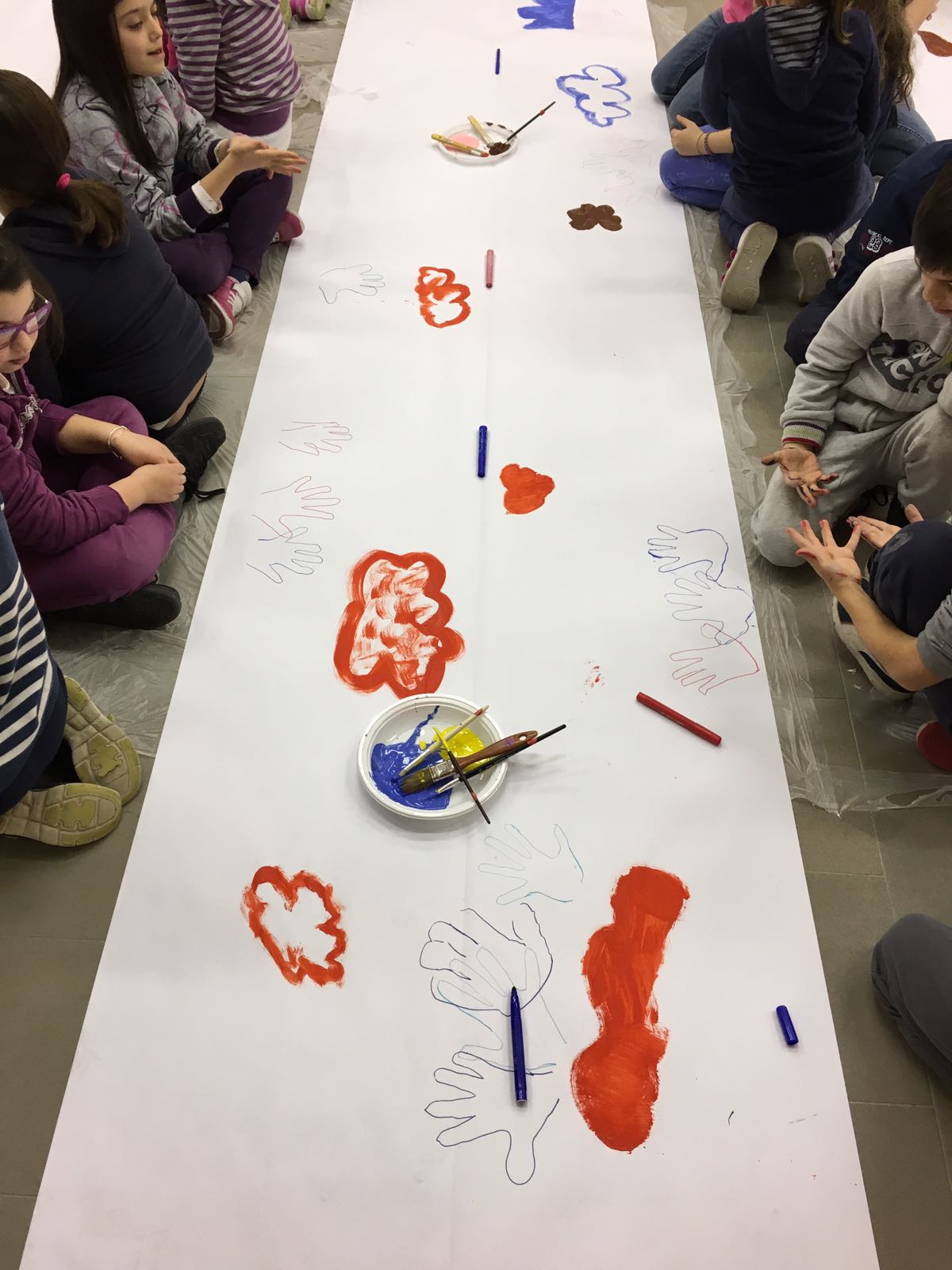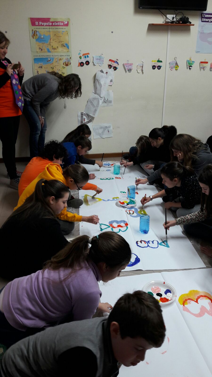 Suddivisi per fasce d’eta, i più giovani hanno verniciato una casa stilizzata (simbolo dell’armonia in famiglia), le proprie mani unite (richiamo all’armonia nei rapporti con gli altri) e una nuvoletta di fumetto-sogno (a simboleggiare l’impegno di realizzare un futuro di pace).