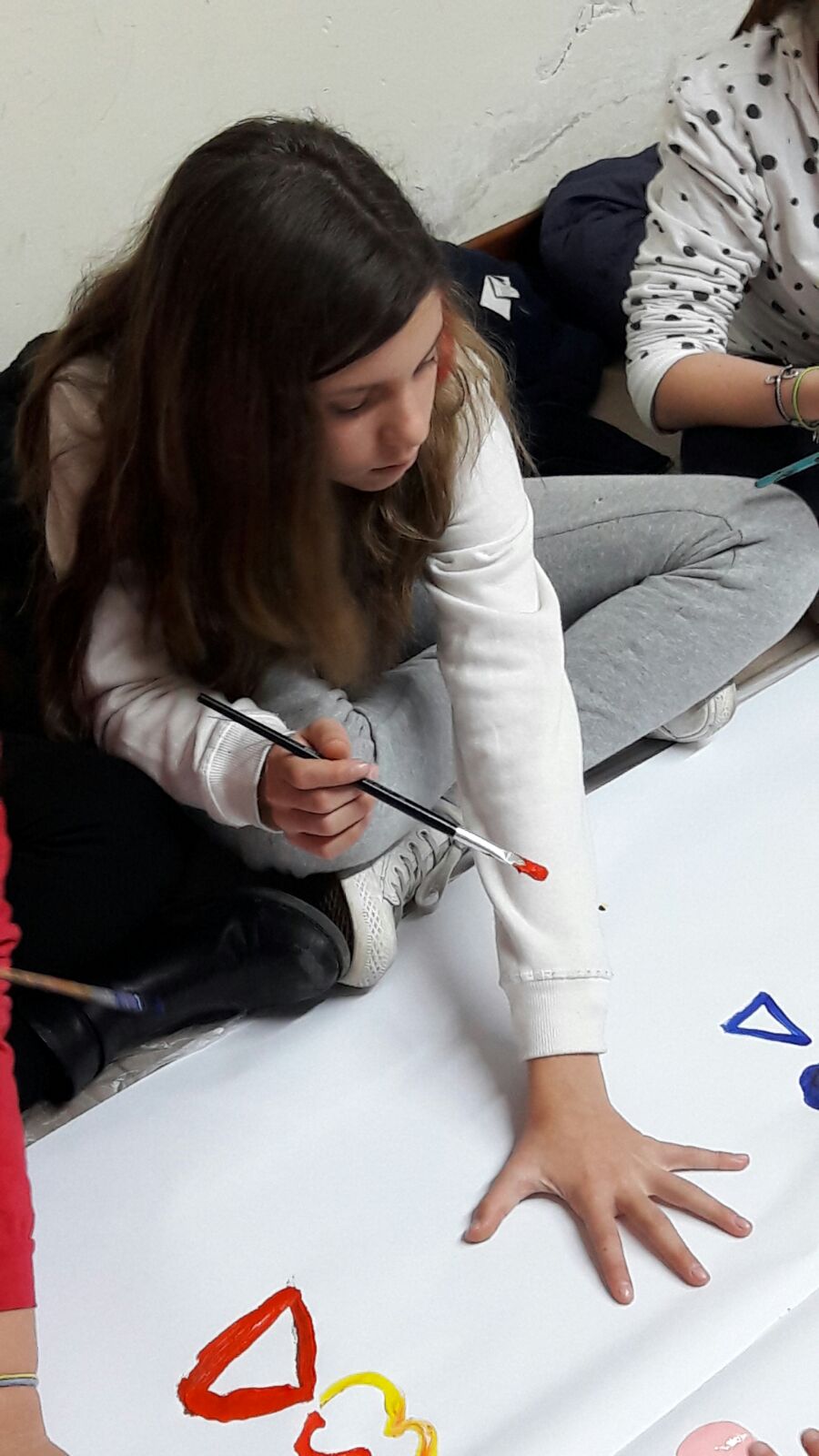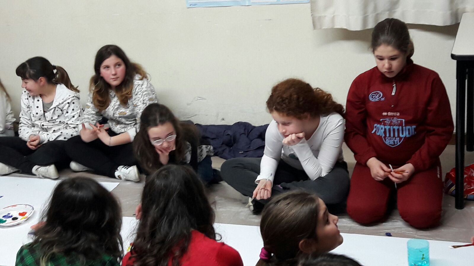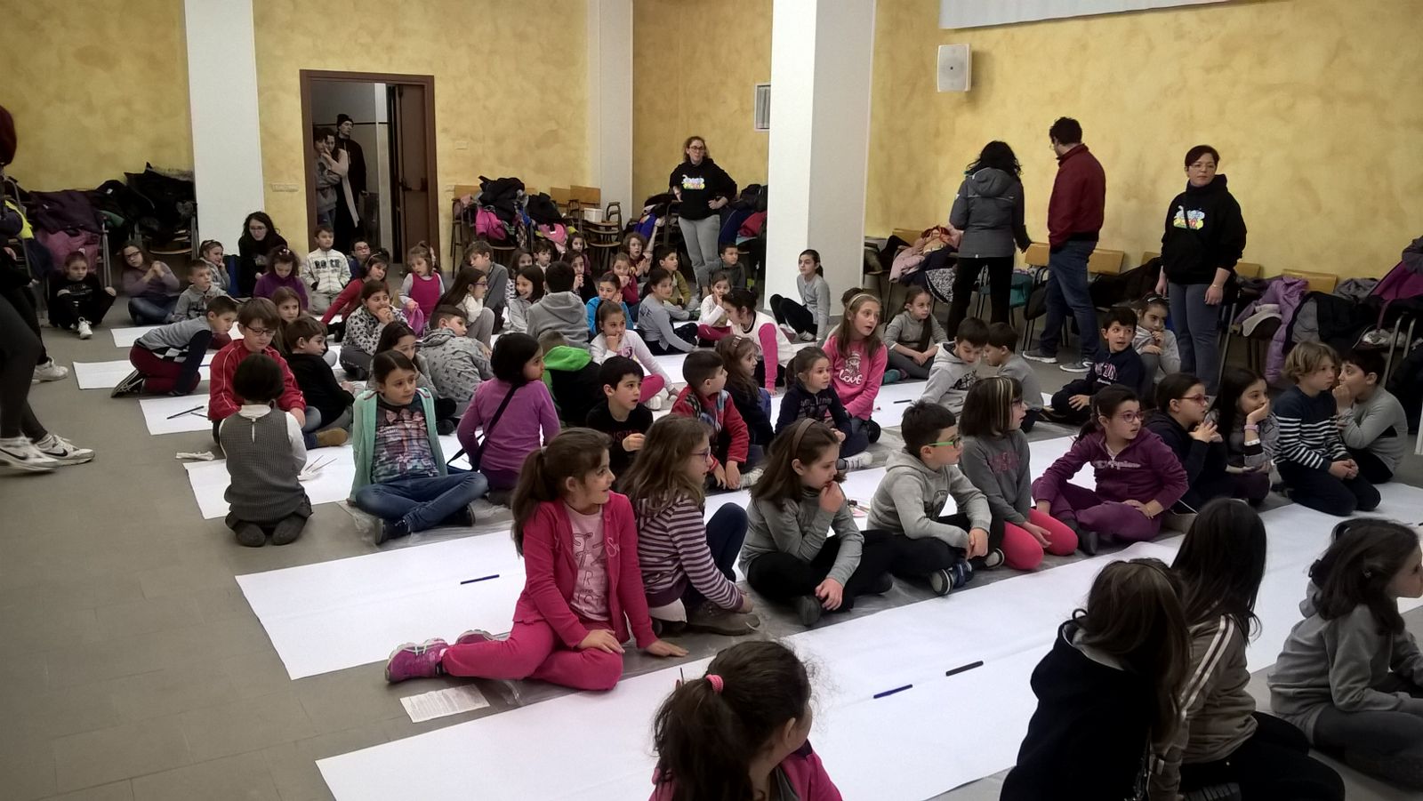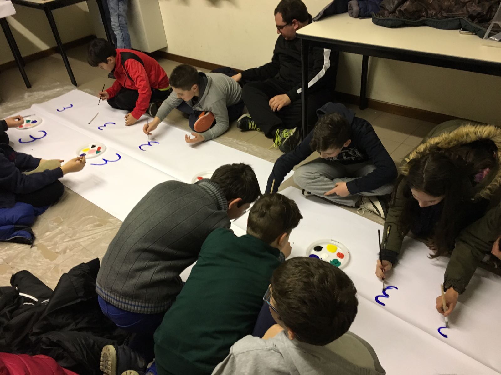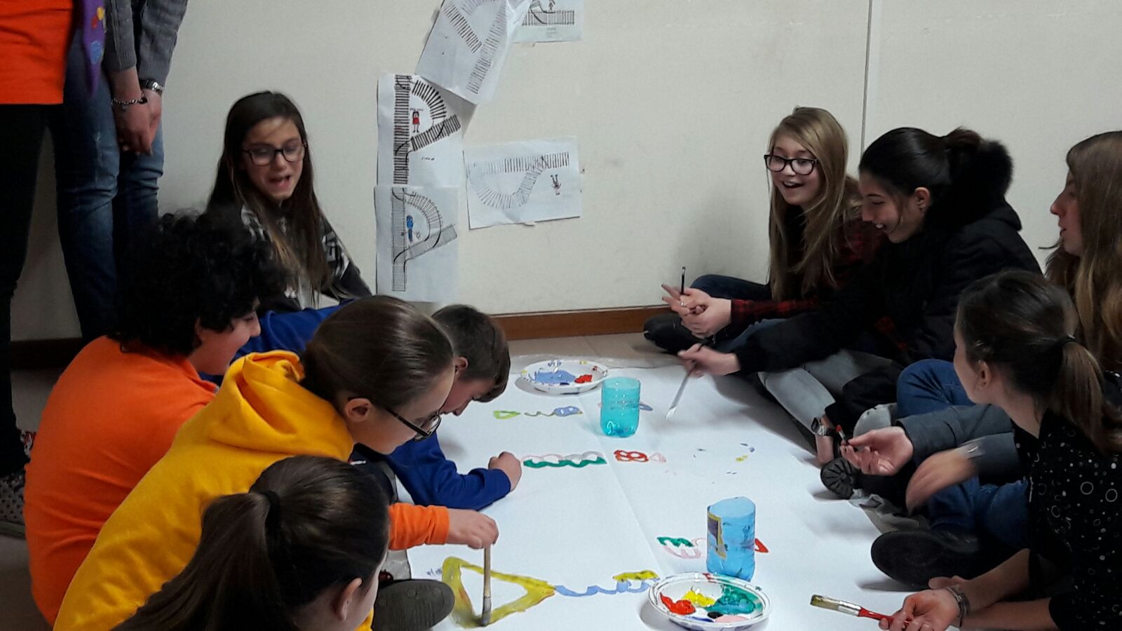 Suddivisi per fasce d’eta, i più giovani hanno verniciato una casa stilizzata (simbolo dell’armonia in famiglia), le proprie mani unite (richiamo all’armonia nei rapporti con gli altri) e una nuvoletta di fumetto-sogno (a simboleggiare l’impegno di realizzare un futuro di pace).