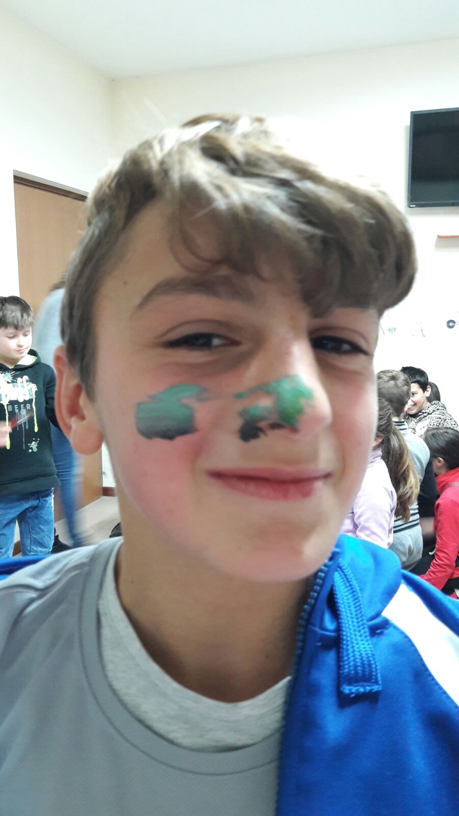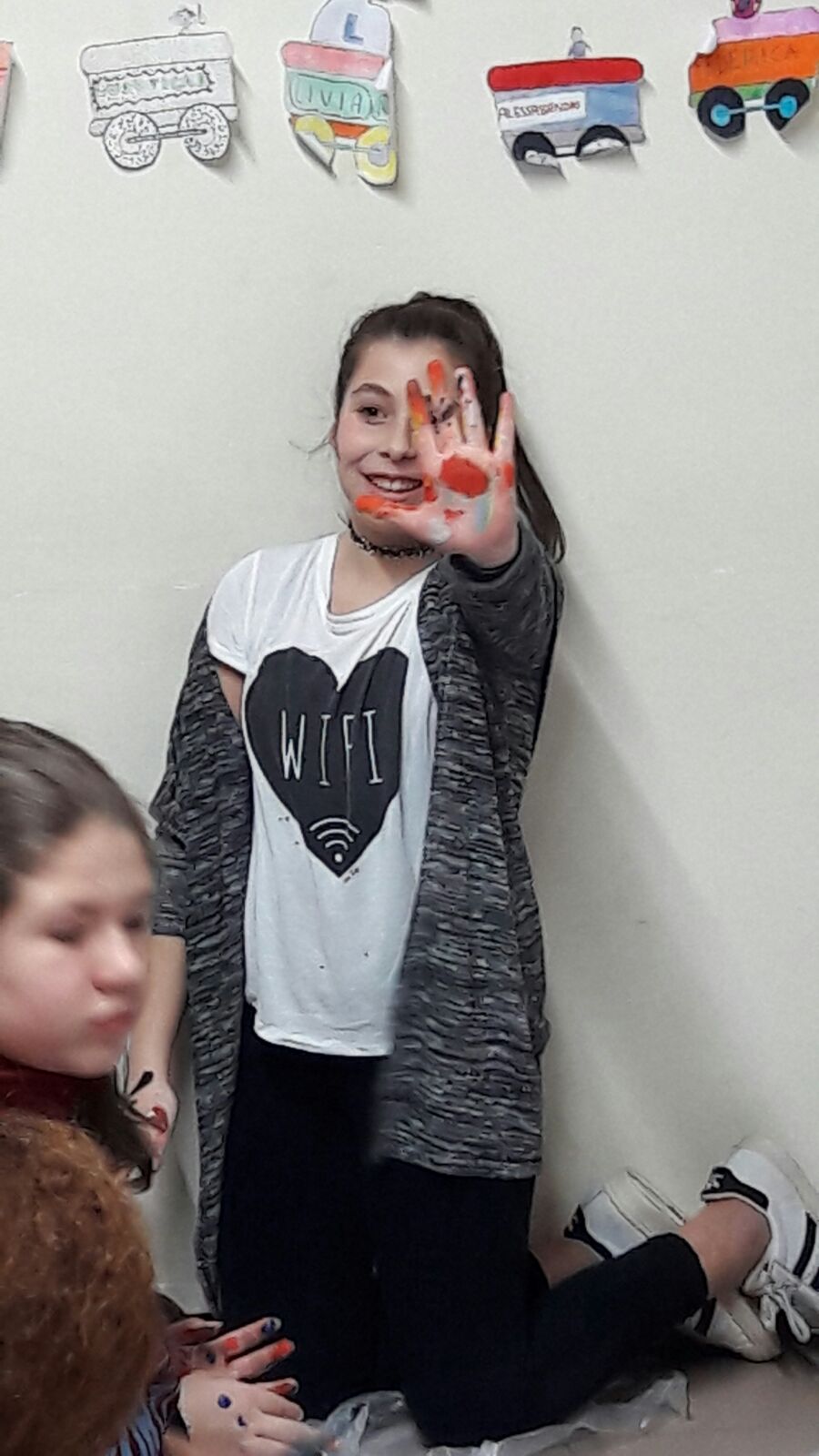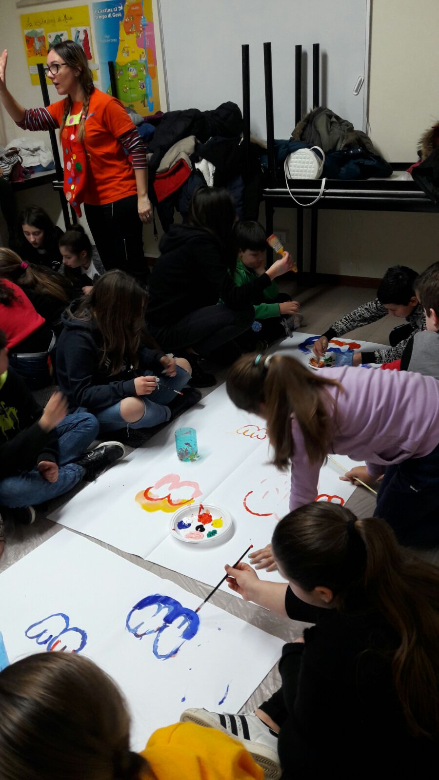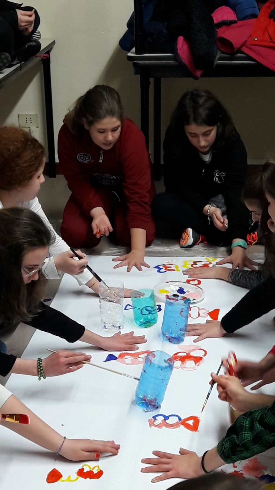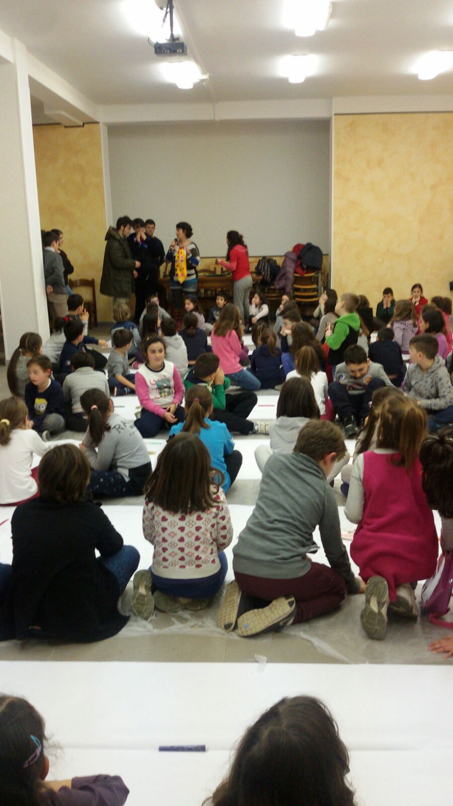 Suddivisi per fasce d’eta, i più giovani hanno verniciato una casa stilizzata (simbolo dell’armonia in famiglia), le proprie mani unite (richiamo all’armonia nei rapporti con gli altri) e una nuvoletta di fumetto-sogno (a simboleggiare l’impegno di realizzare un futuro di pace).