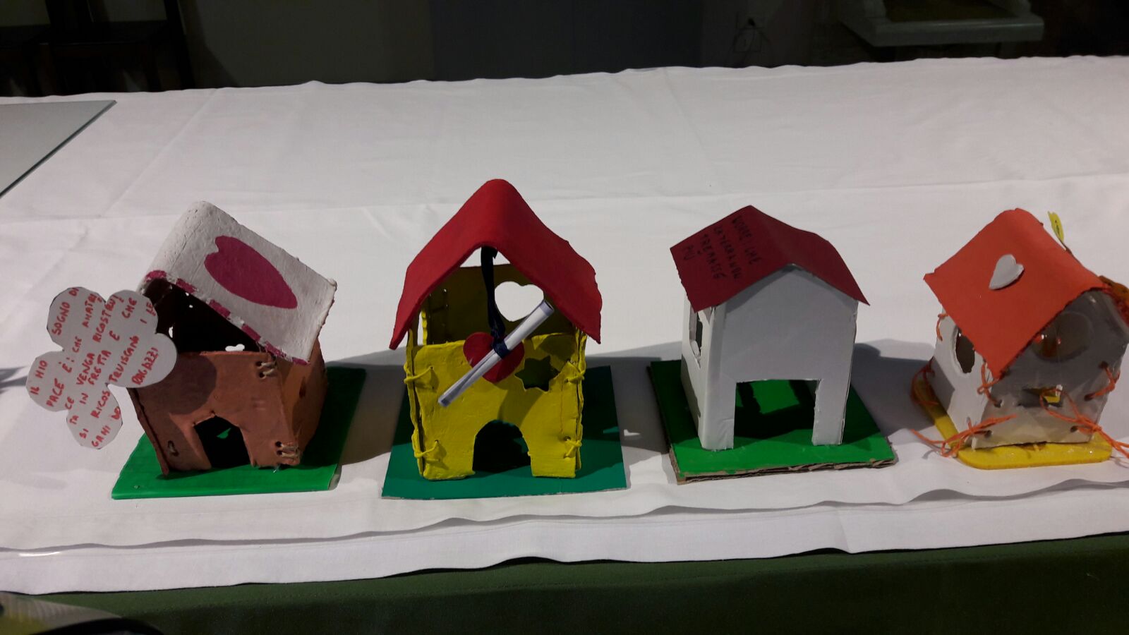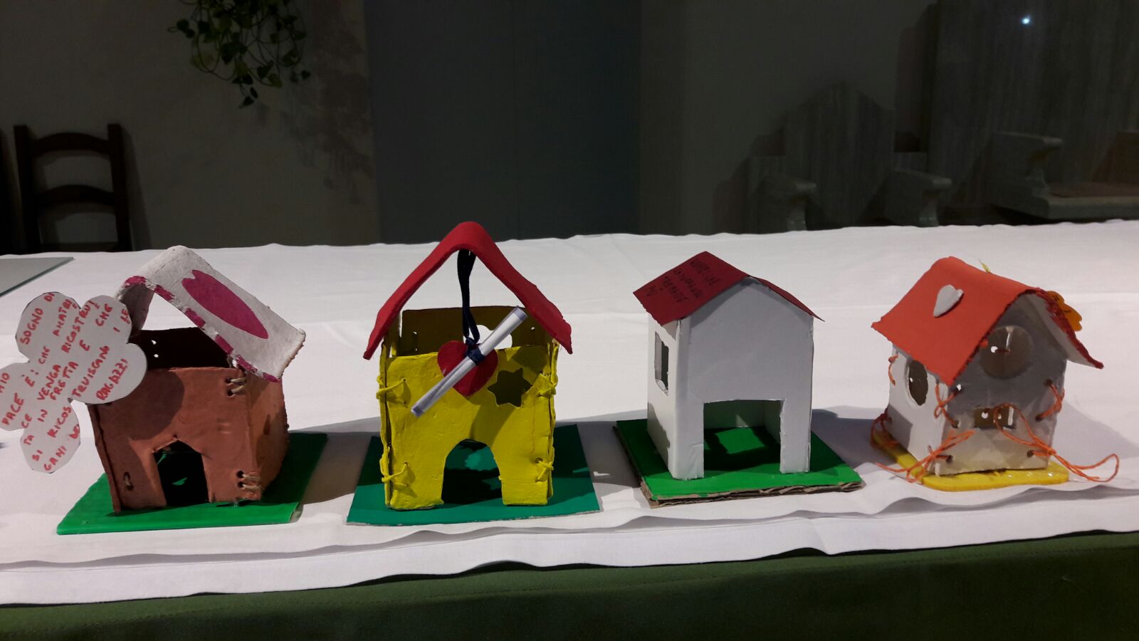I giovani associati hanno infatti realizzato oggetti a forma di casa con dentro un lumino, per indicare l’impegno di ricostruire la “casa” che dia sicurezza e calore anche a chi, come i fratelli terremotati, ha perso tutto. Sul tetto, ogni acierrino ha scritto scritto il proprio sogno di pace, da estendere a ogni situazione in cui, dal piccolo della propria esistenza alla realtà del mondo intero, si cerca pace e armonia.