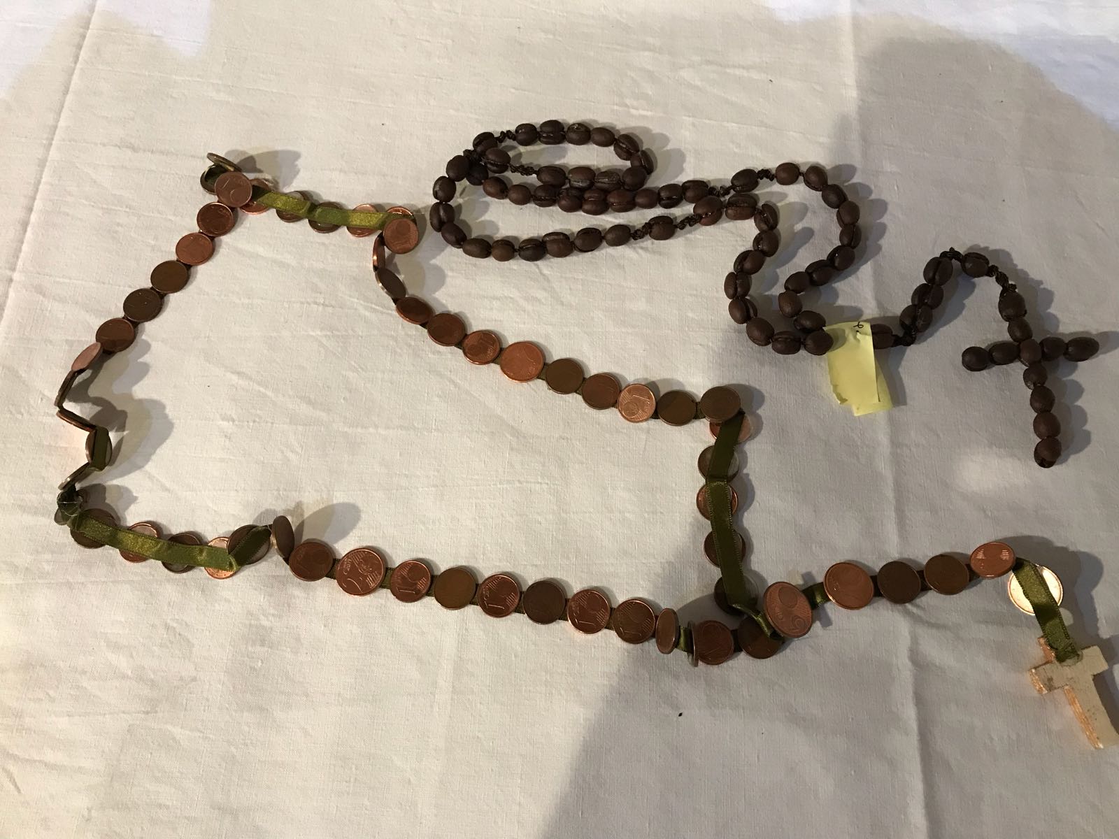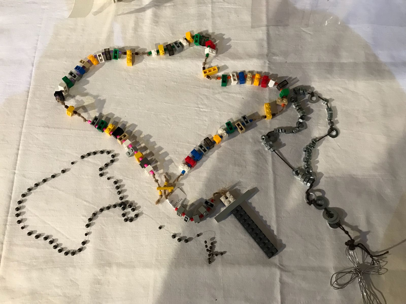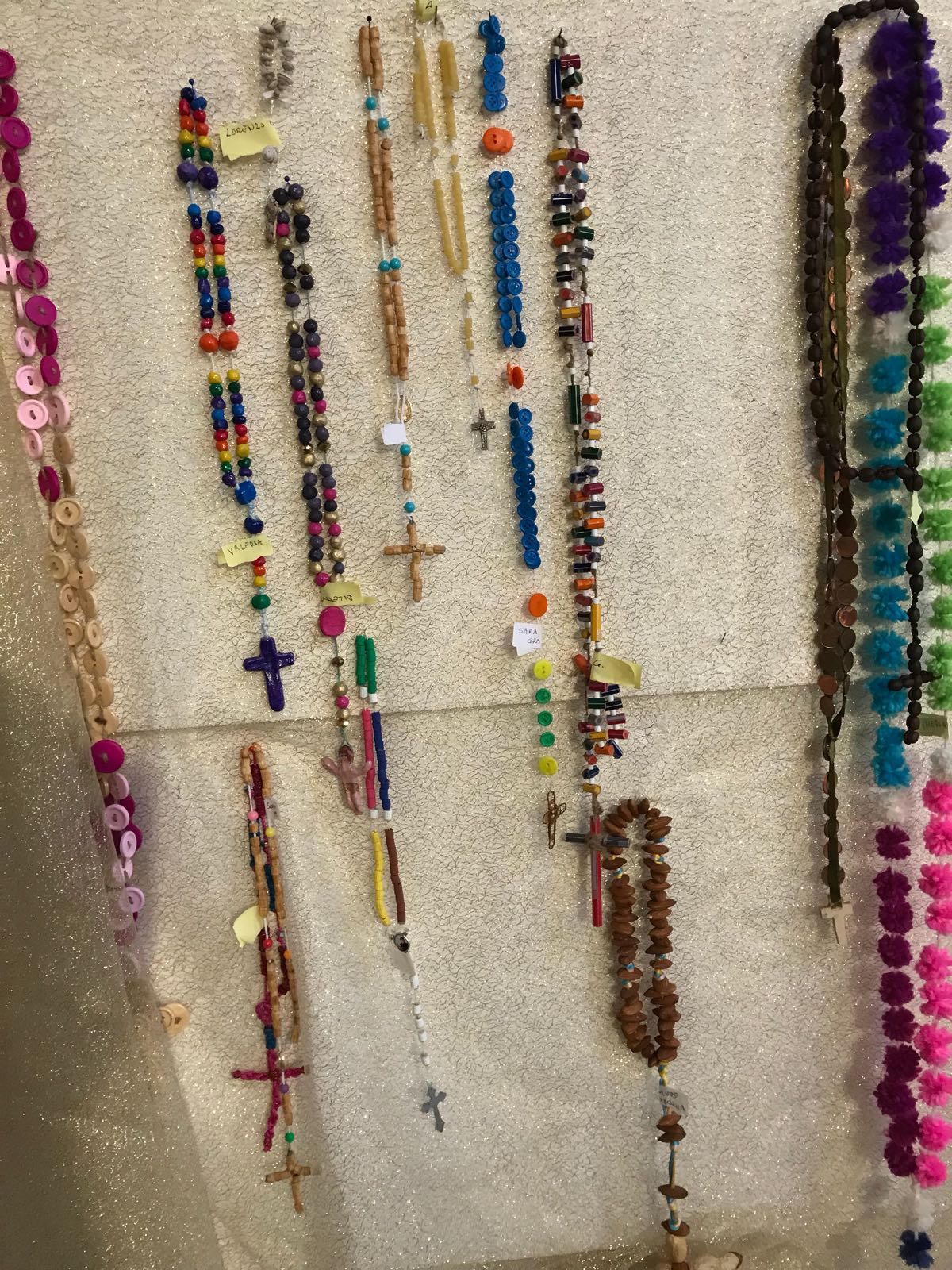 Don Giovanni, infatti, ha stimolato i bambini, con un piccolo concorso a premi, a realizzare corone del rosario con i materiali più diversi, reperibili nelle case come pasta, grani di caffè, bottoni, bulloni, ecc., che hanno portato alla realizzazione di rosari molto belli e colorati.