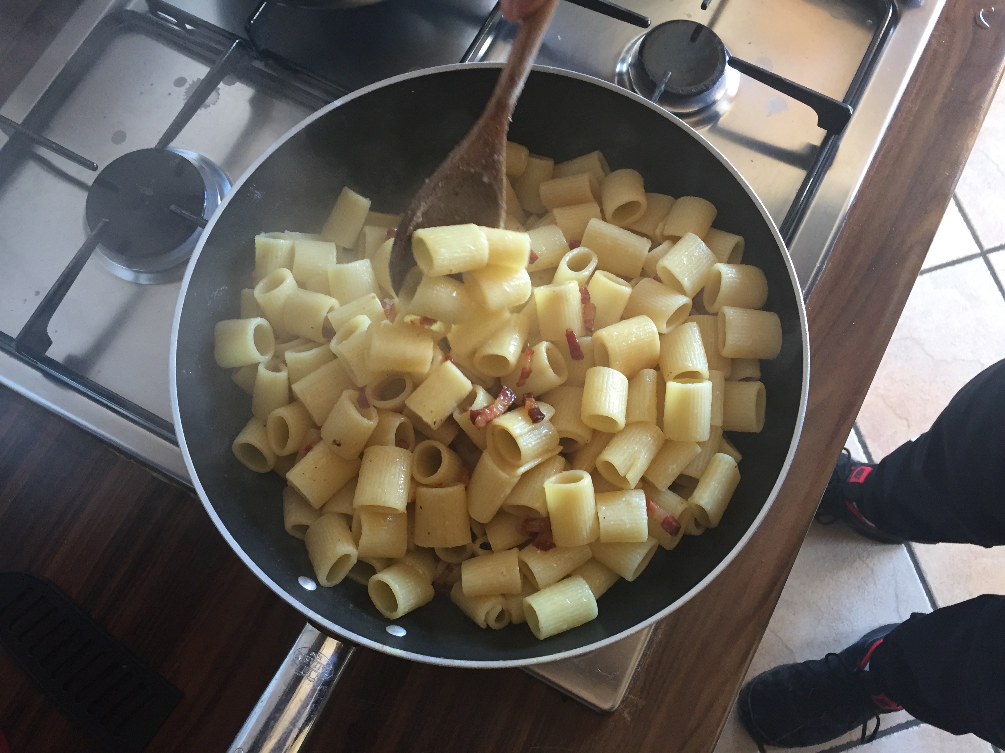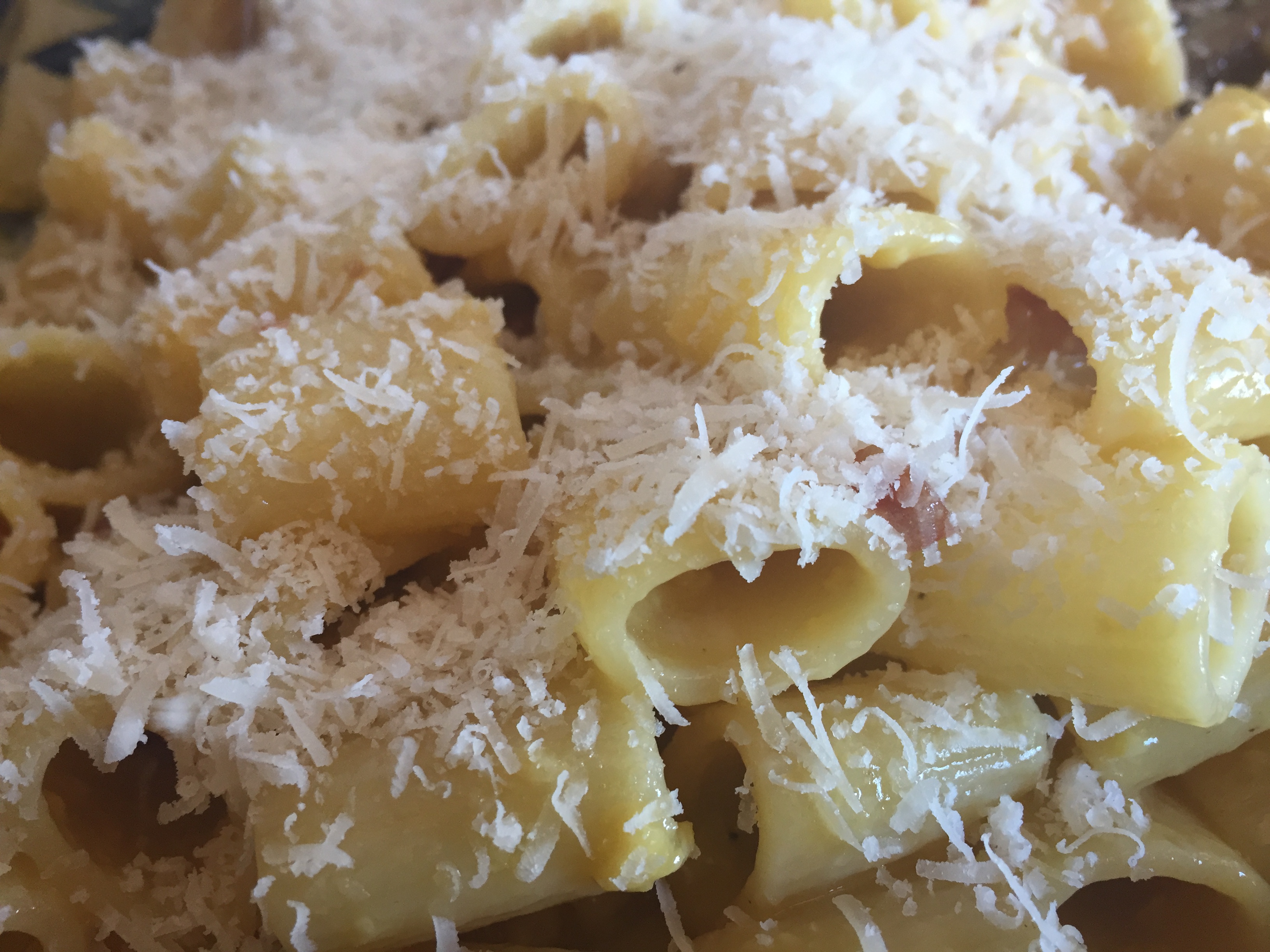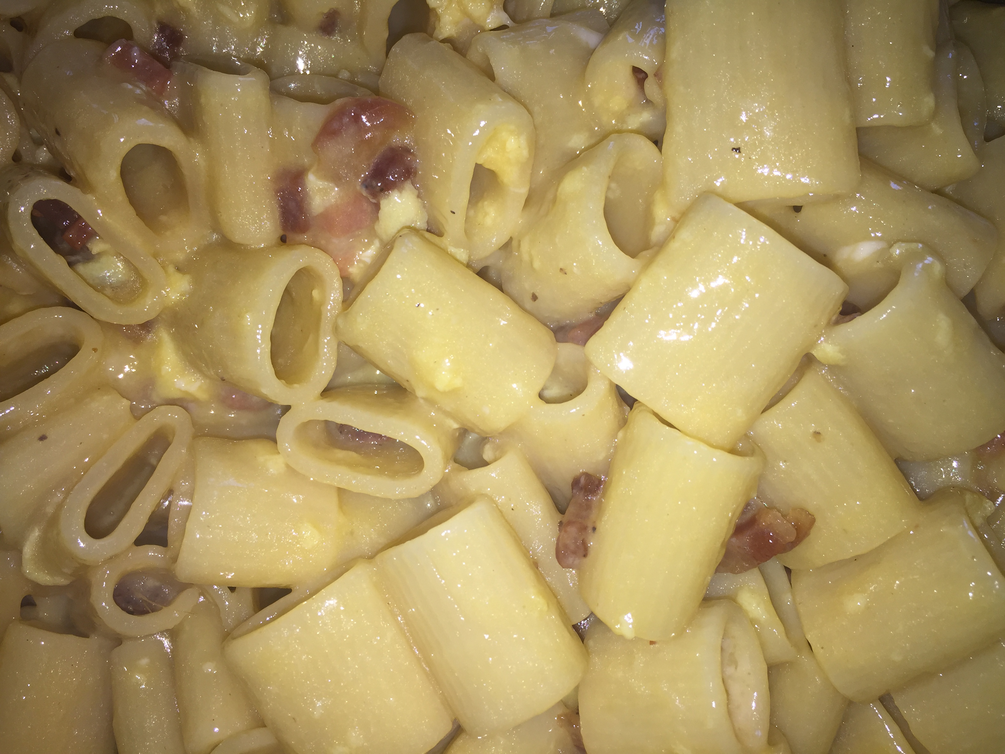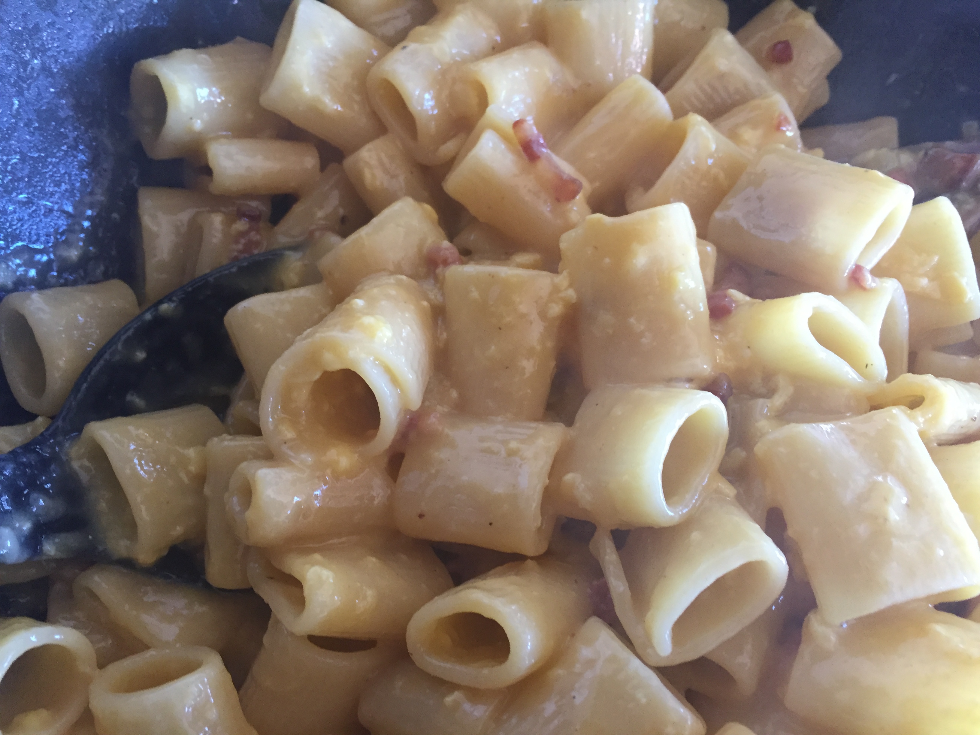Cuocere le mezze maniche in una pentola con abbondante acqua salata. Nel frattempo soffriggere la pancetta in una padella già calda, senza utilizzare alcun condimento.