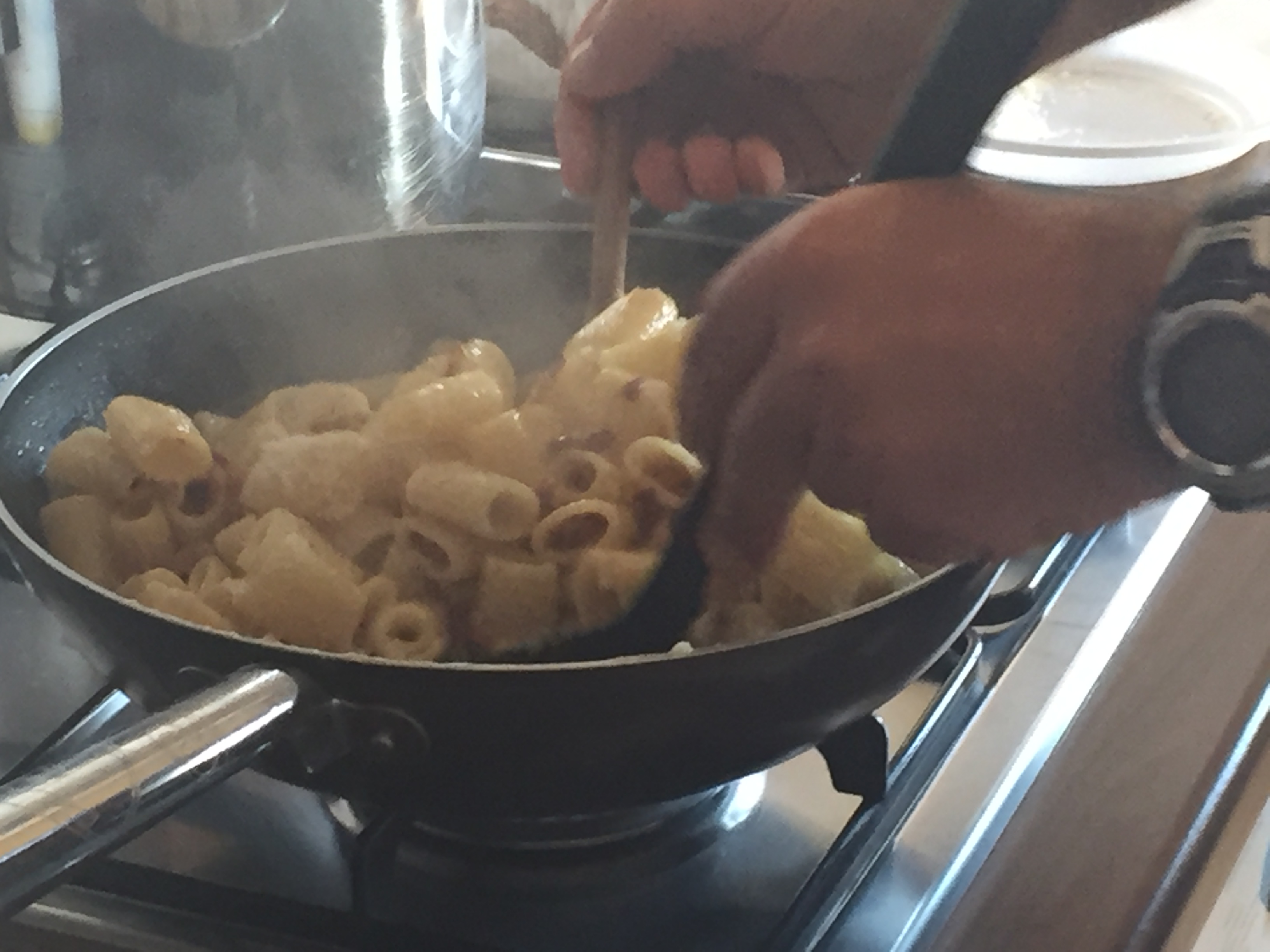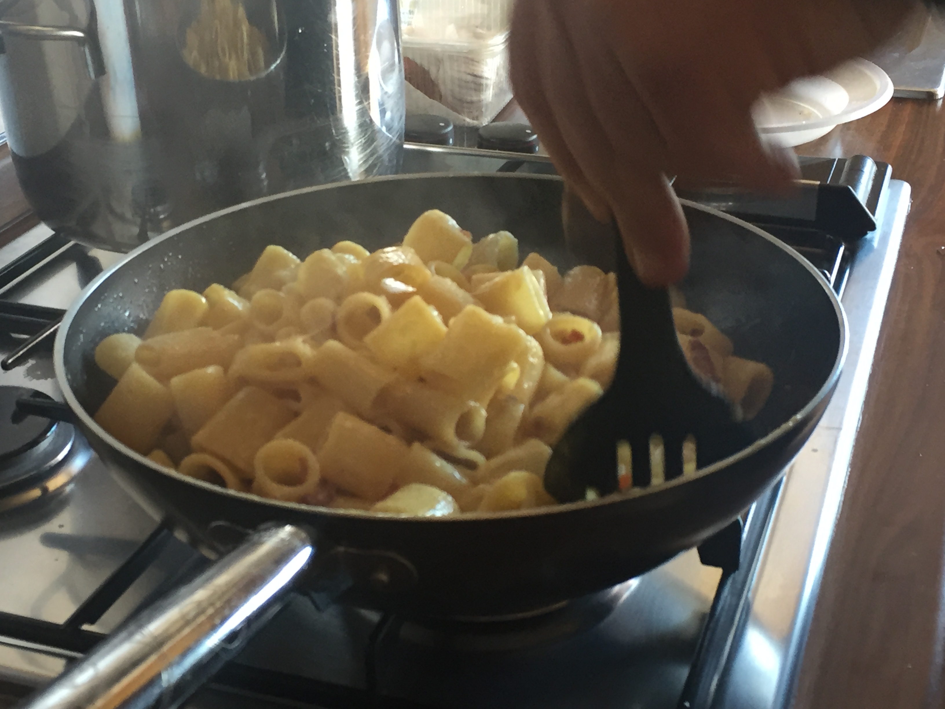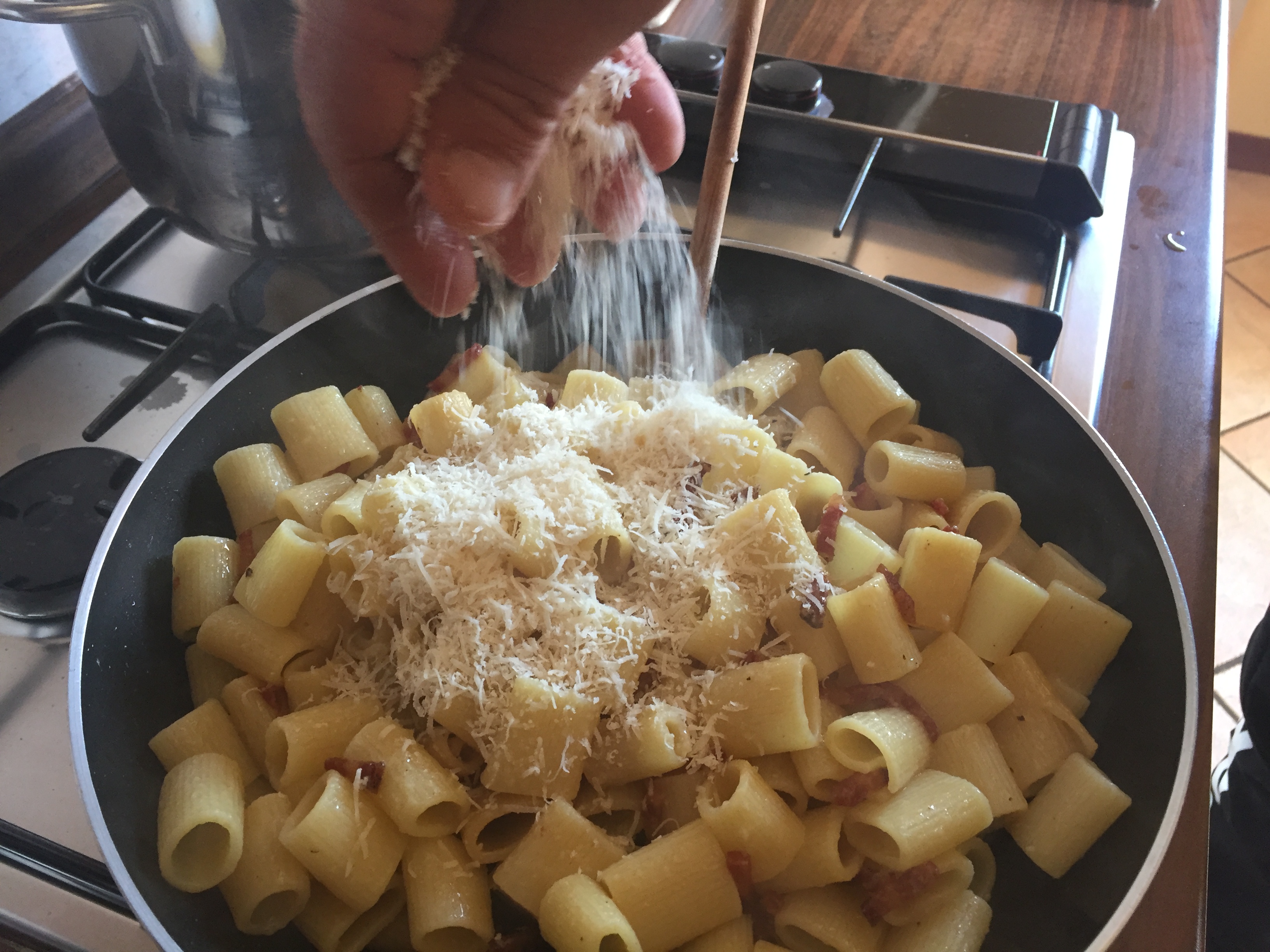 Intanto in una bacinella sbattere le uova insieme al pepe, il sale e il grana fino ad ottenere una consistenza cremosa con gli ingredienti tutti incorporati tra loro. Scolare la pasta al dente e mantecare il tutto nella padella a fiamma bassa. Il segreto è continuare a mescolare fino a che non si addenserà leggermente l’uovo, ma facendo attenzione a non farlo diventare “frittata”.