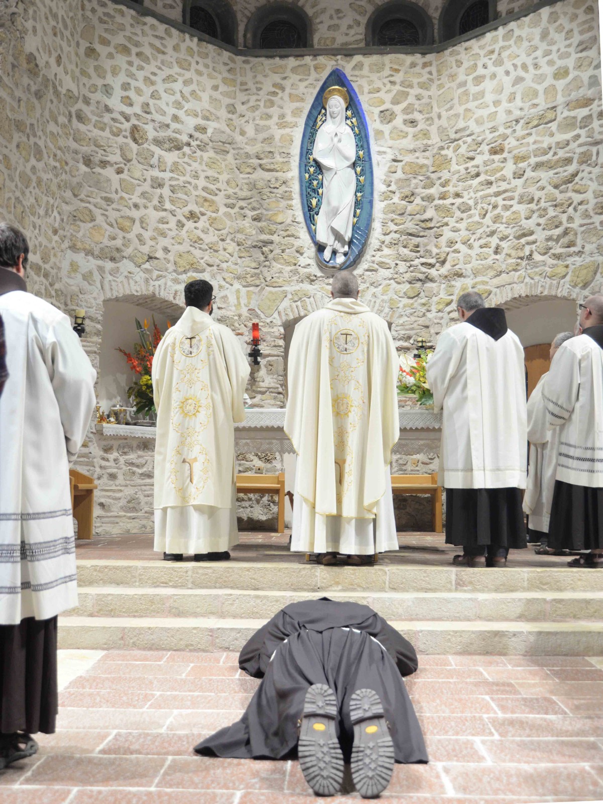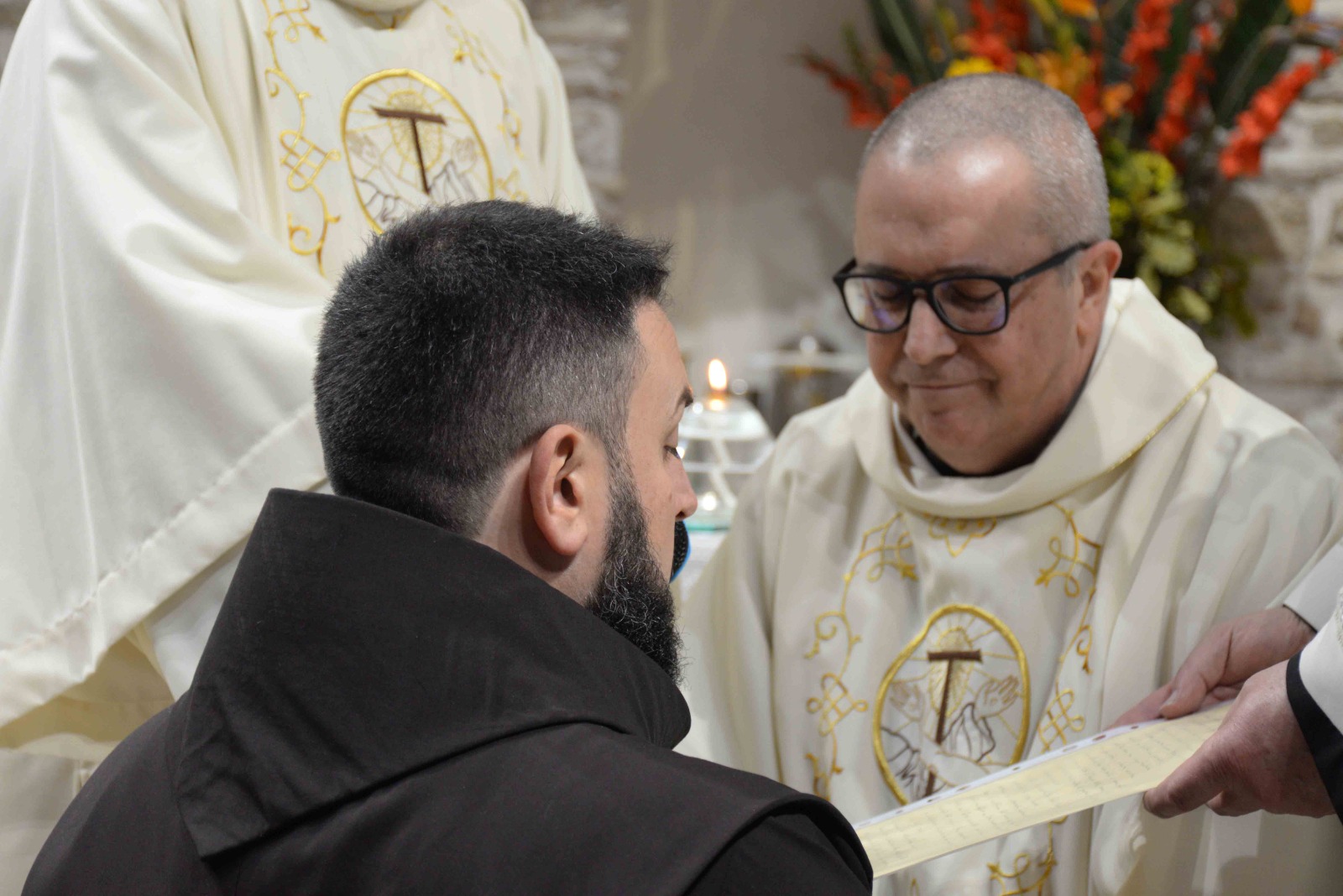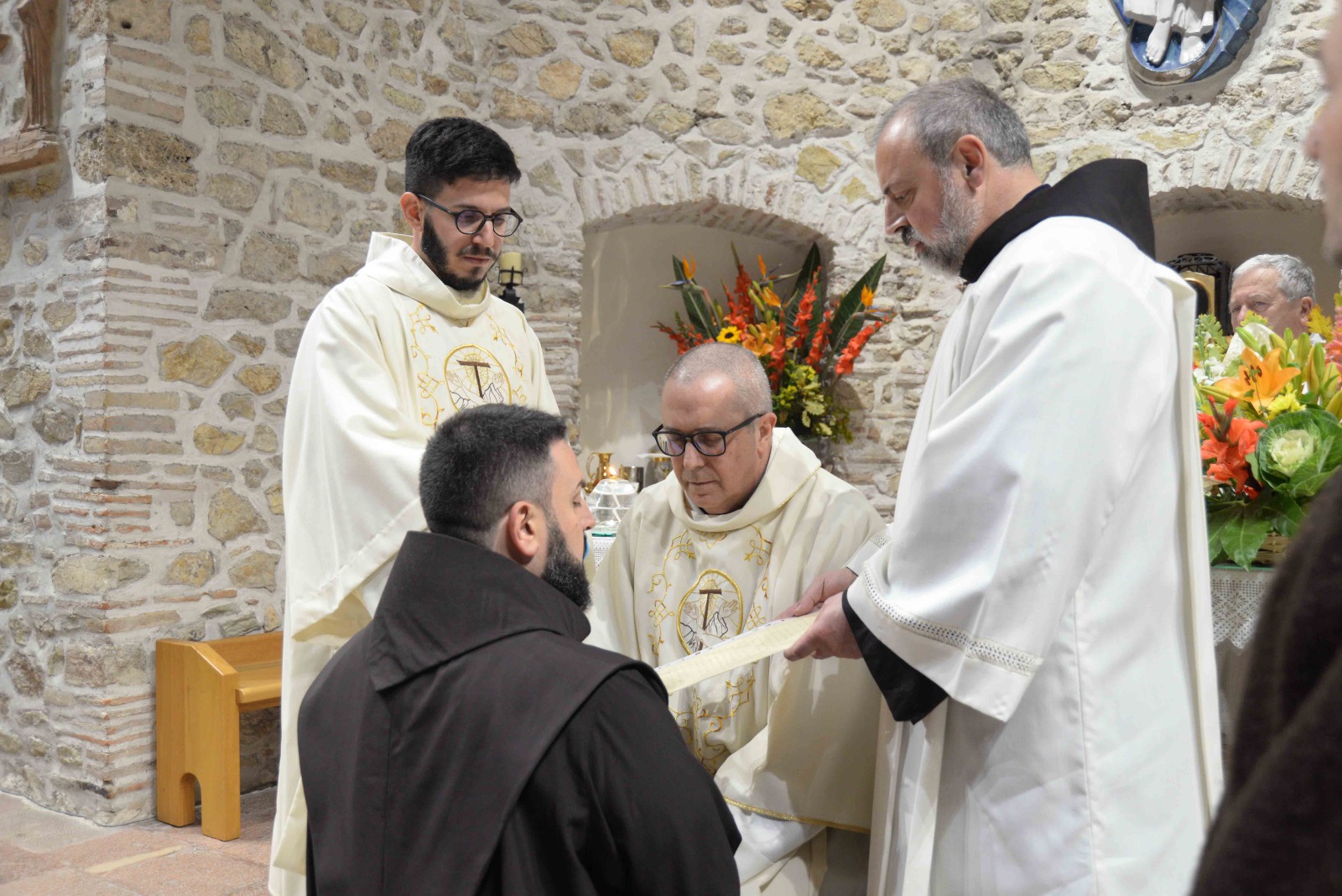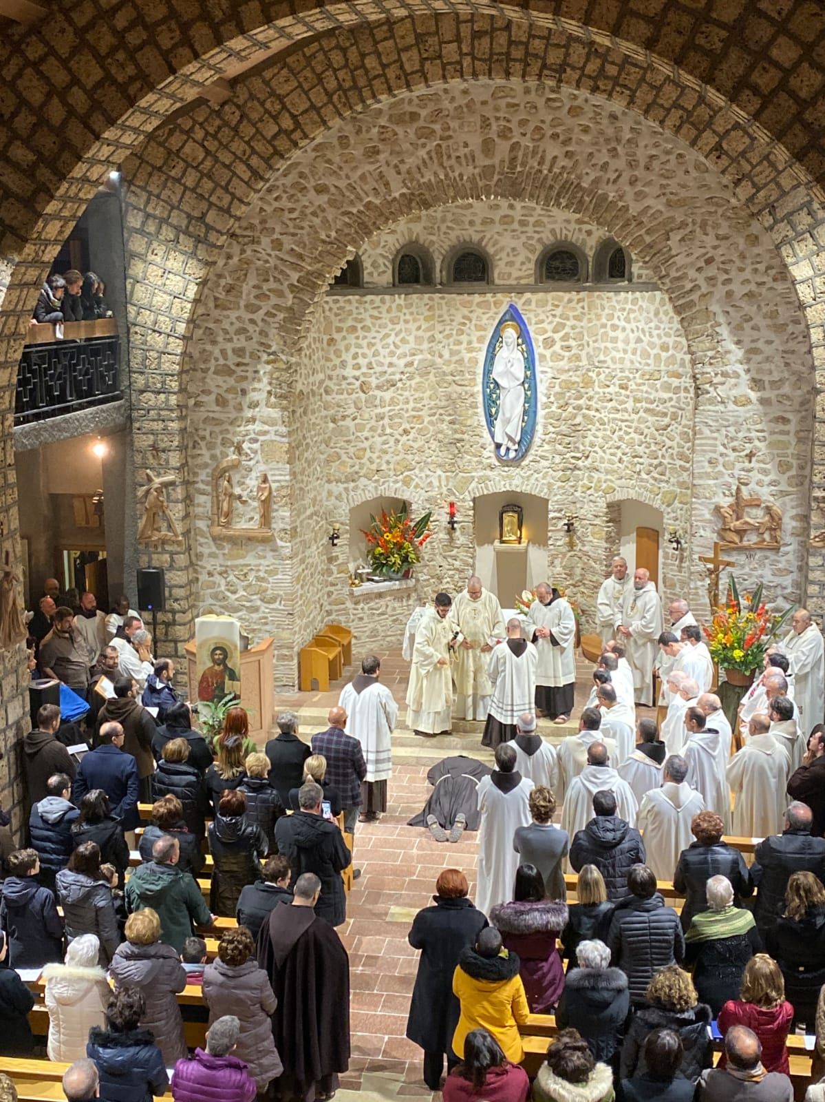 La passione per l’arte e la recitazione lo ha portato anche a vestire i panni di frate Leone nel musical Francesco e i suoi frati di fra Renzo Cocchi, più volte rappresentato anche a Rieti (l’ultima a San Domenico in occasione del festival francescano di ottobre). Leone era il frate più vicino a san Francesco. E l’immaginetta a ricordo della sua professione, che riproduce un dipinto di Casentini che si trova al santuario di Poggio Bustone, raffigura proprio il santo con frate Leone. Pensando a lui, che assieme a Rufino e Angelo si ritrovarono, dice la Leggenda dei tre compagni, a Greccio per rievocari i passi del Serafico Padre, si è disteso, sabato pomeriggio, nella chiesa dell’Immacolata del santuario grecciano, nell’invocare la benedizione del Signore sulla sua scelta di definitiva consacrazione religiosa. Benedizione che gli è stata impartita dal padre provinciale, Luigi Recchia, durante la Messa solenne concelebrata da tanti confratelli francescani e anche diversi sacerdoti del clero di Frosinone-Veroli-Ferentino, la sua diocesi di origine. Domenica Francesco spera di essere di nuovo lì, ad accogliere il Successore di Pietro nella sua seconda visita al santuario che parla di quella profonda umanità di Gesù così cara all’alter Christus che fu il santo di Assisi.
