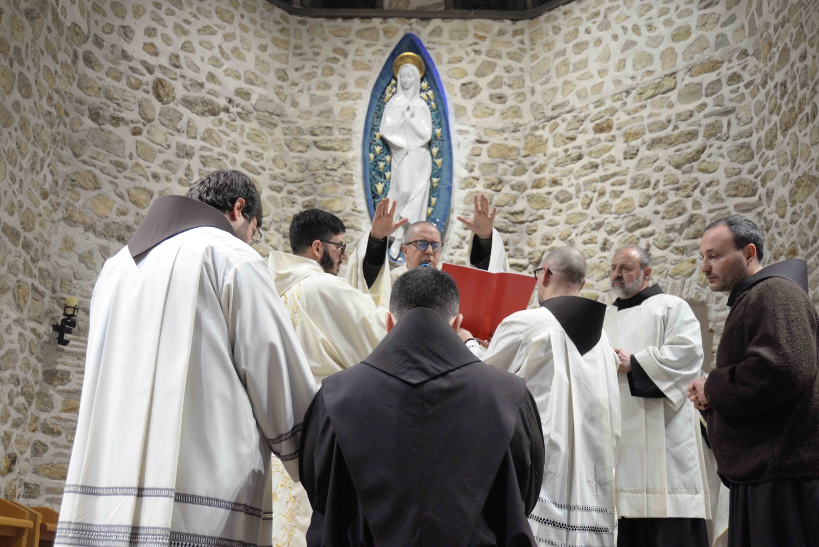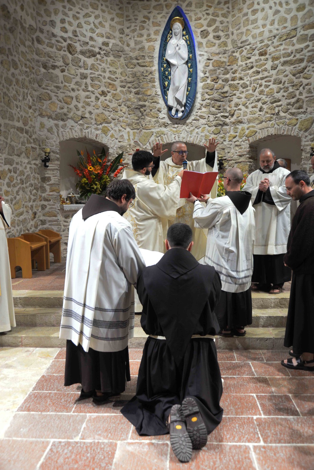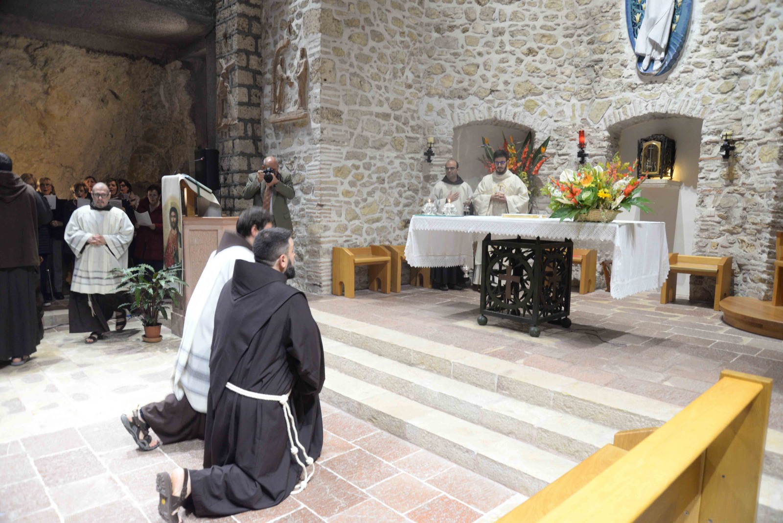 La passione per l’arte e la recitazione lo ha portato anche a vestire i panni di frate Leone nel musical Francesco e i suoi frati di fra Renzo Cocchi, più volte rappresentato anche a Rieti (l’ultima a San Domenico in occasione del festival francescano di ottobre). Leone era il frate più vicino a san Francesco. E l’immaginetta a ricordo della sua professione, che riproduce un dipinto di Casentini che si trova al santuario di Poggio Bustone, raffigura proprio il santo con frate Leone. Pensando a lui, che assieme a Rufino e Angelo si ritrovarono, dice la Leggenda dei tre compagni, a Greccio per rievocari i passi del Serafico Padre, si è disteso, sabato pomeriggio, nella chiesa dell’Immacolata del santuario grecciano, nell’invocare la benedizione del Signore sulla sua scelta di definitiva consacrazione religiosa. Benedizione che gli è stata impartita dal padre provinciale, Luigi Recchia, durante la Messa solenne concelebrata da tanti confratelli francescani e anche diversi sacerdoti del clero di Frosinone-Veroli-Ferentino, la sua diocesi di origine. Domenica Francesco spera di essere di nuovo lì, ad accogliere il Successore di Pietro nella sua seconda visita al santuario che parla di quella profonda umanità di Gesù così cara all’alter Christus che fu il santo di Assisi.