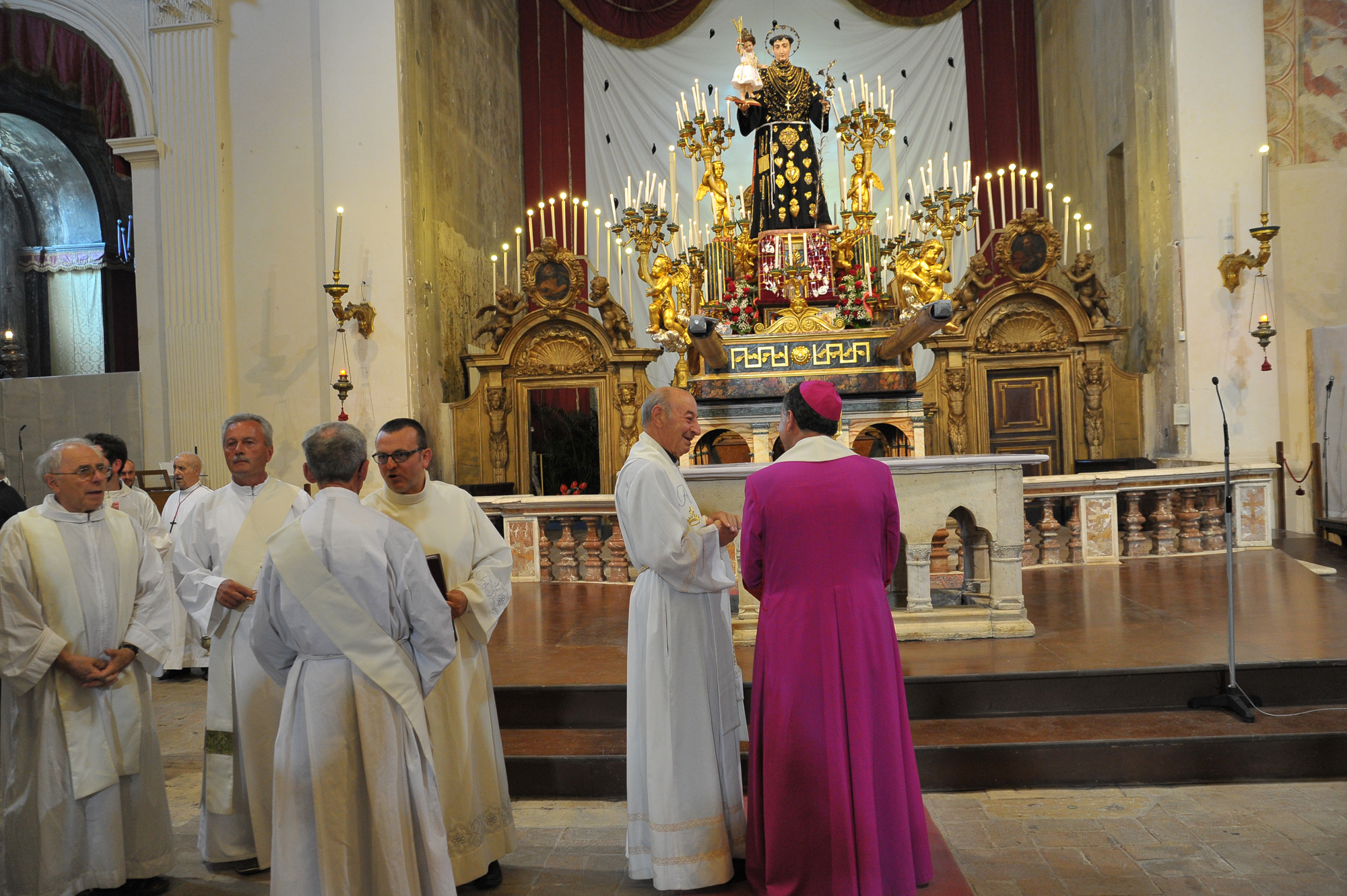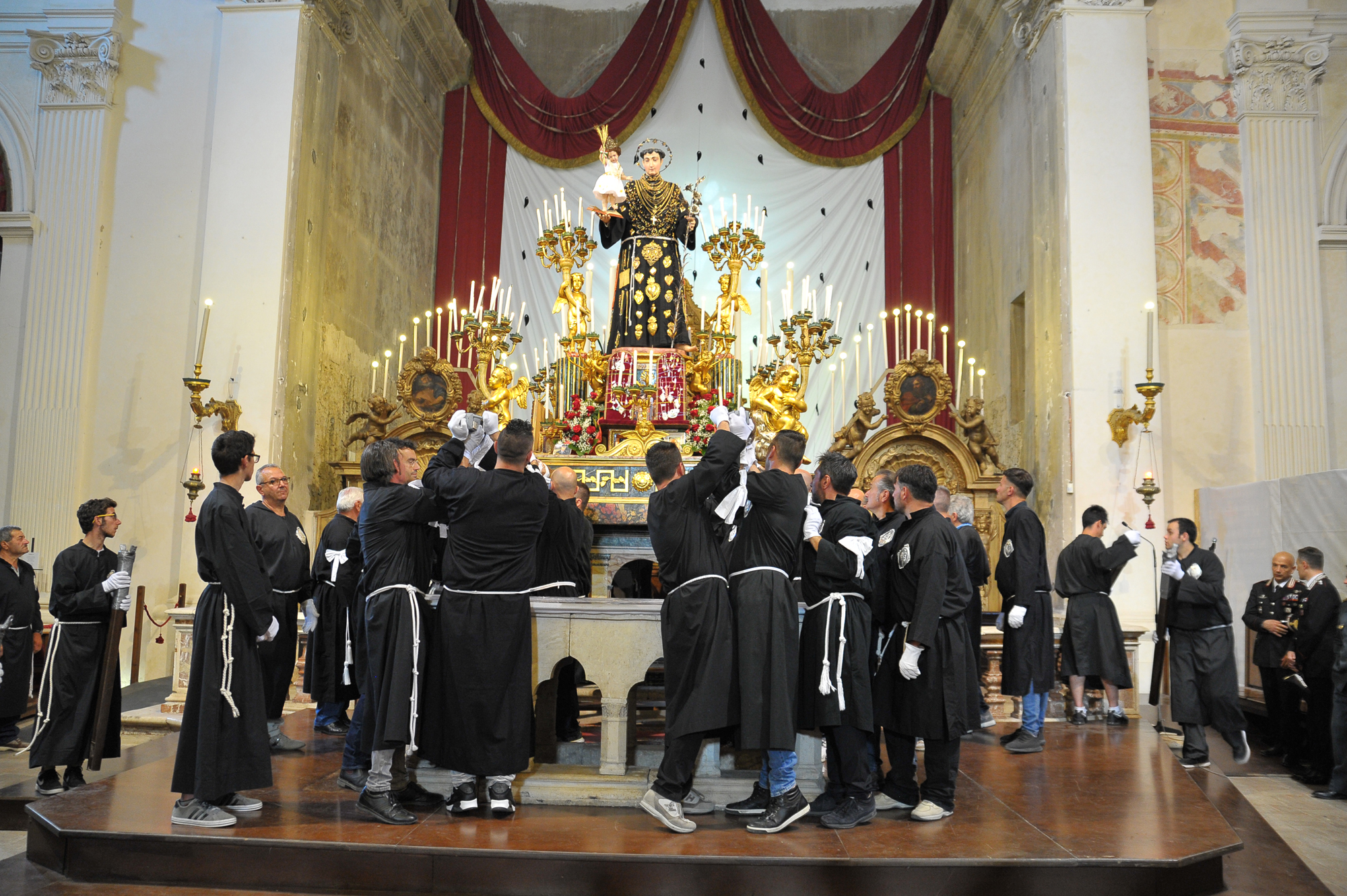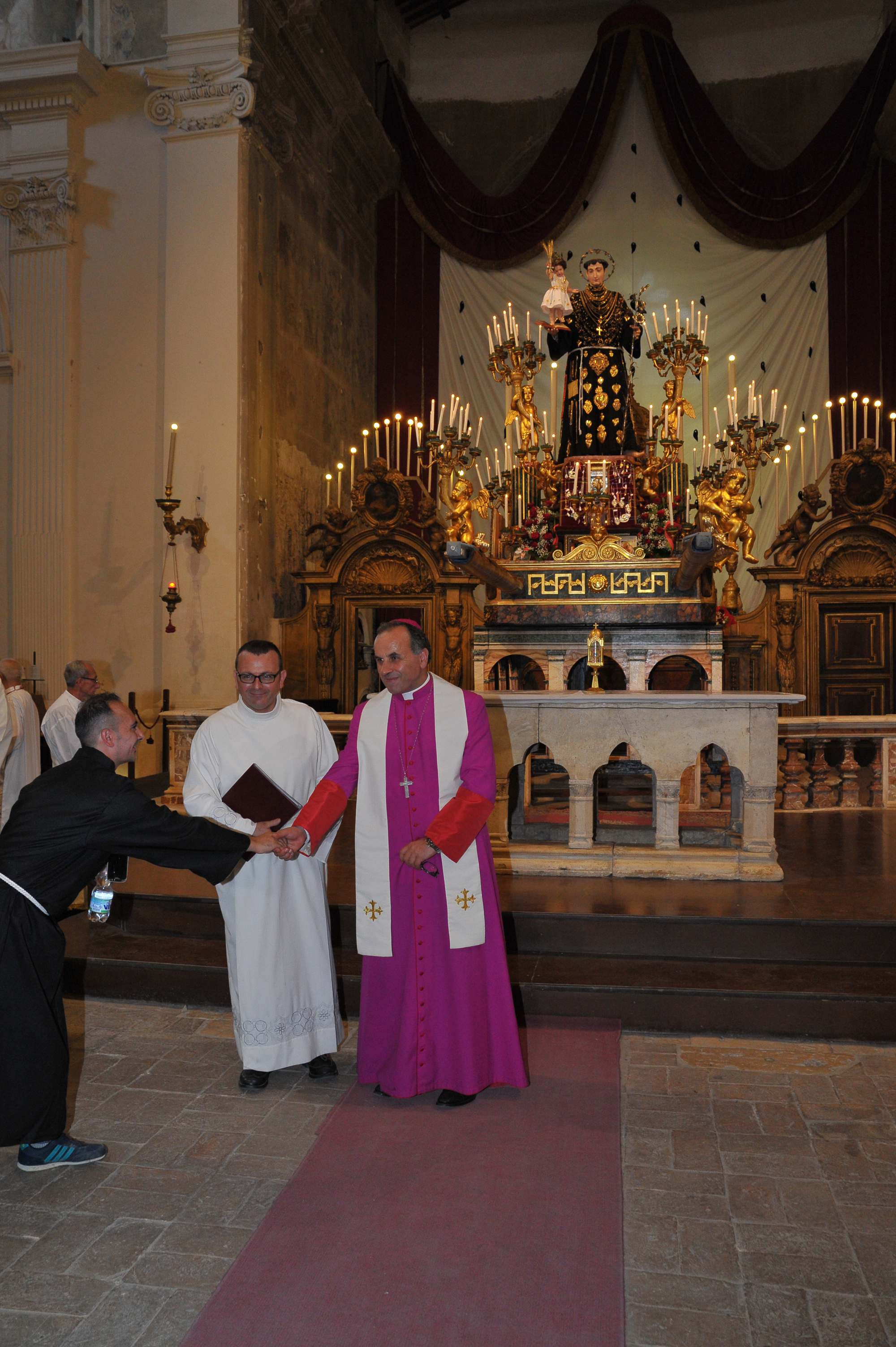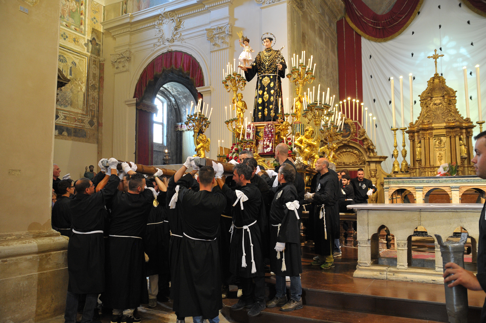 È stato guidato dal vescovo Domenico il momento della benedizione dei portatori, gli uomini della Pia Unione Sant’Antonio di Padova che ogni anno vengono estratti per portare a spalla, divisi in quattro squadre di 16 elementi ciascuna, la statua del Santo dei miracoli.