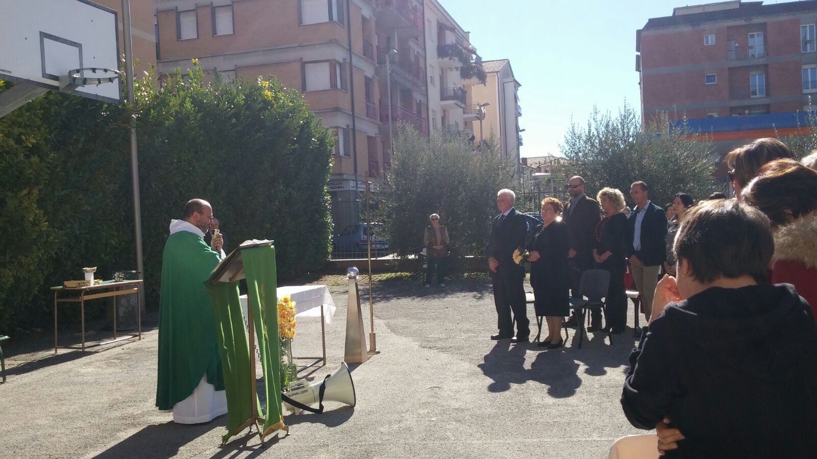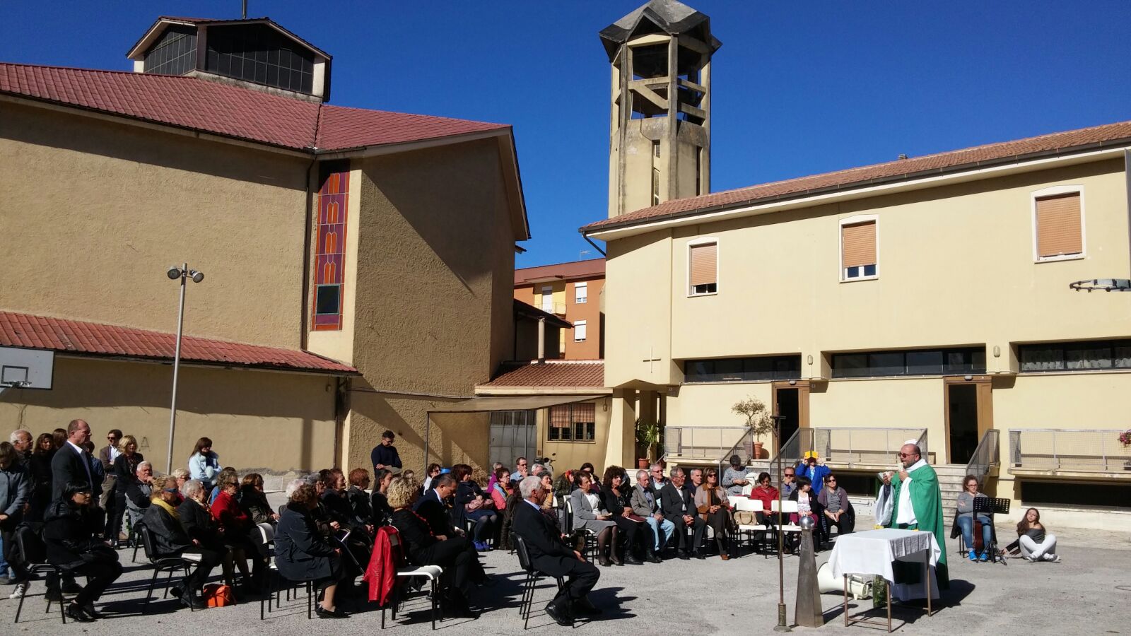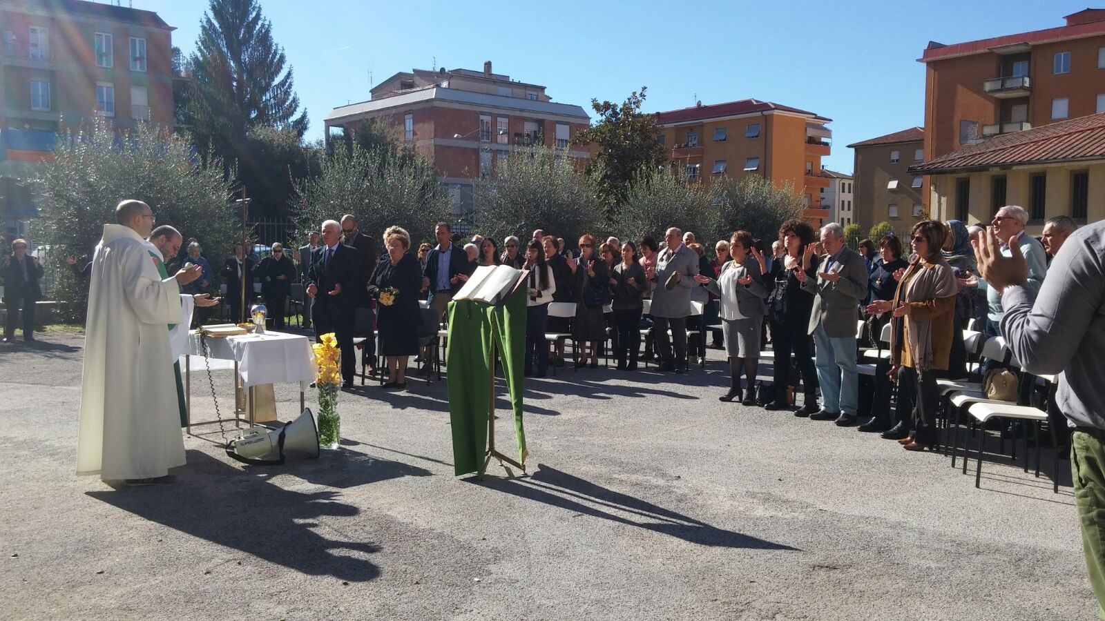 Anche a Regina Pacis, nonostante la chiesa sia più che sicura come edificio, per evitare assembramenti in luogo chiuso stamattina la Messa è stata all’aperto. Un tavolino piazzato sotto il canestro del campetto di basket a fare da altare, un leggio e una croce, con don Fabrizio a presiedere l’eucaristia domenicale con i fedeli intervenuti, tra cui la famiglia di due parrocchiani che festeggiavano le nozze d’oro e, al termine della celebrazione, hanno reso grazie a Dio, assieme ai loro figli, per i cinquant’anni di vita comune rinnovando, con la benedizione del parroco, le fedi nuziali.