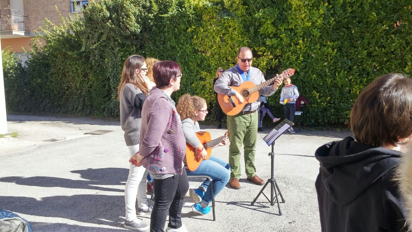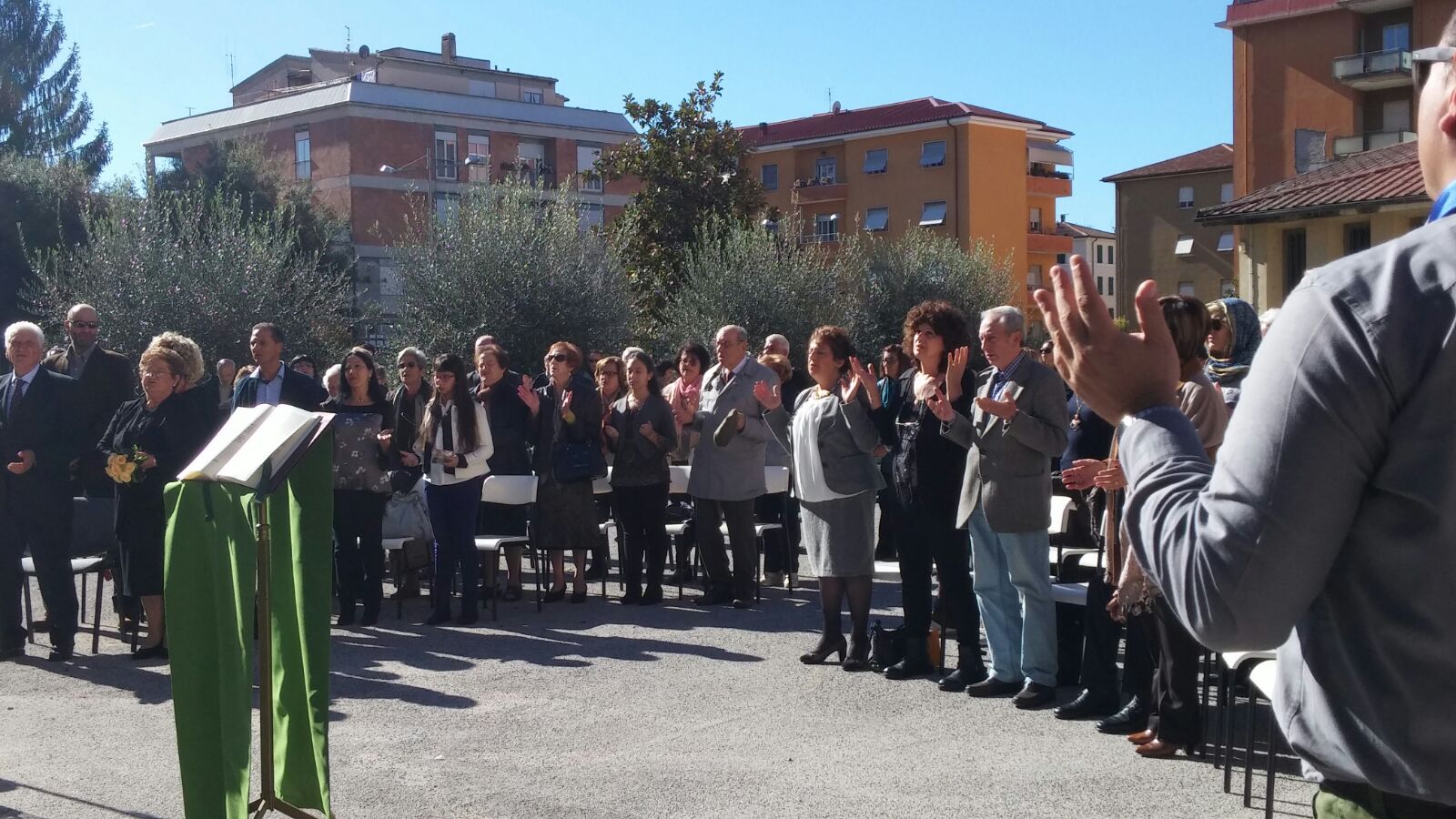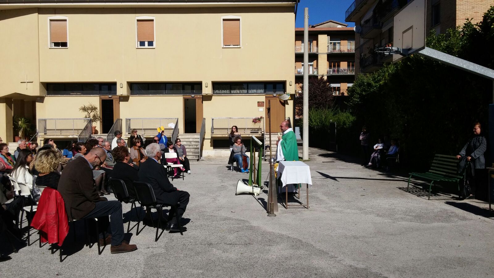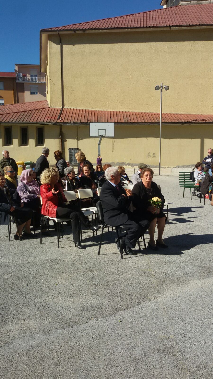 Anche a Regina Pacis, nonostante la chiesa sia più che sicura come edificio, per evitare assembramenti in luogo chiuso stamattina la Messa è stata all’aperto. Un tavolino piazzato sotto il canestro del campetto di basket a fare da altare, un leggio e una croce, con don Fabrizio a presiedere l’eucaristia domenicale con i fedeli intervenuti, tra cui la famiglia di due parrocchiani che festeggiavano le nozze d’oro e, al termine della celebrazione, hanno reso grazie a Dio, assieme ai loro figli, per i cinquant’anni di vita comune rinnovando, con la benedizione del parroco, le fedi nuziali.