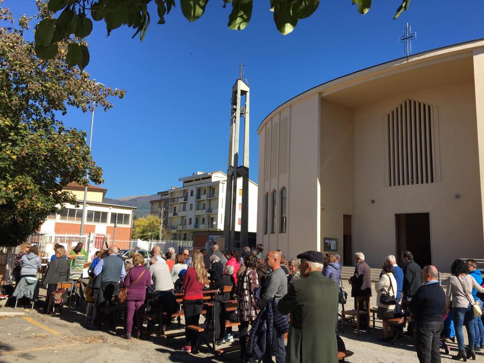 Sono stati tanti i momenti di preghiera celebrati questa mattina all’aperto per precauzione, in seguito al perdurare delle scosse sismiche. Ma neppure il sisma di 6.5 gradi delle 7.40 ha fermato i fedeli che hanno partecipato numerosi alle funzioni. Come nel caso della parrocchia di Villa Reatina a Rieti, che ha visto il parroco don Jean Baptiste Sano presiedere la liturgia sul sagrato della chiesa di San Giovanni Bosco.