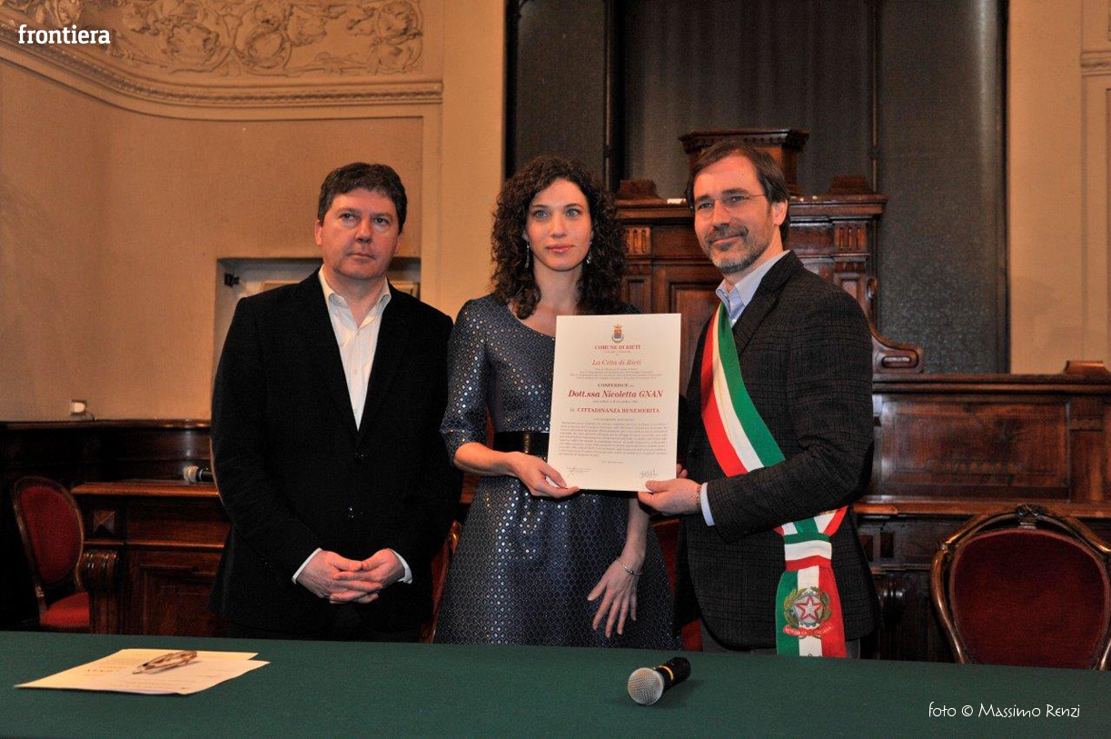 Si è tenuta venerdì 4 dicembre presso la sala Consiliare del Comune, alla presenza del sindaco di Rieti, Simone Petrangeli, e del presidente del Consiglio comunale, Gian Piero Marroni, la cerimonia per la consegna della cittadinanza benemerita alla Dott.ssa Nicoletta Gnan.