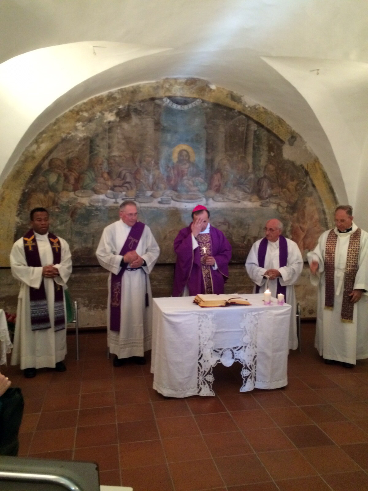 Prima della celebrazione della Messa, mons. Luigi Aquilini ha ringraziato il vescovo per la sua presenza e ricordato il luogo nel quale ci trovavamo tutti e cioè l’antico refettorio dell’ex convento dei frati Cappuccini di San Giuseppe da Leonessa dove campeggia un bell’affresco dell’ultima cena di Gesù, opera di pittori umbri seicenteschi di passaggio al tempo al convento.