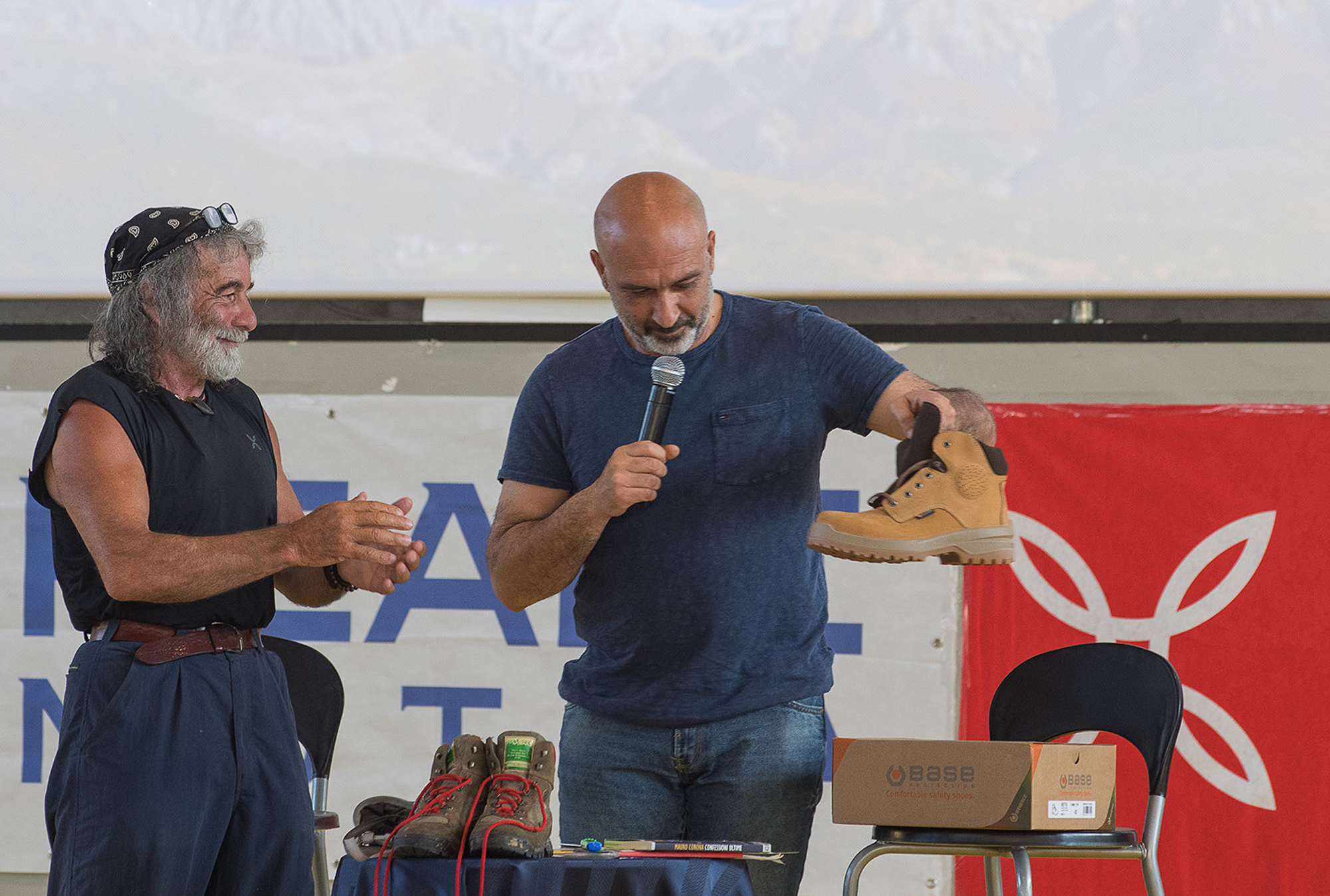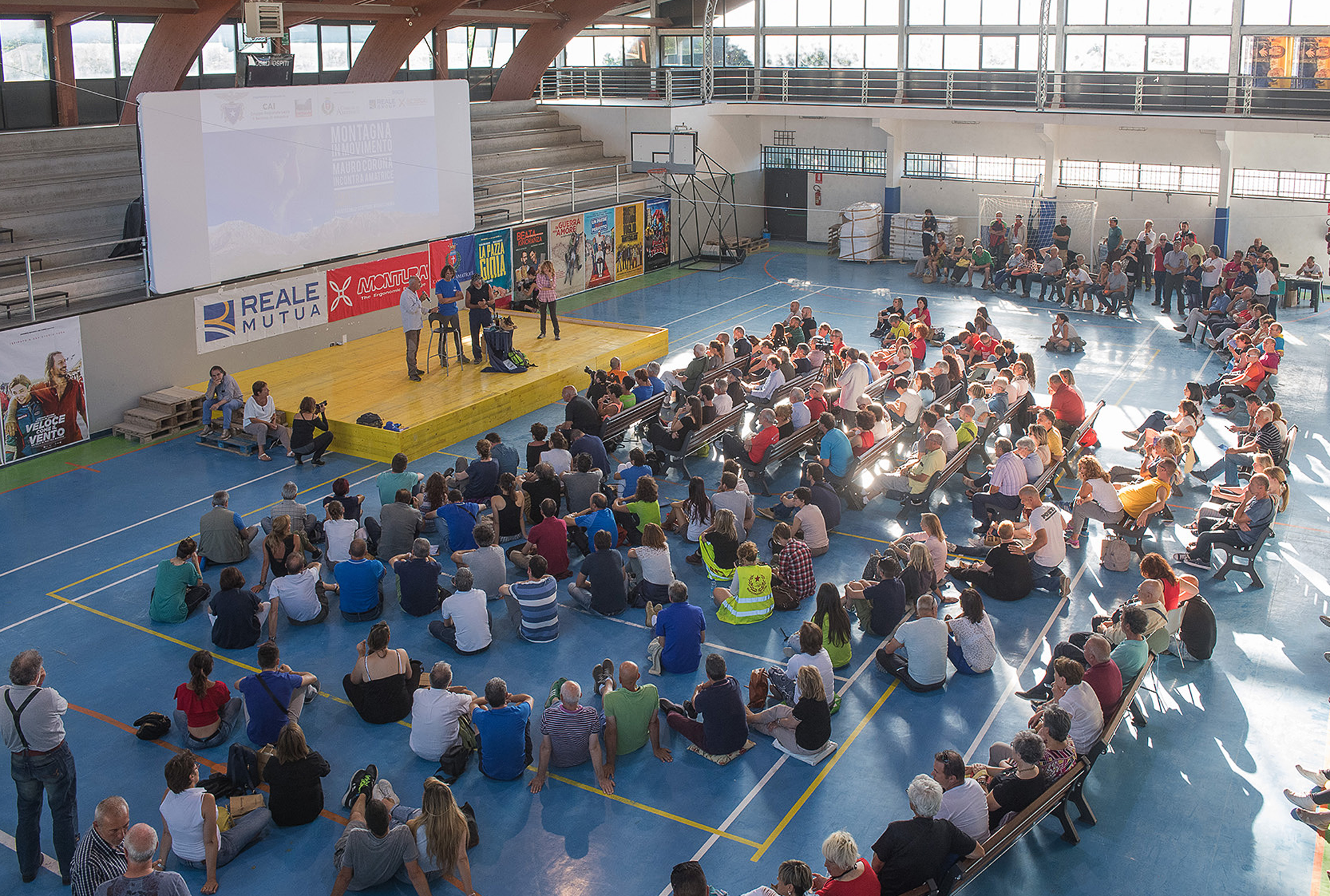 Il 17 giugno grazie all’evento culturale del Cai Regione Lazio e della sezione Amatrice, con il patrocinio del Comune, Corona ha tenuto un incontro culturale di grandissimo coinvolgimento per tutti presso il Palazzetto dello Sport di Amatrice. Una moltitudine di persone, 360 sedute per terra e sulle panchine, sono giunte per ascoltarlo nel campo di pallacanestro adibito a cinema e con lui si sono commosse e hanno riso per le battute fulminanti e provocatorie. Molti amatriciani sono venuti ad ascoltare la sua etica asciutta di montanaro, hanno preso nota a mente delle sue riflessioni su uno stile di vita più semplice e libero, fatto “di levare” e di “fare con le mani”; come pure gli appassionati di montagne dalle 4 regioni del cratere sismico, ma anche dalla Campania e dalla Toscana, si sono ritrovati nelle sue parole quando spiegava lo spreco del tempo, l’inutile attaccamento ai beni superflui. In questo la montagna aiuta a scegliere, a togliere e a farne a meno.