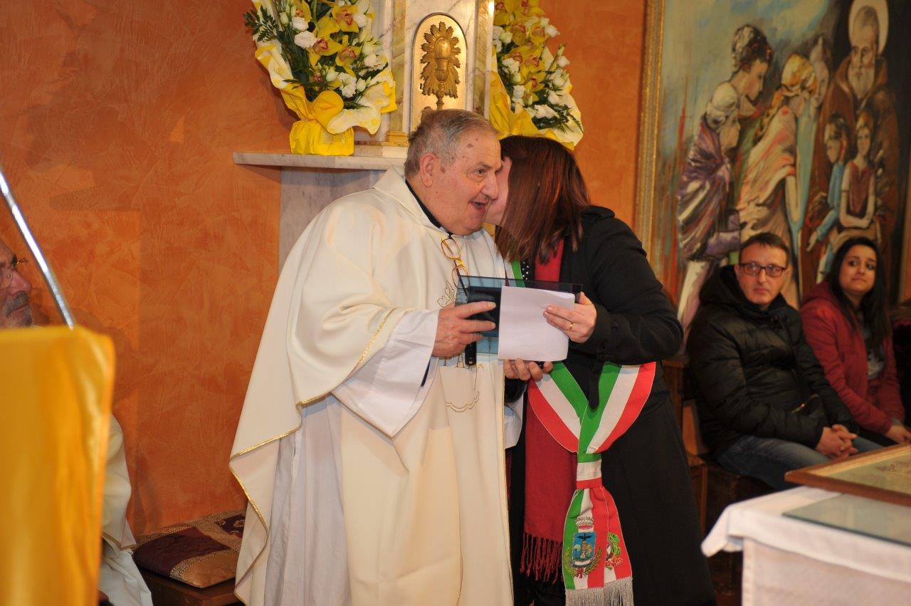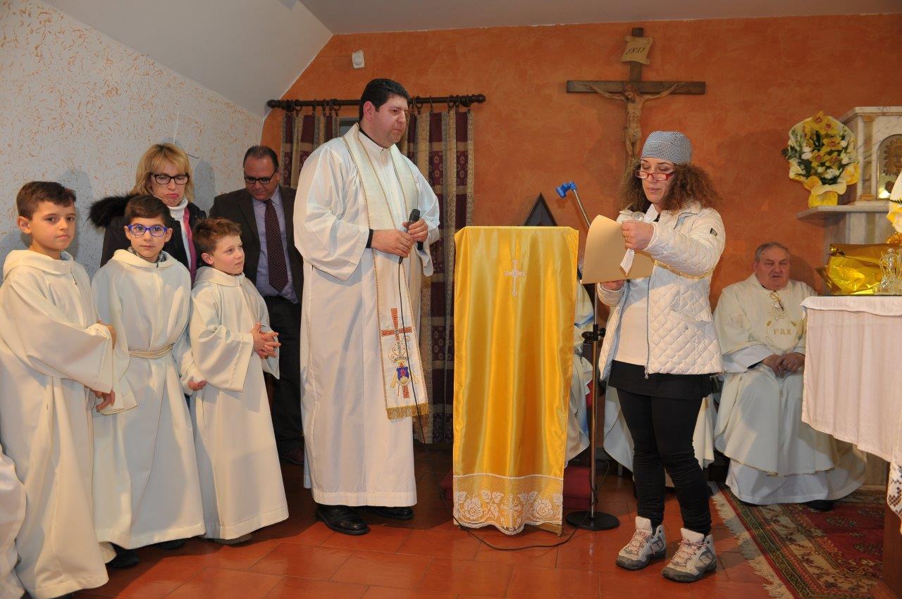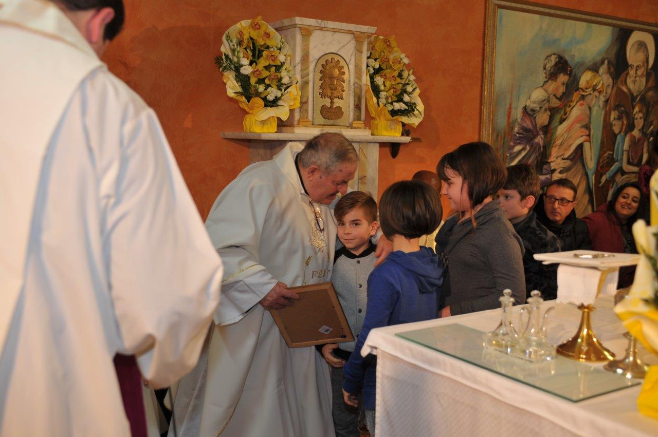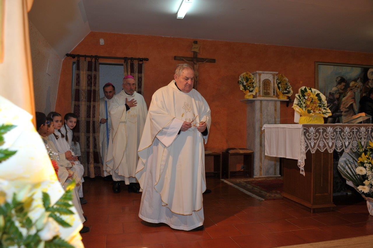 Ha voluto essere segnato anche lui con l’olio degli infermi, visto che il peso degli anni si fa sentire e qualche acciacco non manca: senectus ipsa est morbus, «la vecchiaia è per sé stessa una malattia», dice la celebre sententia dello scrittore latino Terenzio. E don Patacchiola la fatica fisica ora comincia a sentirla e ha voluto anche lui chiedere un po’ di forza divina. Ma quello che ancora ben lo sorregge è l’energia morale e spirituale. Quella che lo ha portato, in gran parte del suo mezzo secolo di ministero presbiterale, a dividersi fra il servizio di parroco, prima a Marcetelli poi nella sua Cantalice, e l’attività di cerimoniere vescovile e direttore dell’Ufficio liturgico diocesano. Ora che in pianta stabile risiede alla Casa Buon Pastore e ricopre l’ufficio di canonico del Duomo, la parrocchia cantaliciana continua, pendolare dalla città, a curarla, anche se don Nicola l’ha “alleggerito” delle pendici del paese. Non è venuto meno, però, in lui che a Cantalice ha recuperato vari spazi che hanno arricchito la storia religiosa della cittadina, il grande legame con questa cappella ai piani dedicata a san Giuseppe, con tanto sacrificio e tanta passione don Gottardo realizzò dal nulla all’interno di un container, creandovi un’aula liturgica più che dignitosa e un punto di ritrovo importante per gli abitanti della zona compresa tra Santa Margherita e la salita che va verso il paese. Legame manifestato con grande benevolenza dai parrocchiani, che al termine della messa hanno rivolto a don Gottardo un saluto affettuoso, scritto in un’apposita pergamena letta dalla rappresentante del Comitato di San Giuseppe e in una bella poesia proposta dai bambini.