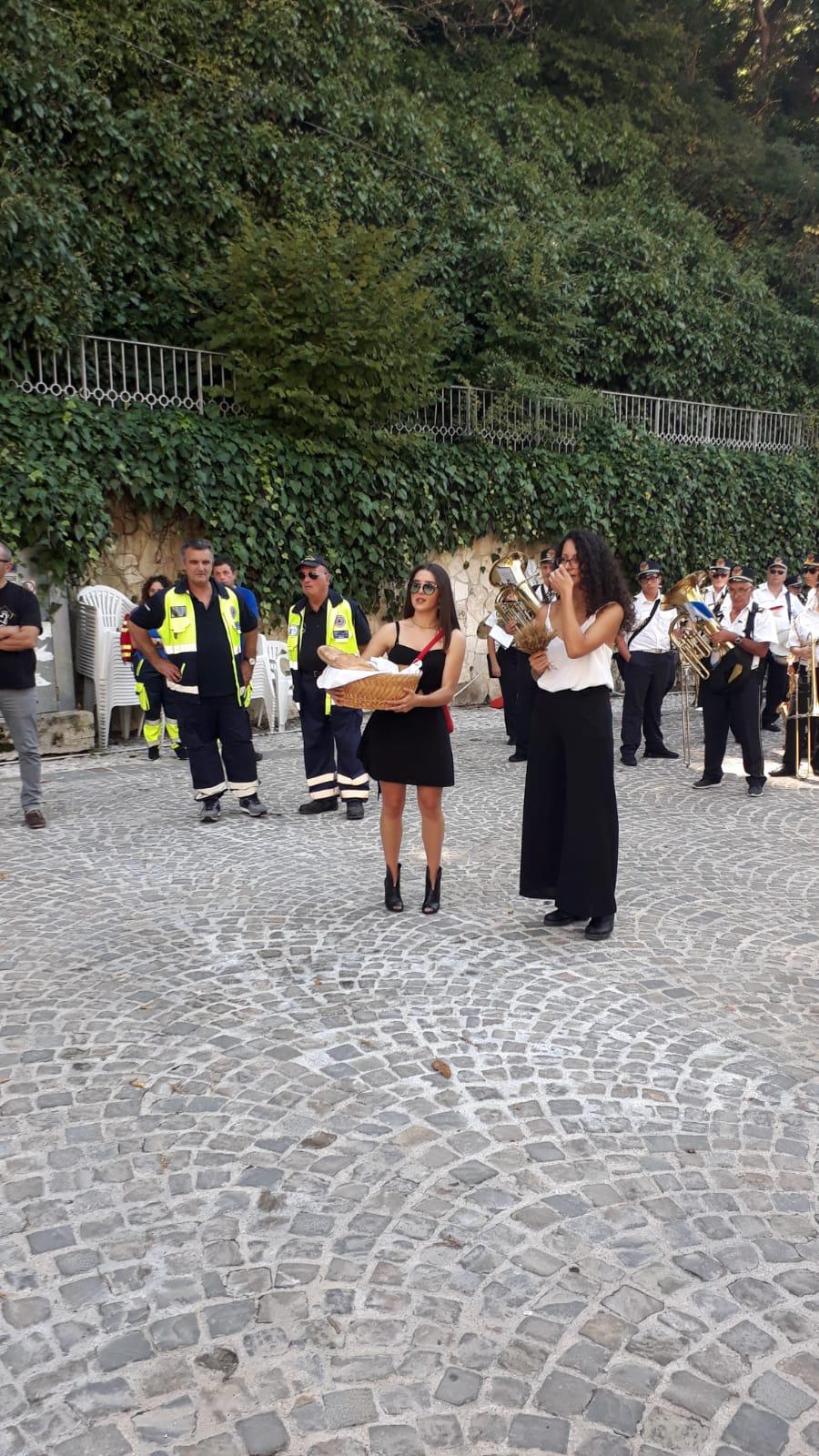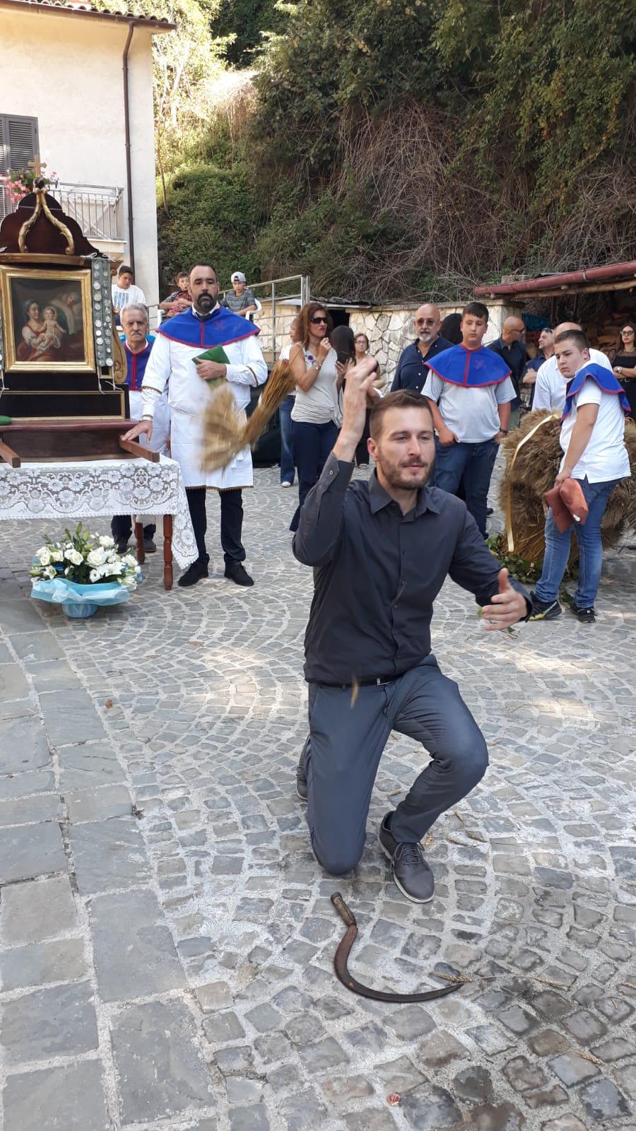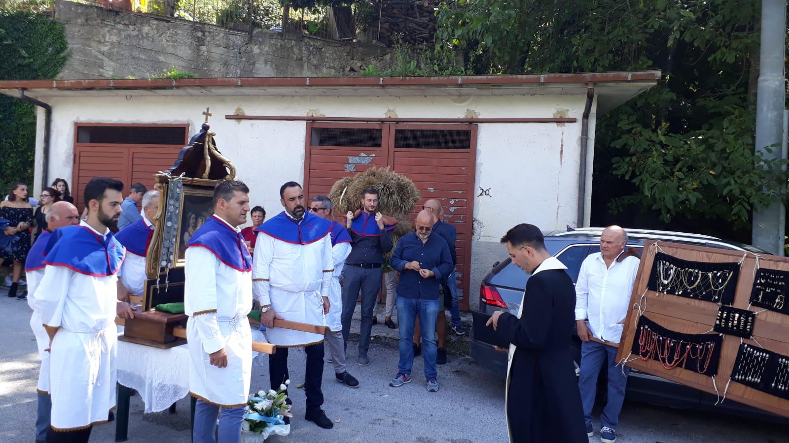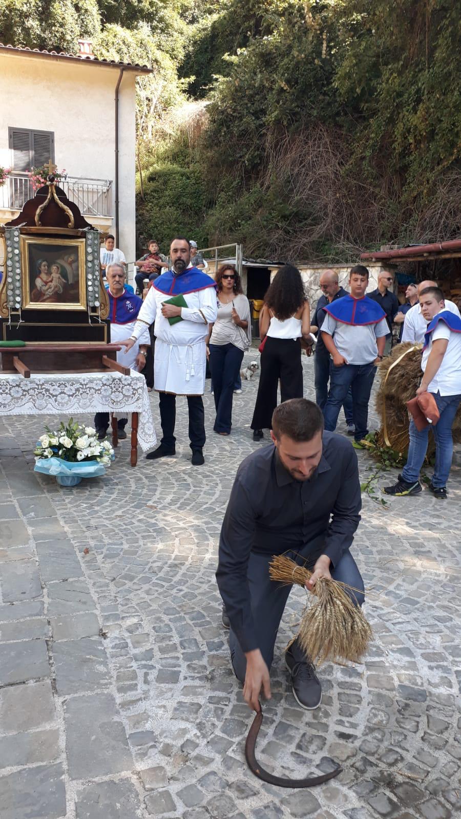 Si organizza da sempre una processione molto partecipata nella quale si rievoca l’accompagnamento della Madonna dal “ Manocchio” che rappresenta il grano che diventa pane offerto.