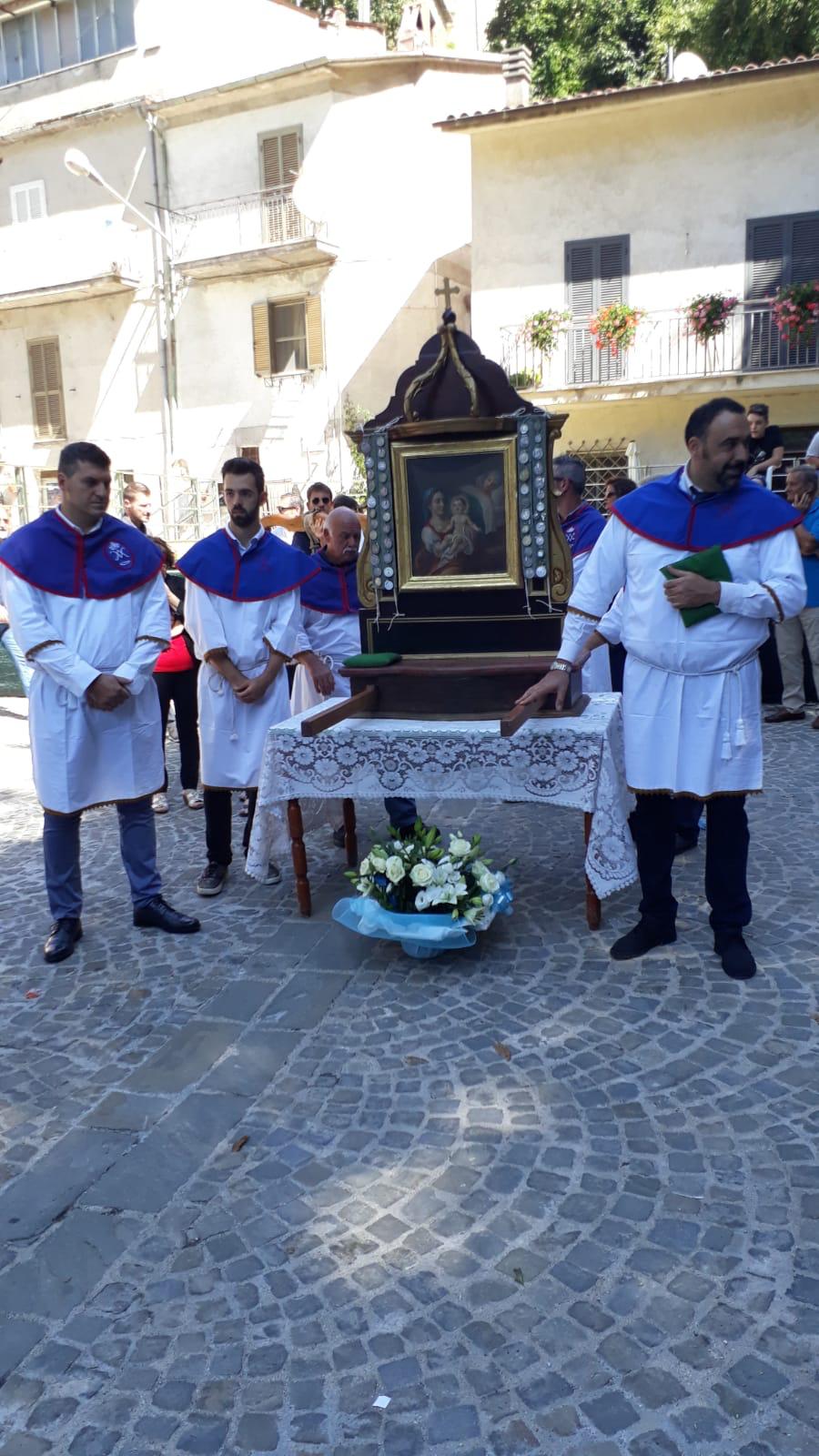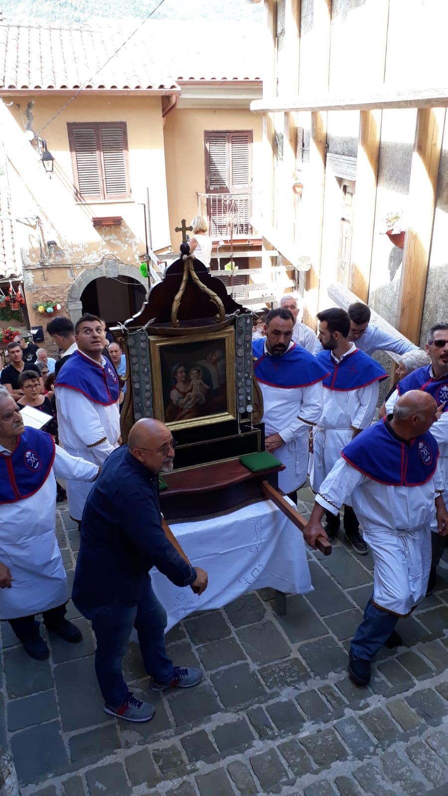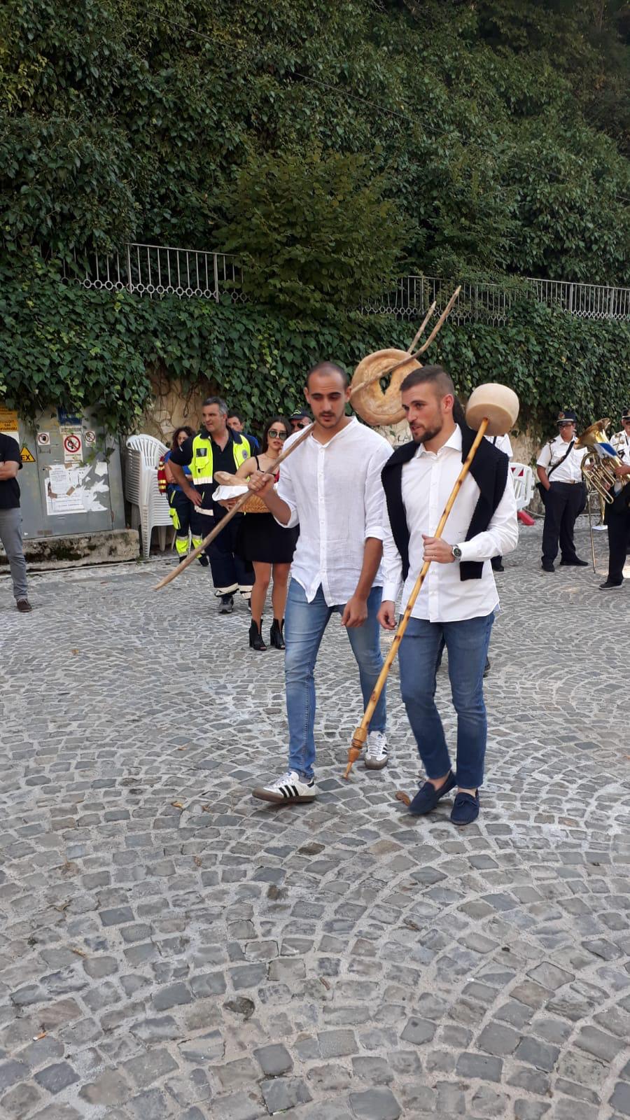 Si organizza da sempre una processione molto partecipata nella quale si rievoca l’accompagnamento della Madonna dal “ Manocchio” che rappresenta il grano che diventa pane offerto.