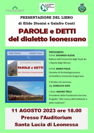 Venerdì 11 agosto alle ore 18 presso l’auditorium Santa Lucia, su corso San Giuseppe a Leonessa, si terrà la presentazione del libro “Parole e Detti del dialetto leonessano” di Elido Dionisi e Galafro Conti.
