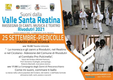 Si conclude sabato 25 settembre, in piazza della scuola a Piedicolle, “Suoni dalla Valle Santa Reatina“, la rassegna di musica, canti e teatro, realizzata dal Comune di Rivodutri, con il contributo oneroso della Regione Lazio e del Mibact, in collaborazione con la locale pro loco.