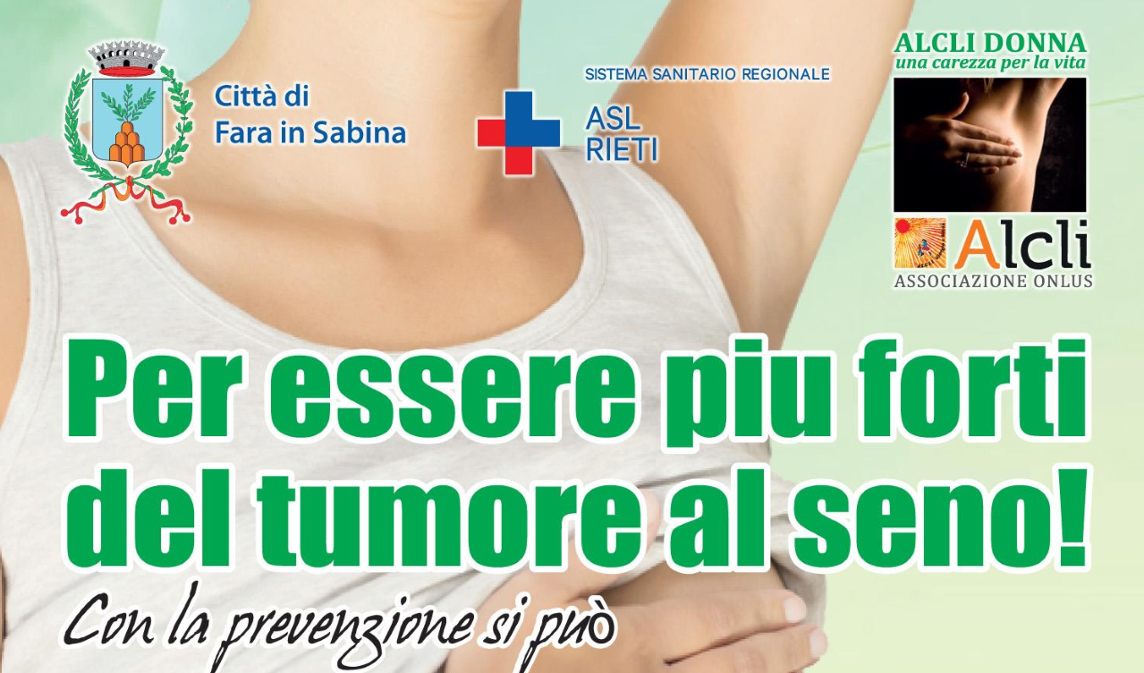 Per questo sabato 25 febbraio, alle ore 15,30, a Passo Corese, comune di Fara Sabina (RI), presso il Polo Didattico, nell’Aula Magna del Liceo Rocci, si terrà un incontro di informazione e sensibilizzazione sul tema della prevenzione necessaria per battere il tumore al seno. L’incontro è anche finalizzato alla raccolta di adesioni per organizzare in zona una seduta di screening.