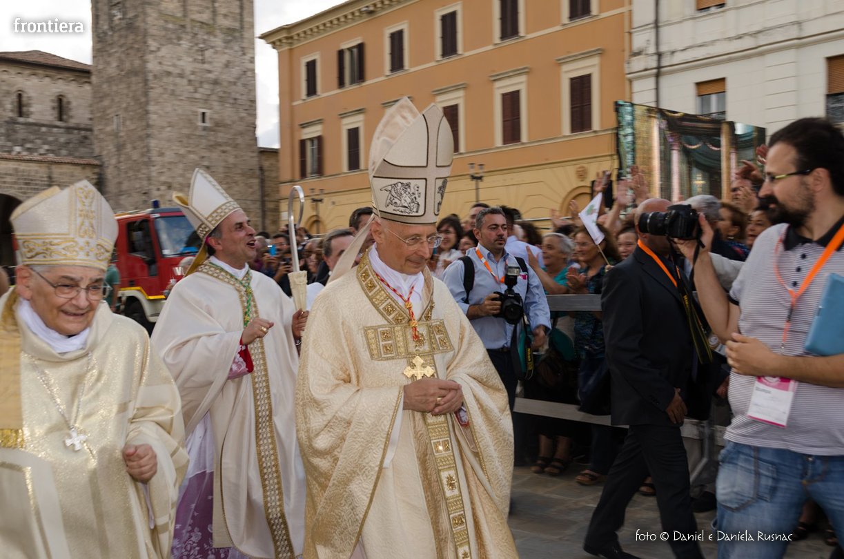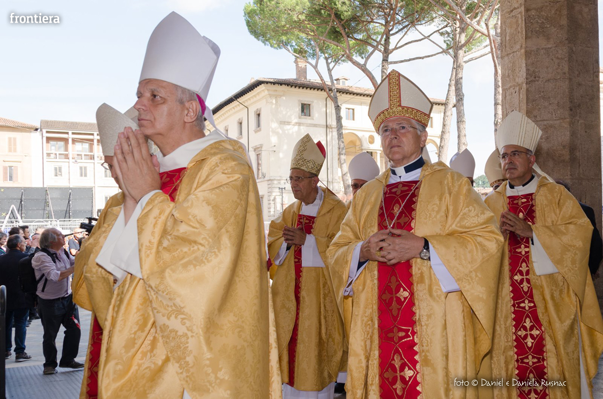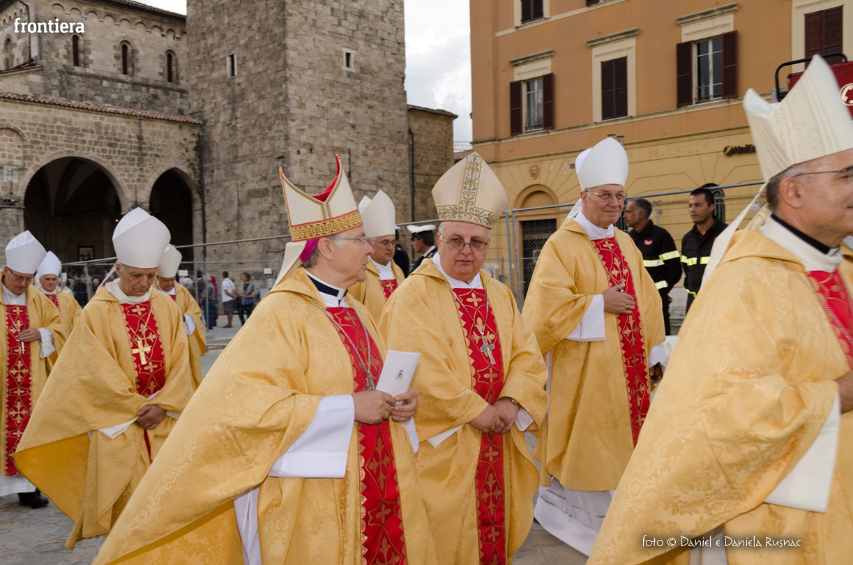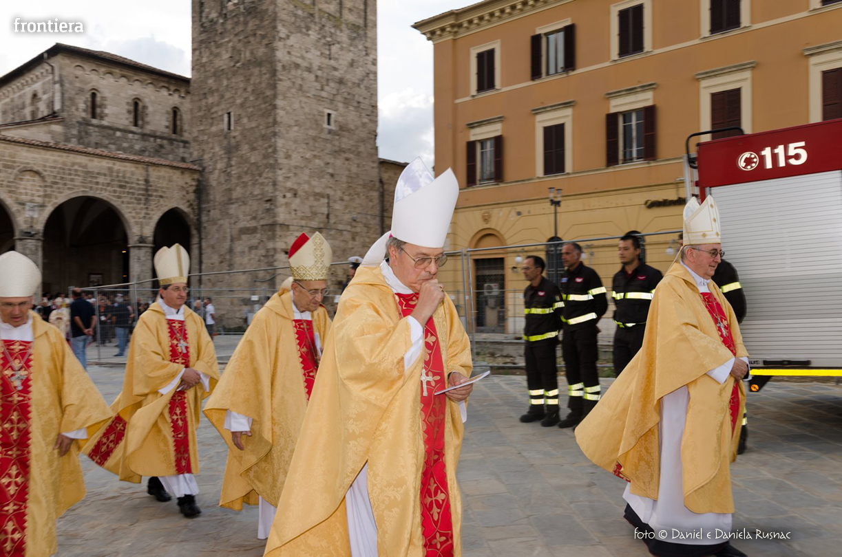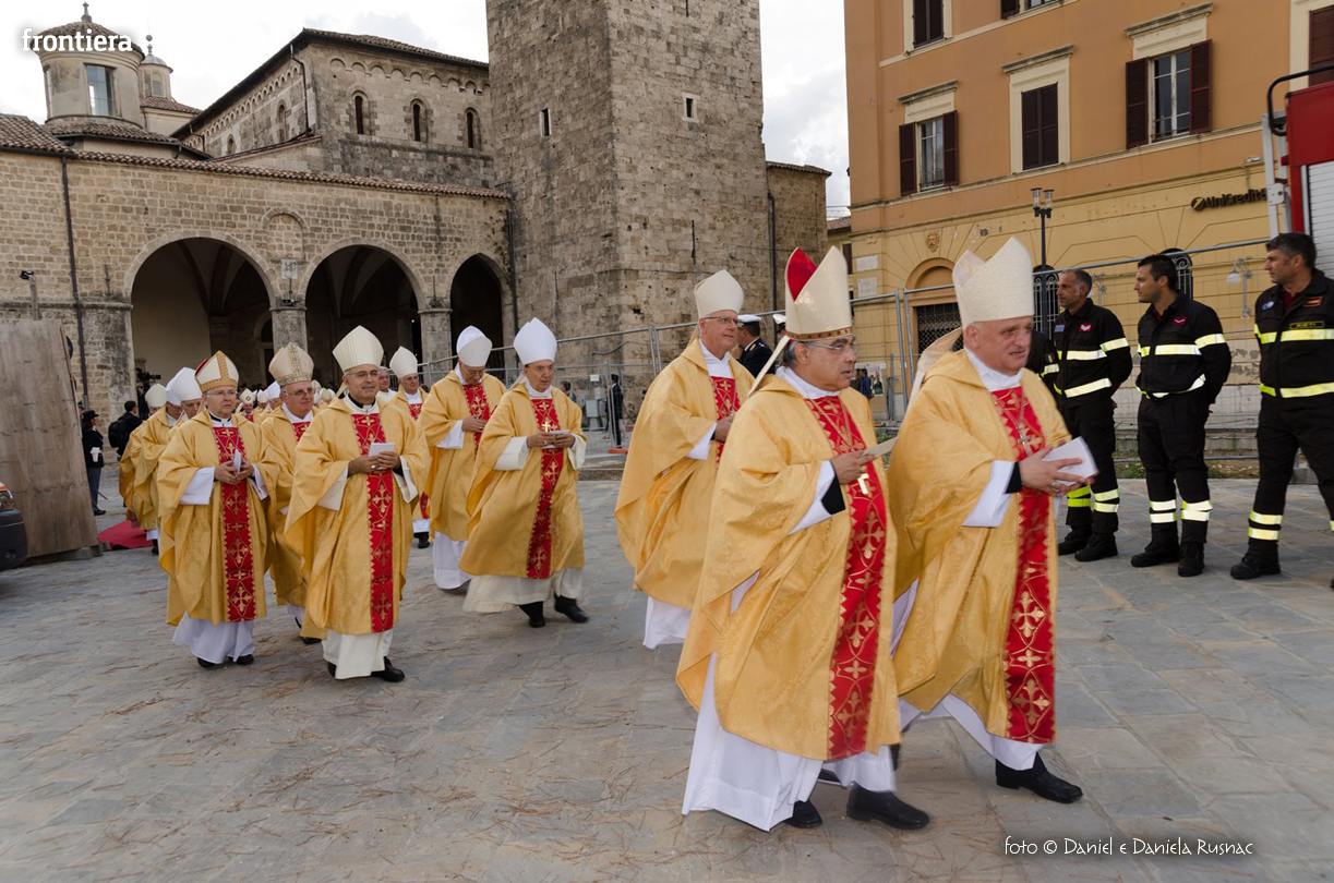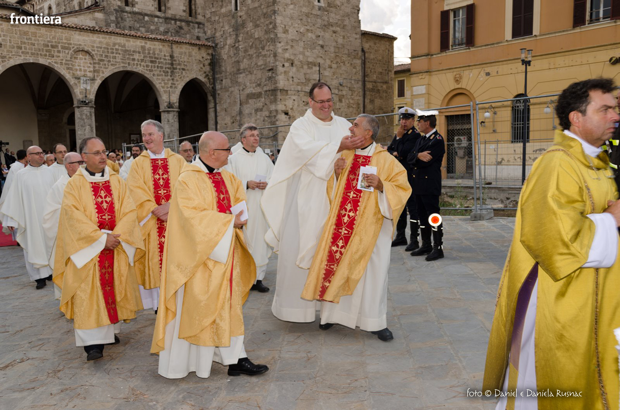 «Riceverai una paternità nuova che ispirerà il tuo modo di pensare e di amare, di guardare il tuo popolo, il tuo clero, la vita», ha aggiunto il cardinal Bagnasco, mentre gli applausi scrocianti salutavano con entusiasmo ed attenzione il neo Pastore, grati al suo predecessore (anche lui, commosso), mons. Delio Lucarelli. In molti sono arrivati dalla diocesi di Anagni-Alatri (Chiesa da cui proviene mons. Pompili, ndr), dalla CEI e dalle zone limitrofe: hanno concelebrato ben quattro cardinali – oltre a Bagnasco, anche il cardinale vicario di Roma, Agostino Vallini, l’arcivescovo di Firenze, Giuseppe Betori, e quello di Perugia-Città della Pieve, Gualtiero Bassetti – numerosi Acivescovi e Vescovi, e un centinaio di sacerdoti.