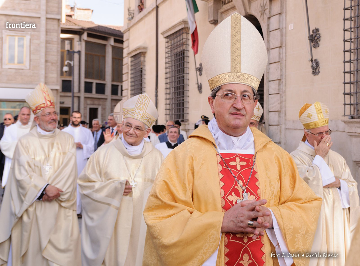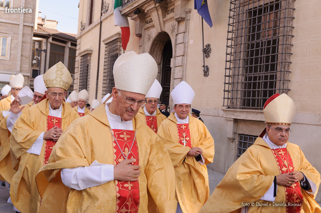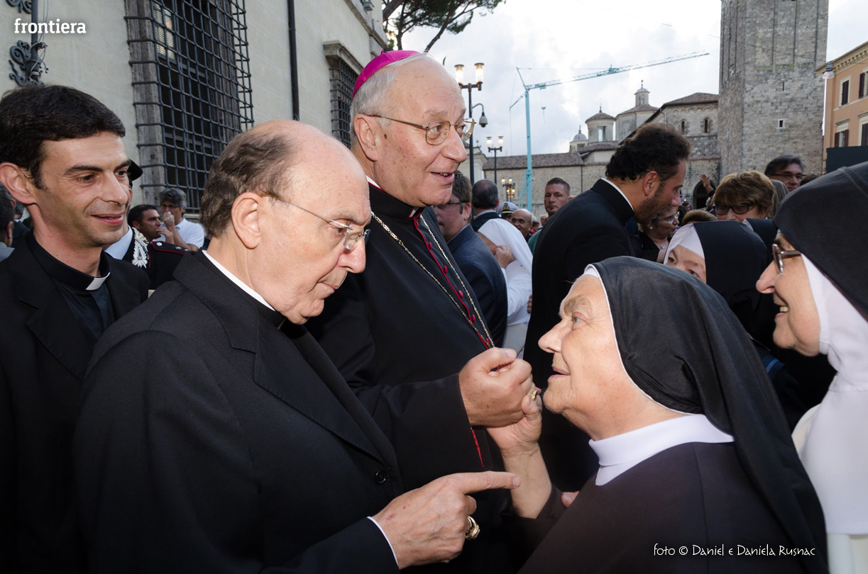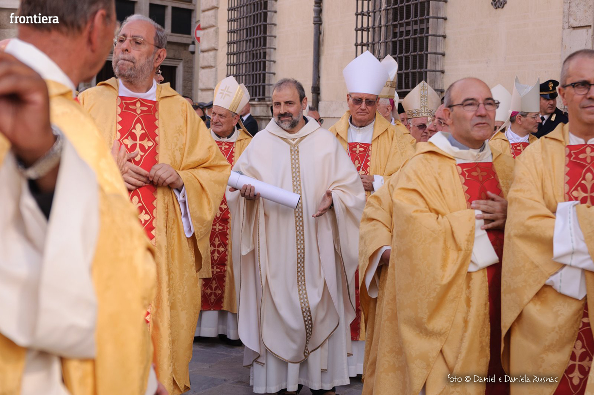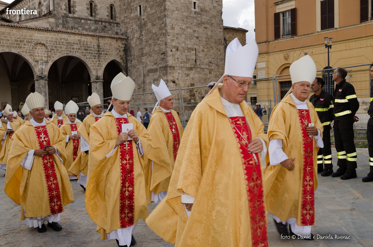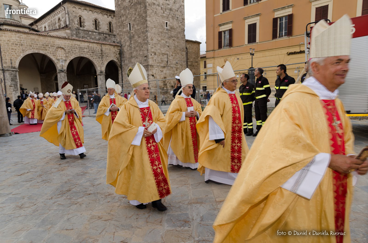 «Riceverai una paternità nuova che ispirerà il tuo modo di pensare e di amare, di guardare il tuo popolo, il tuo clero, la vita», ha aggiunto il cardinal Bagnasco, mentre gli applausi scrocianti salutavano con entusiasmo ed attenzione il neo Pastore, grati al suo predecessore (anche lui, commosso), mons. Delio Lucarelli. In molti sono arrivati dalla diocesi di Anagni-Alatri (Chiesa da cui proviene mons. Pompili, ndr), dalla CEI e dalle zone limitrofe: hanno concelebrato ben quattro cardinali – oltre a Bagnasco, anche il cardinale vicario di Roma, Agostino Vallini, l’arcivescovo di Firenze, Giuseppe Betori, e quello di Perugia-Città della Pieve, Gualtiero Bassetti – numerosi Acivescovi e Vescovi, e un centinaio di sacerdoti.