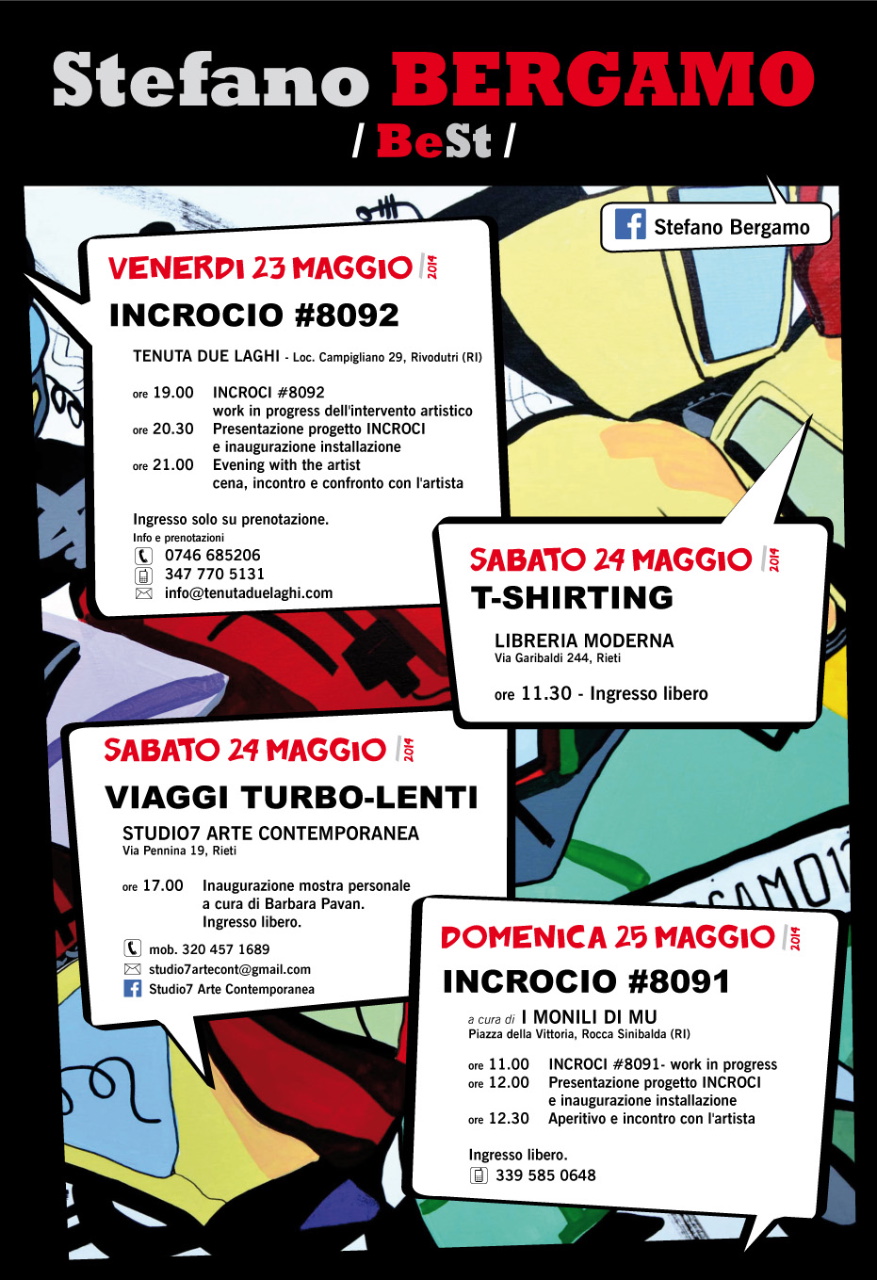 Seconda tappa sabato 24 maggio dalle ore 11.00 presso la Libreria Moderna di via Garibaldi 244, a Rieti, dove, nell’ambito della mostra temporanea allestita nei locali della libreria e del caffè letterario, l’artista illustrerà il progetto Incroci. Ingresso libero.