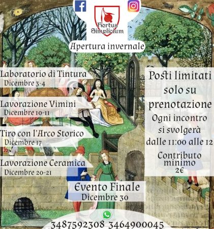 Sabato 3 e domenica 4 dicembre sarà possibile partecipare alla lezione e dimostrazione sulla tintura dei tessuti con pigmenti naturali, sabato 10 e domenica 11 dicembre si parlerà invece dell’intreccio dei vimini. Sabato 17 dicembre lezione di tiro con l’arco storico per principianti, mentre martedì 20 e mercoledì 21 dicembre si terrà il corso di ceramica base.