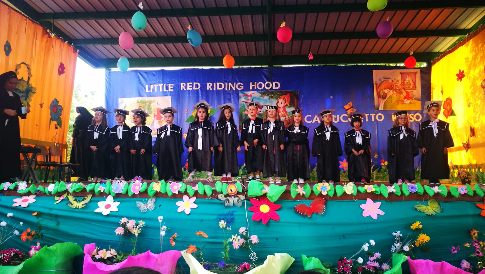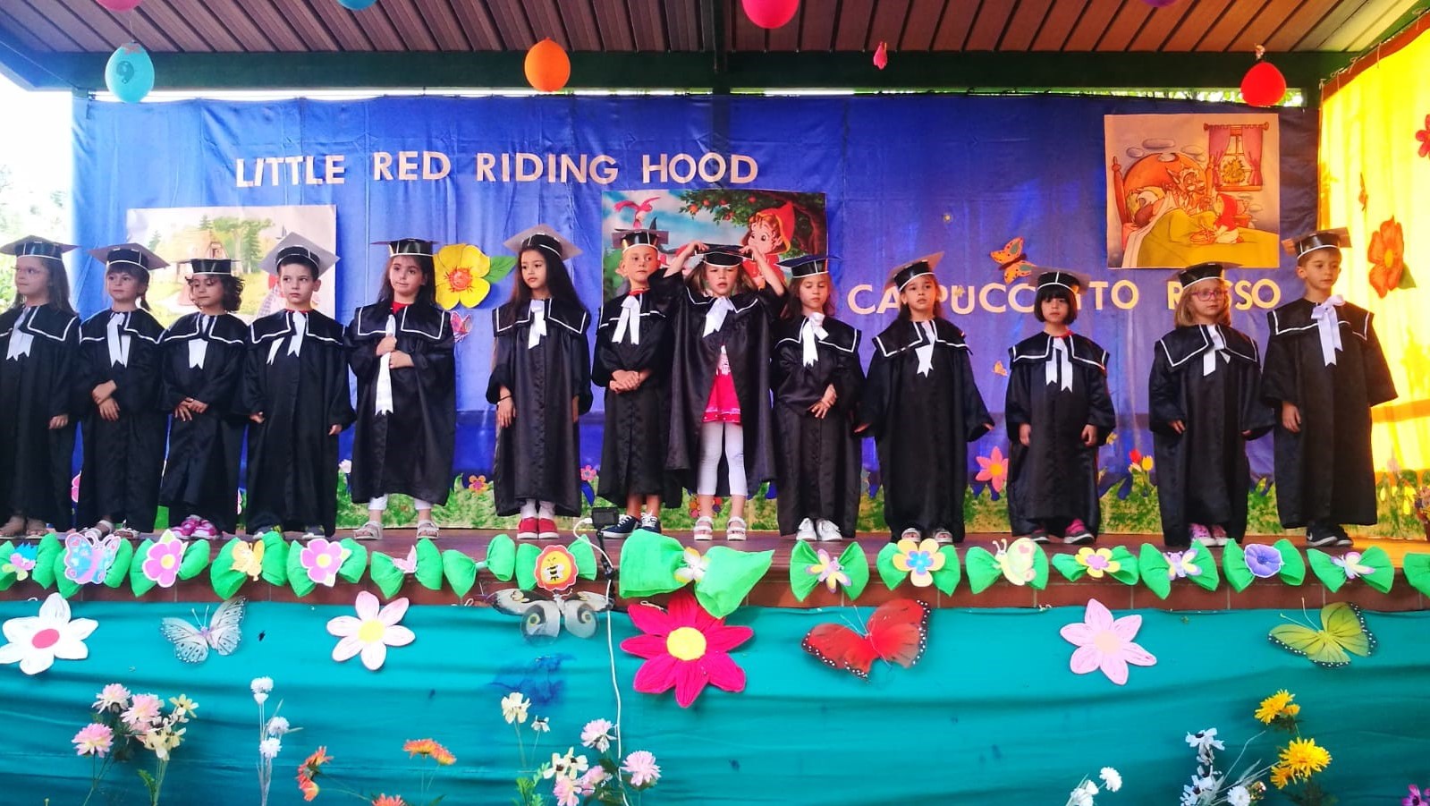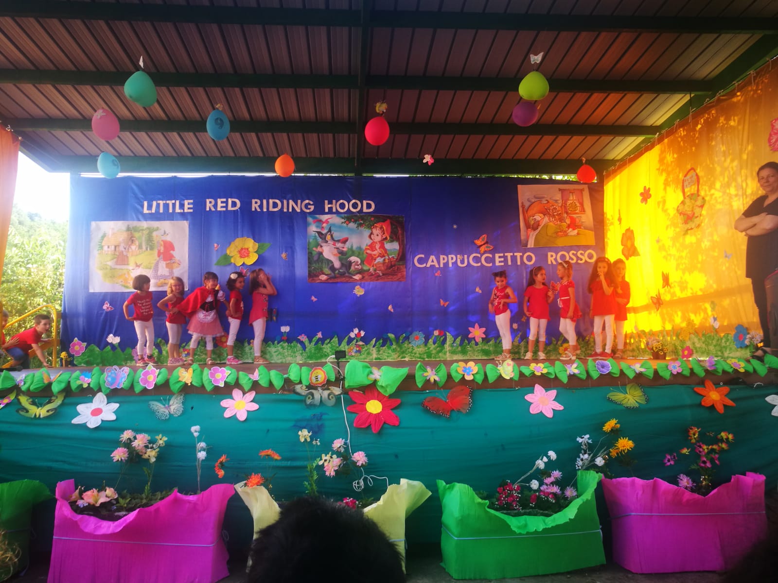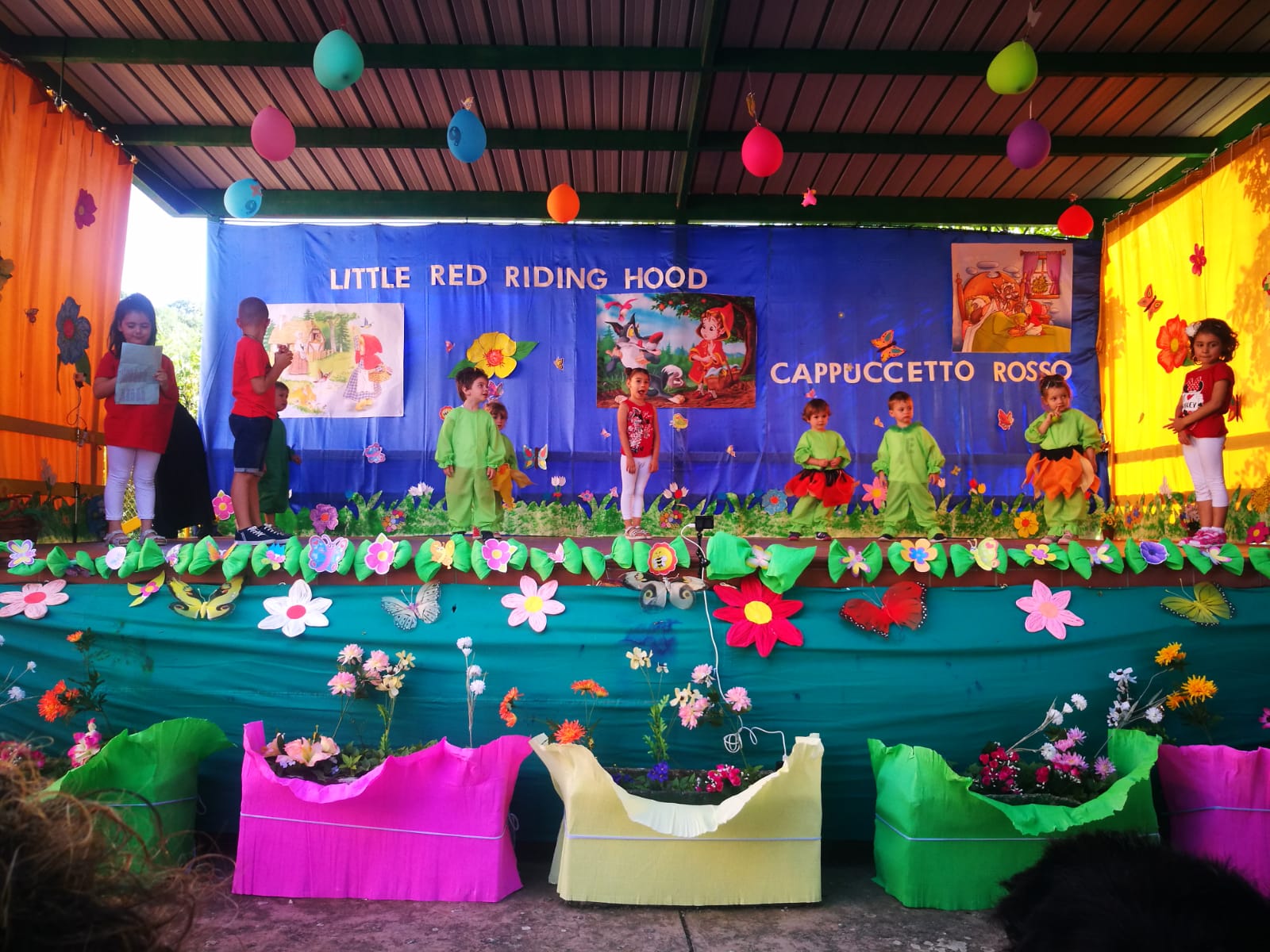 I bambini di 5 anni hanno rappresentato e recitato la favola di Cappuccetto Rosso in lingua inglese, mentre i bambini più piccoli hanno allietato il pubblico dei genitori, dei nonni e degli amici con balli a tema. Gli alunni si sono mostrati preparati e motivati dalle loro insegnanti e dalla maestra di musica Silvia Costanzi, che hanno guidato i bambini nell’esecuzione della recita e nell’allestimento di una coreografia e di una scenografia originali e curate in ogni dettaglio.