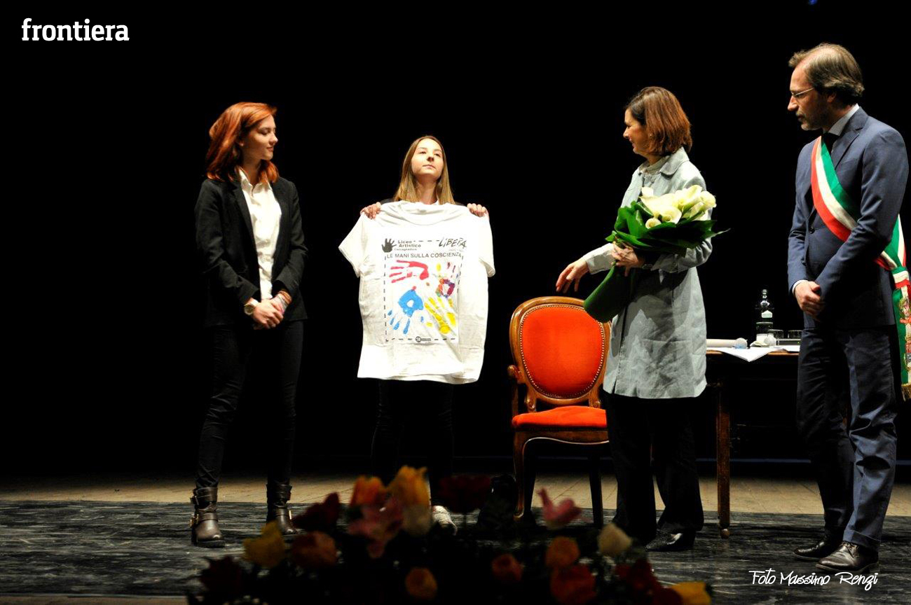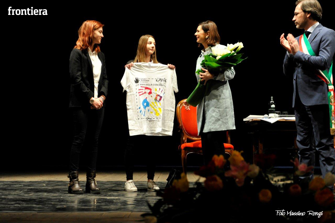 Successivamente le studentesse del liceo artistico Calcagnadoro hanno consegnato al Presidente della Camera una maglietta realizzata da loro. Prima di terminare è stata invitata sul palco Vanda Pollastrini, nipote di Elettra, che ha con emozione ricordato la figura della zia.