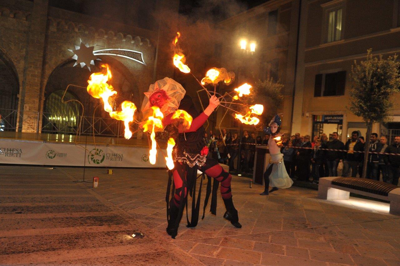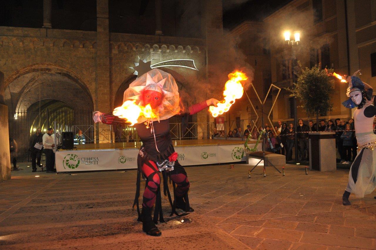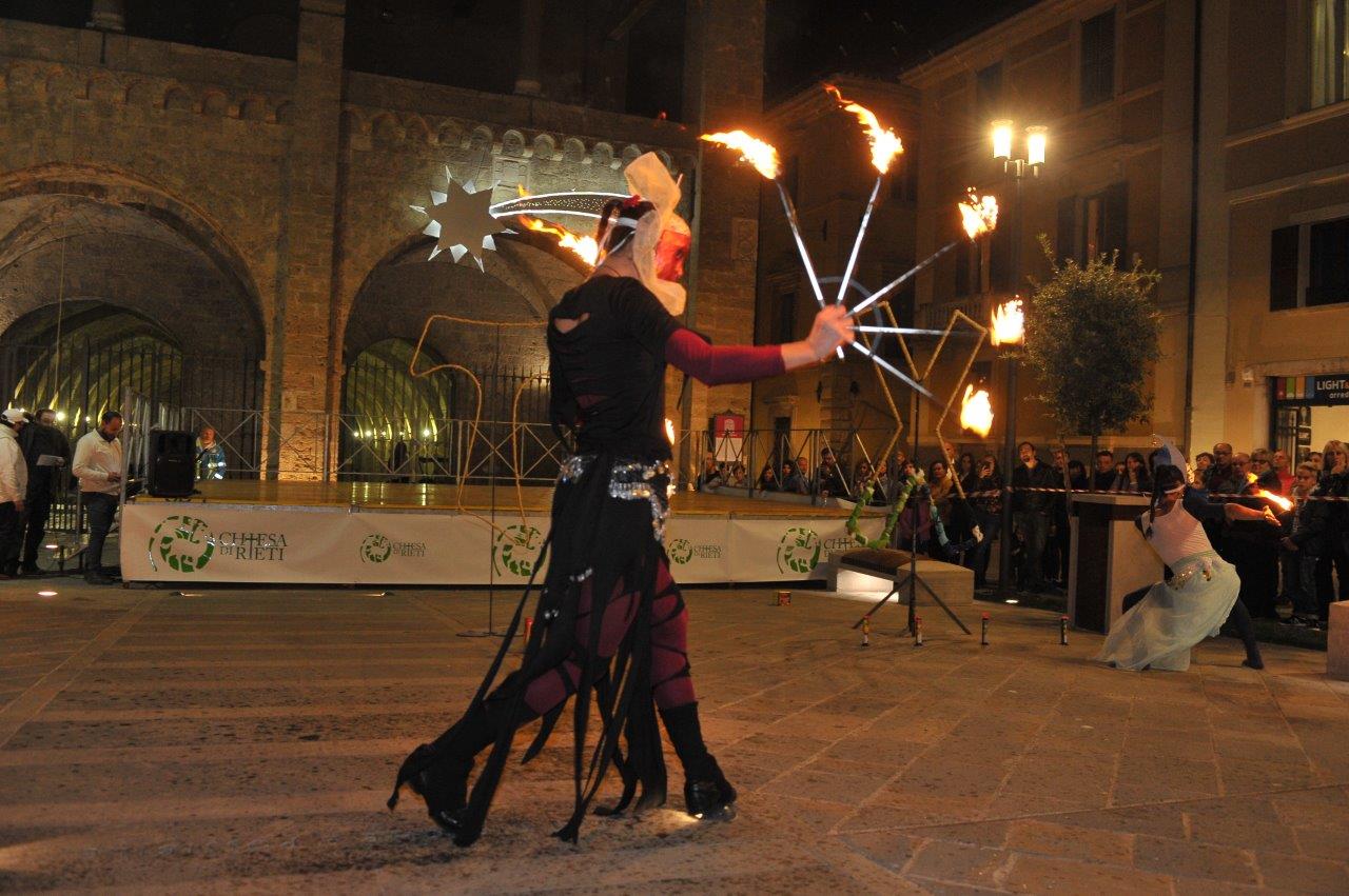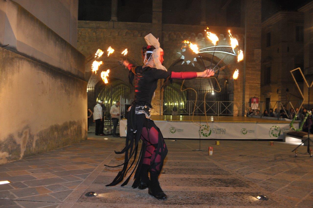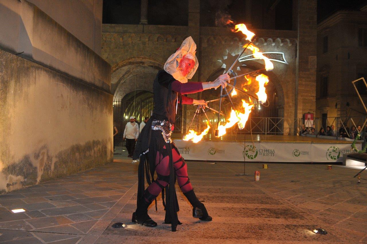 L’esibizione di giocoleria con il fuoco è stata curata dalla Compagnia di San Giovanni e dalla Confraternita di Misericordia di Rieti.