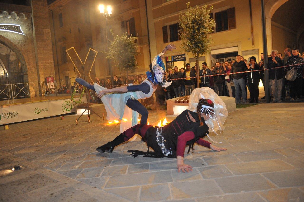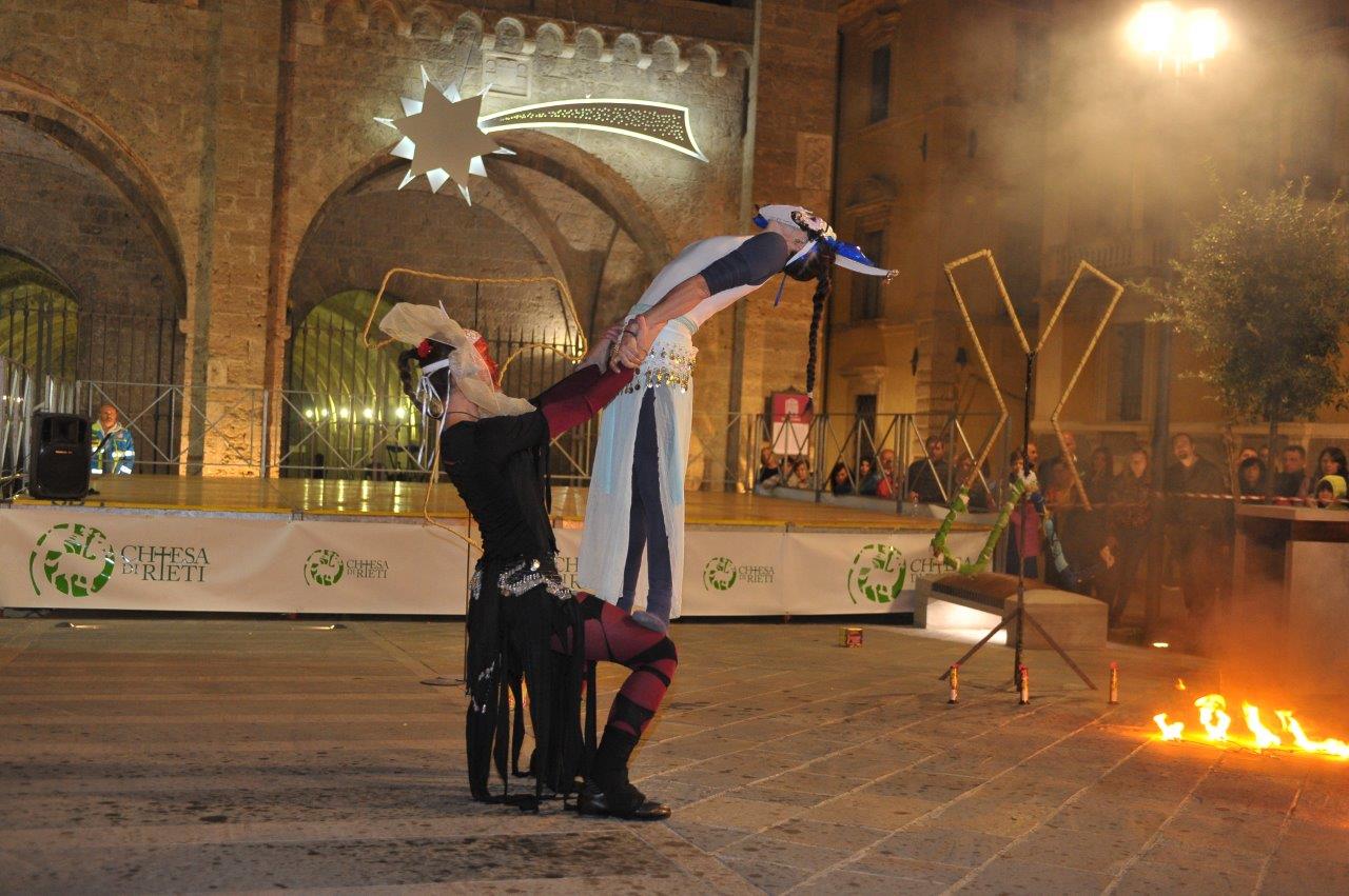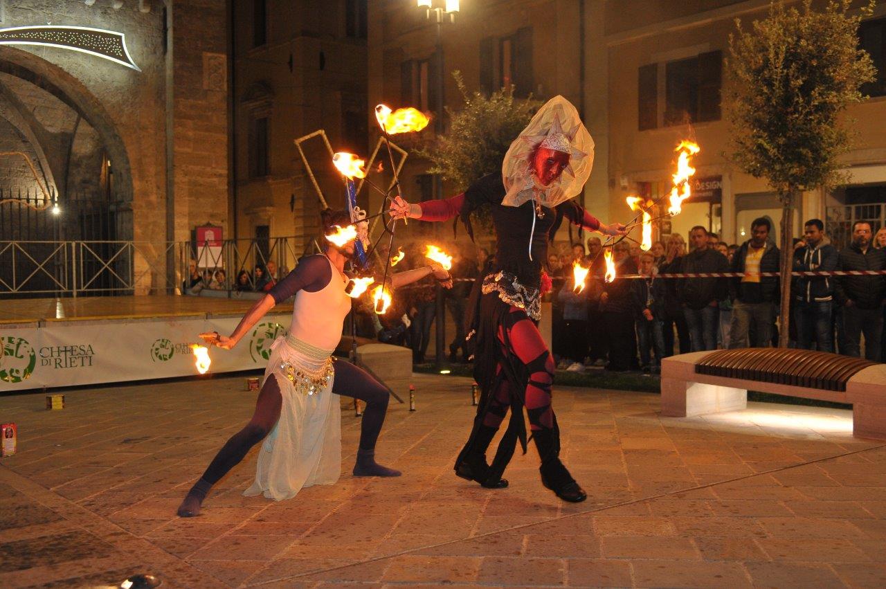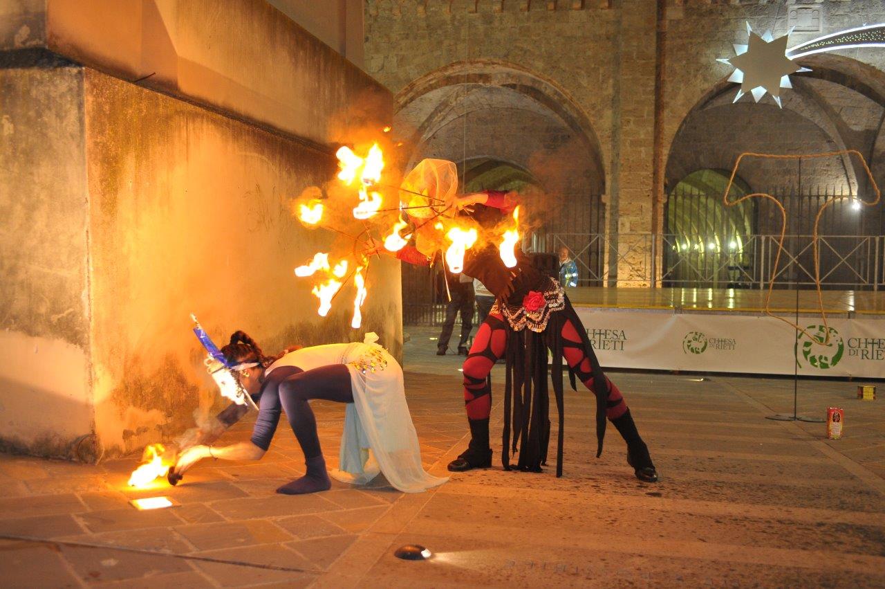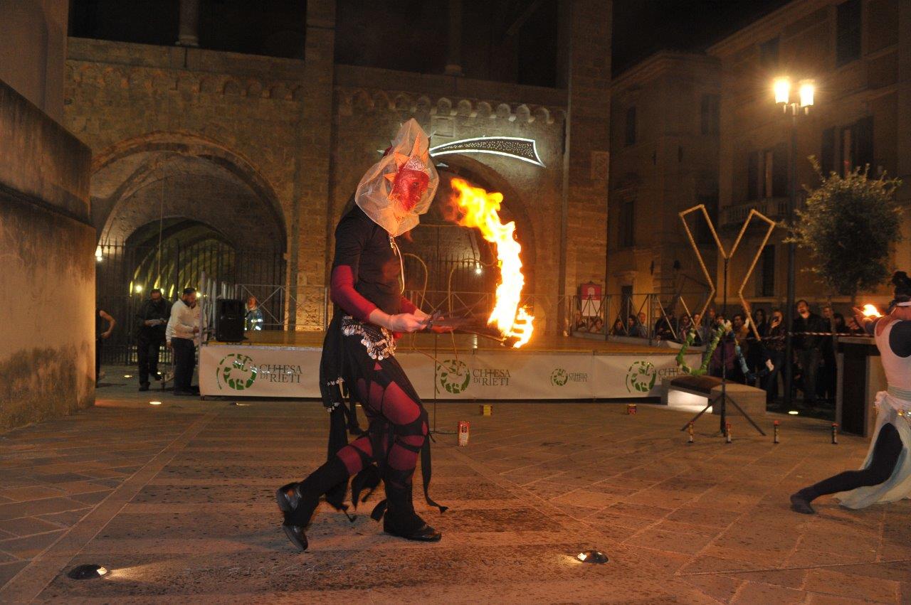 L’esibizione di giocoleria con il fuoco è stata curata dalla Compagnia di San Giovanni e dalla Confraternita di Misericordia di Rieti.
