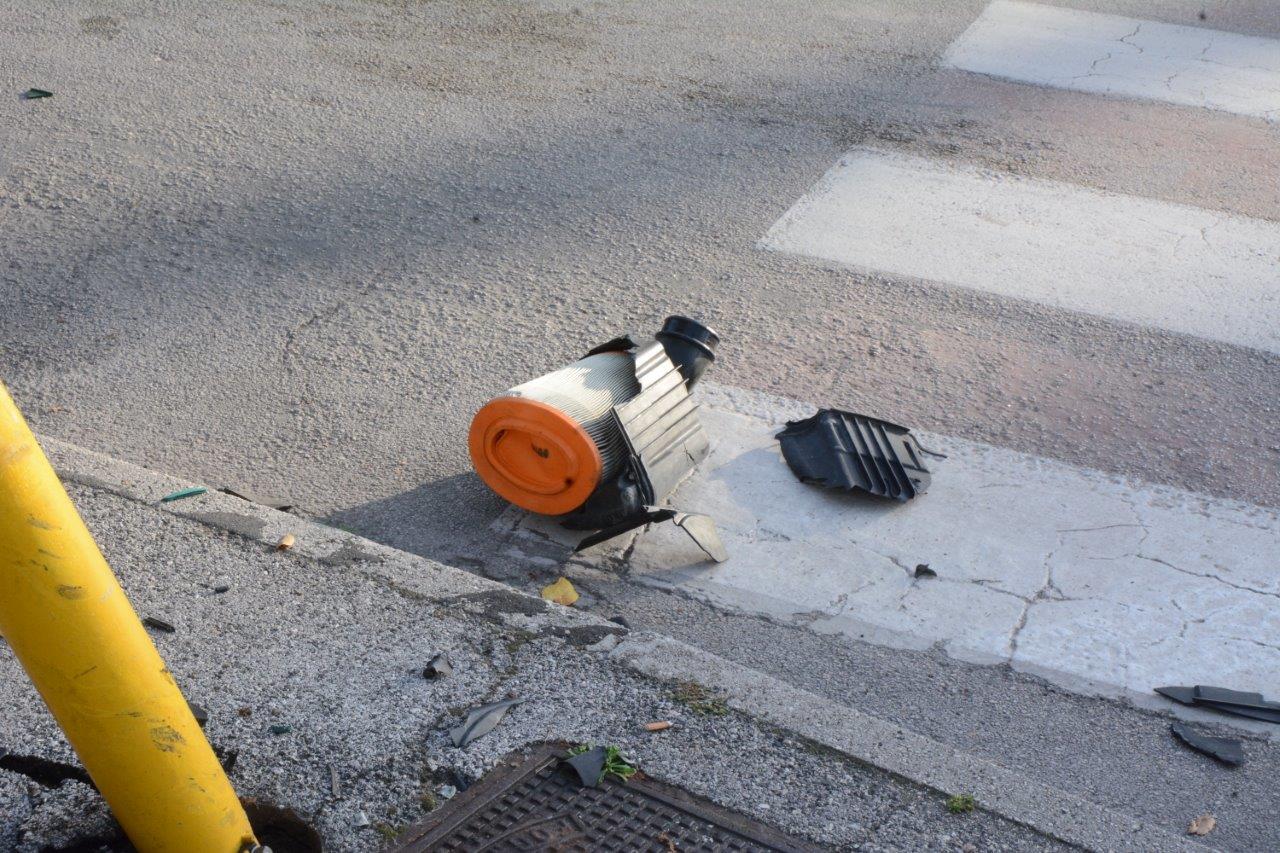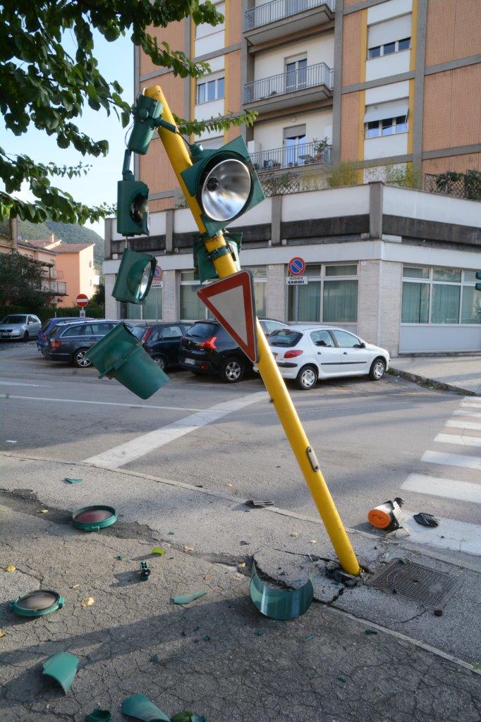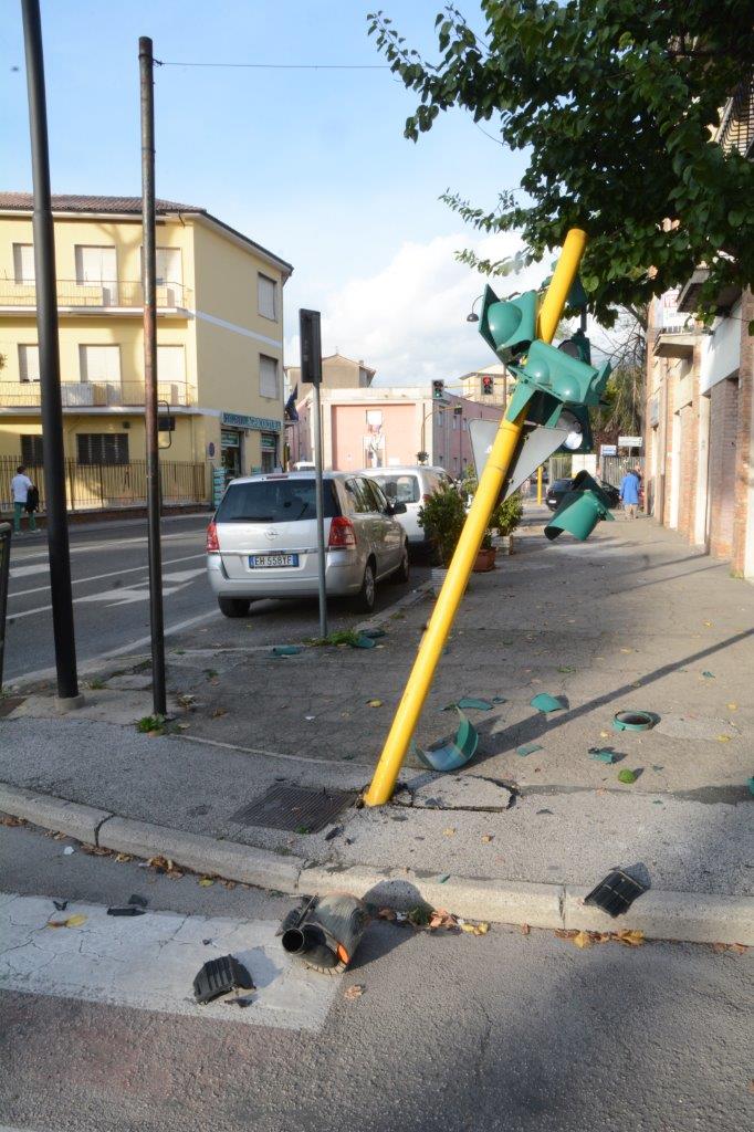 Un’automobile ha colpito in pieno il semaforo di via Matteotti, all’incrocio con via Salaria, all’altezza di Piazza della Repubblica, distruggendolo e perdendo anche qualche pezzo.