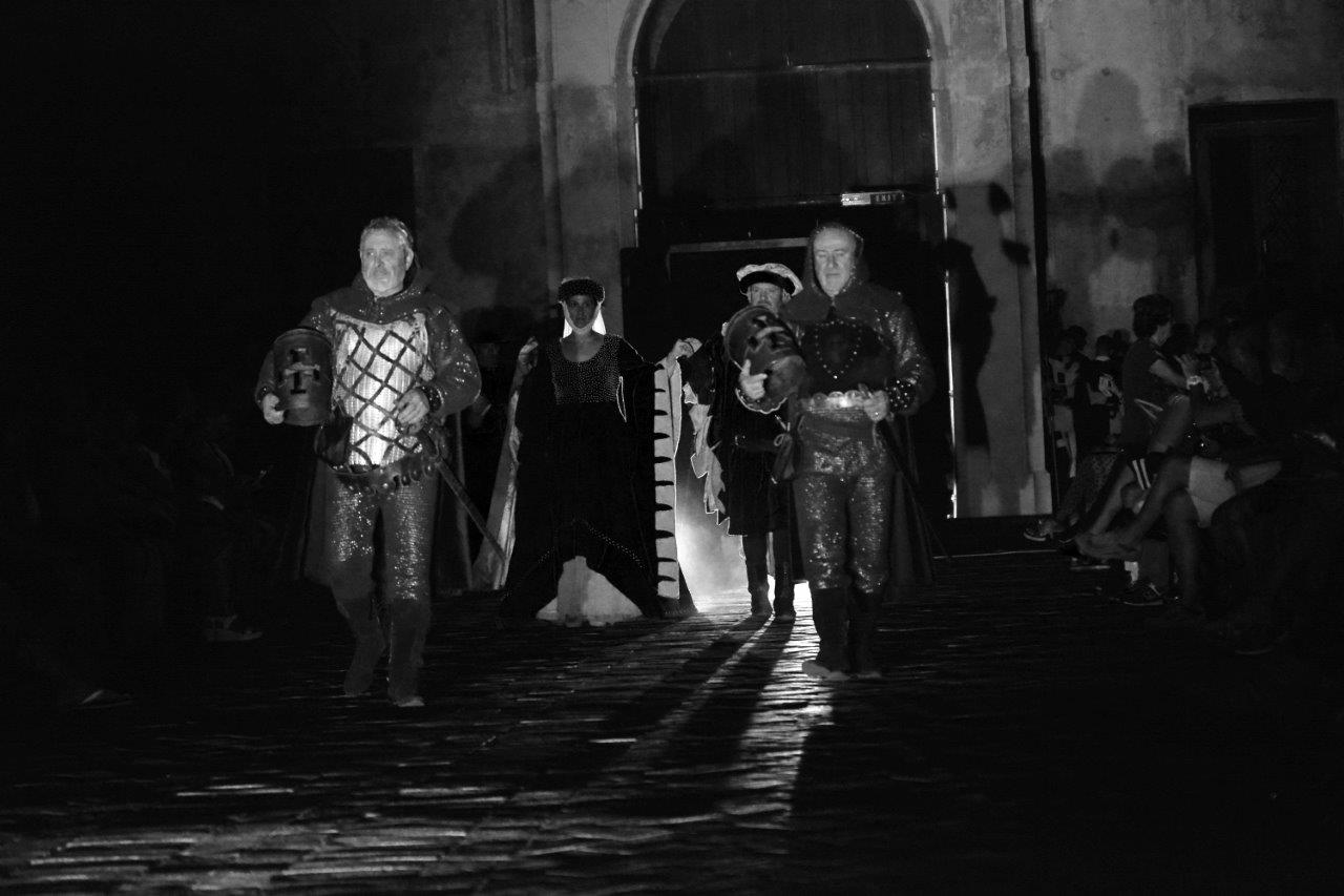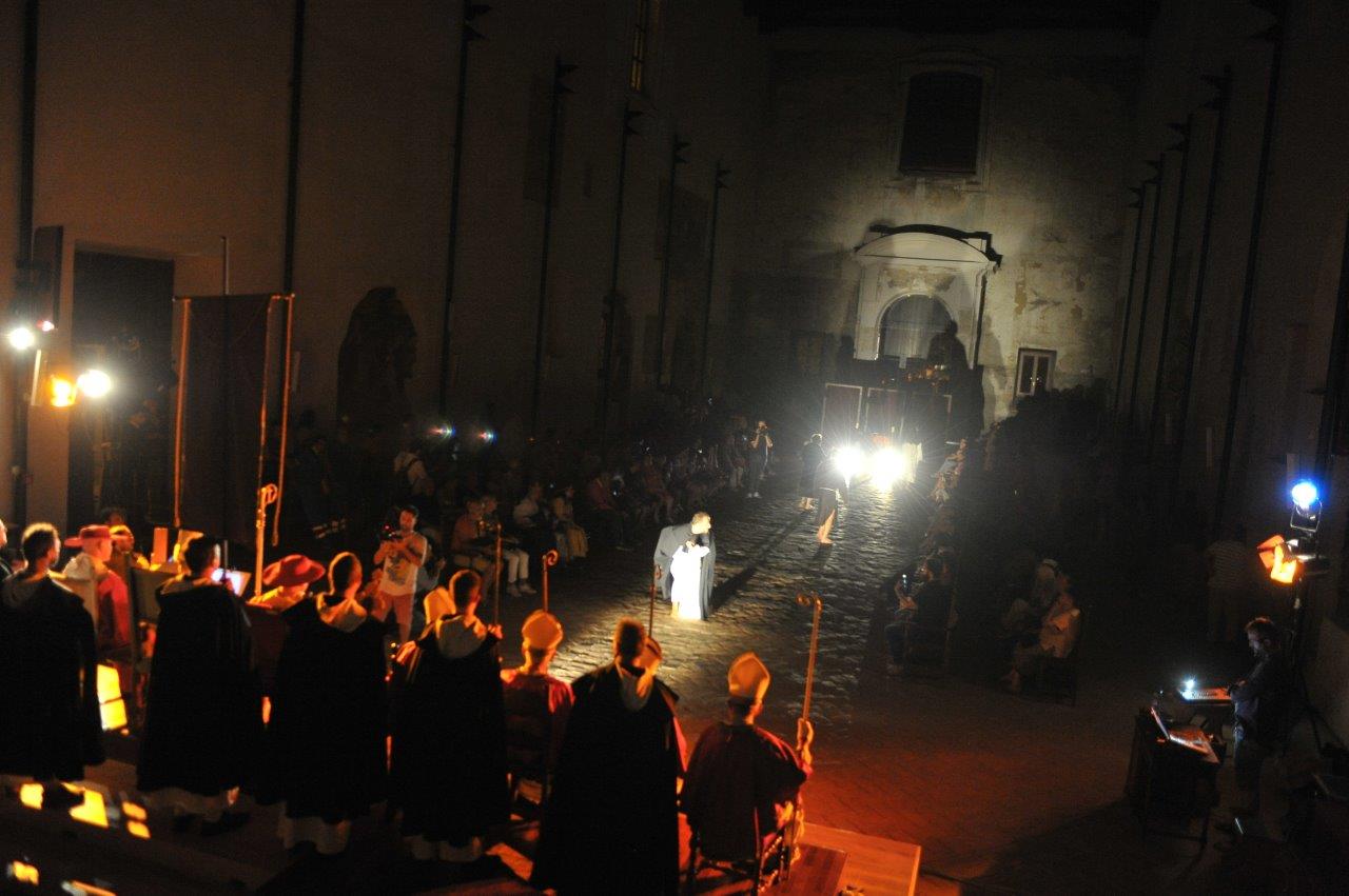 La scenografia era ridotta ai minimi termini: giusto il trono del Papa, e i posti per corte pontificia. Il resto lo ha composto il pubblico, che ha trovato posto su quattro file di sedie, sistemate a coppie contrapposte. Un modo per delimitare lo spazio scenico, ma anche per immergere lo spettatore nella rappresentazione, per farlo assistere ai fatti “da dentro”.