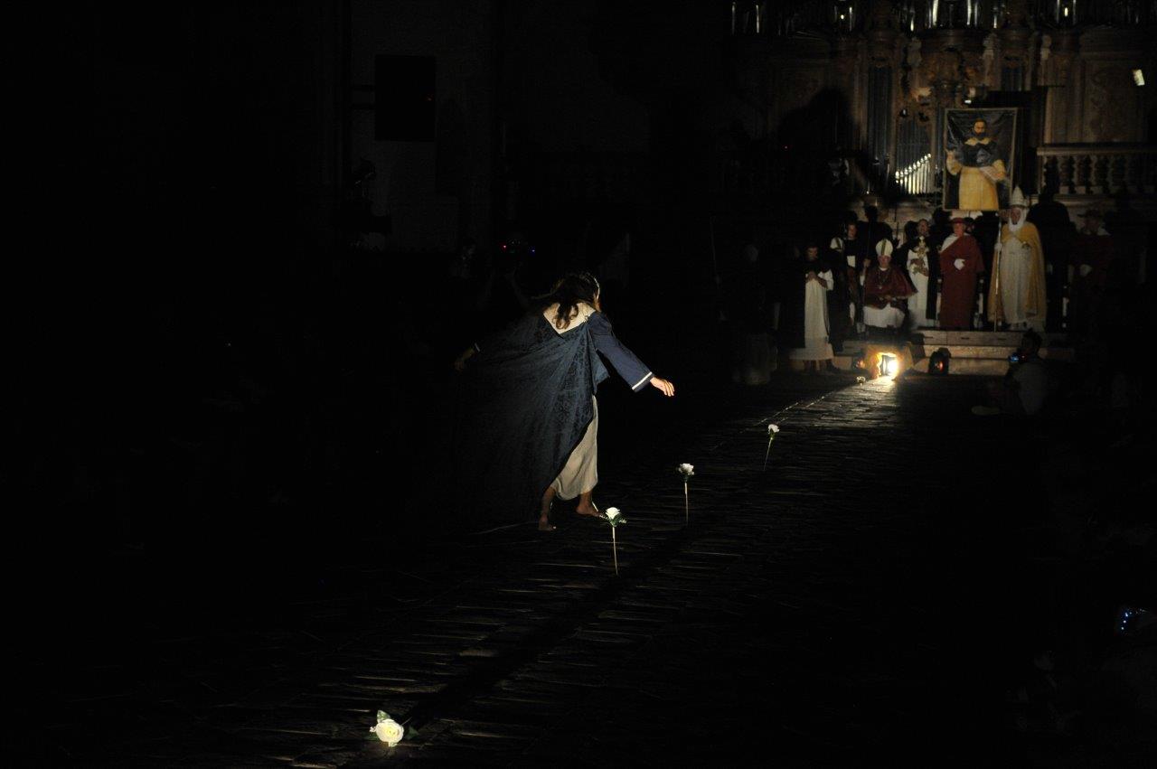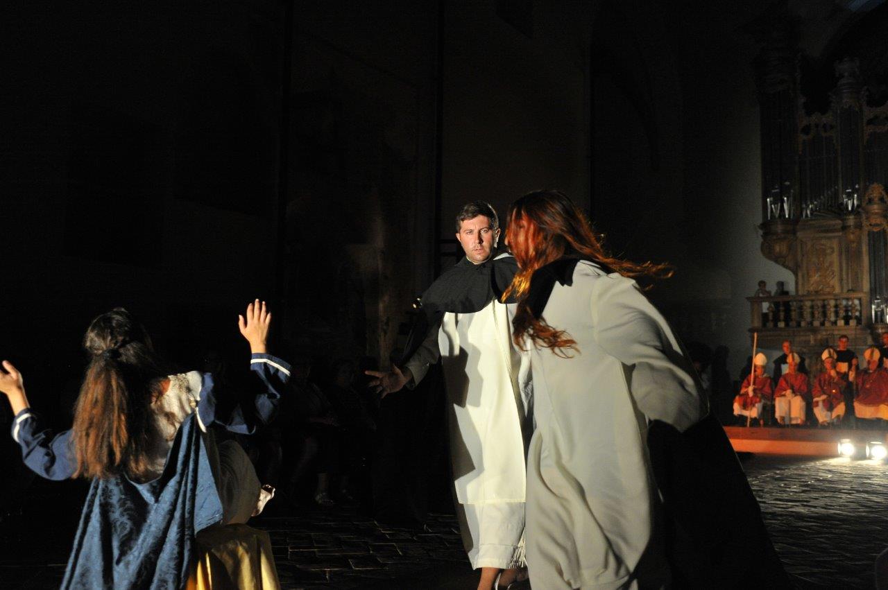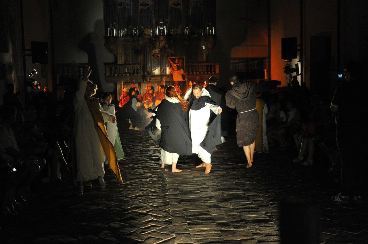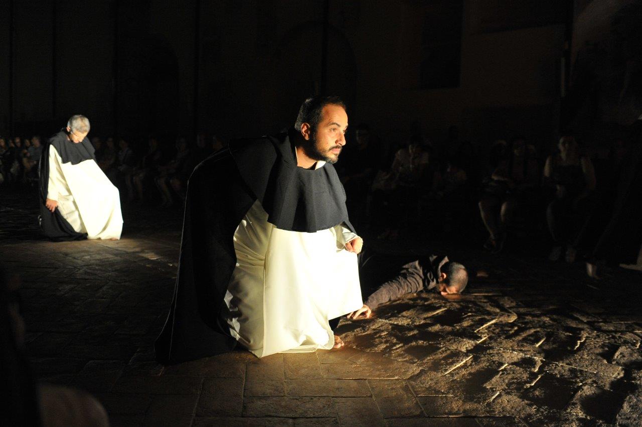 La trasposizione scenica è stata infatti giocata sul contrappunto delle voci e dei movimenti degli attori, su un uso misurato della musica e della danza, e sulla personificazione in due figure femminili dell’anima di san Domenico e del diavolo, che prova a sedurre il religioso o a introdurre inciampi nel suo cammino.