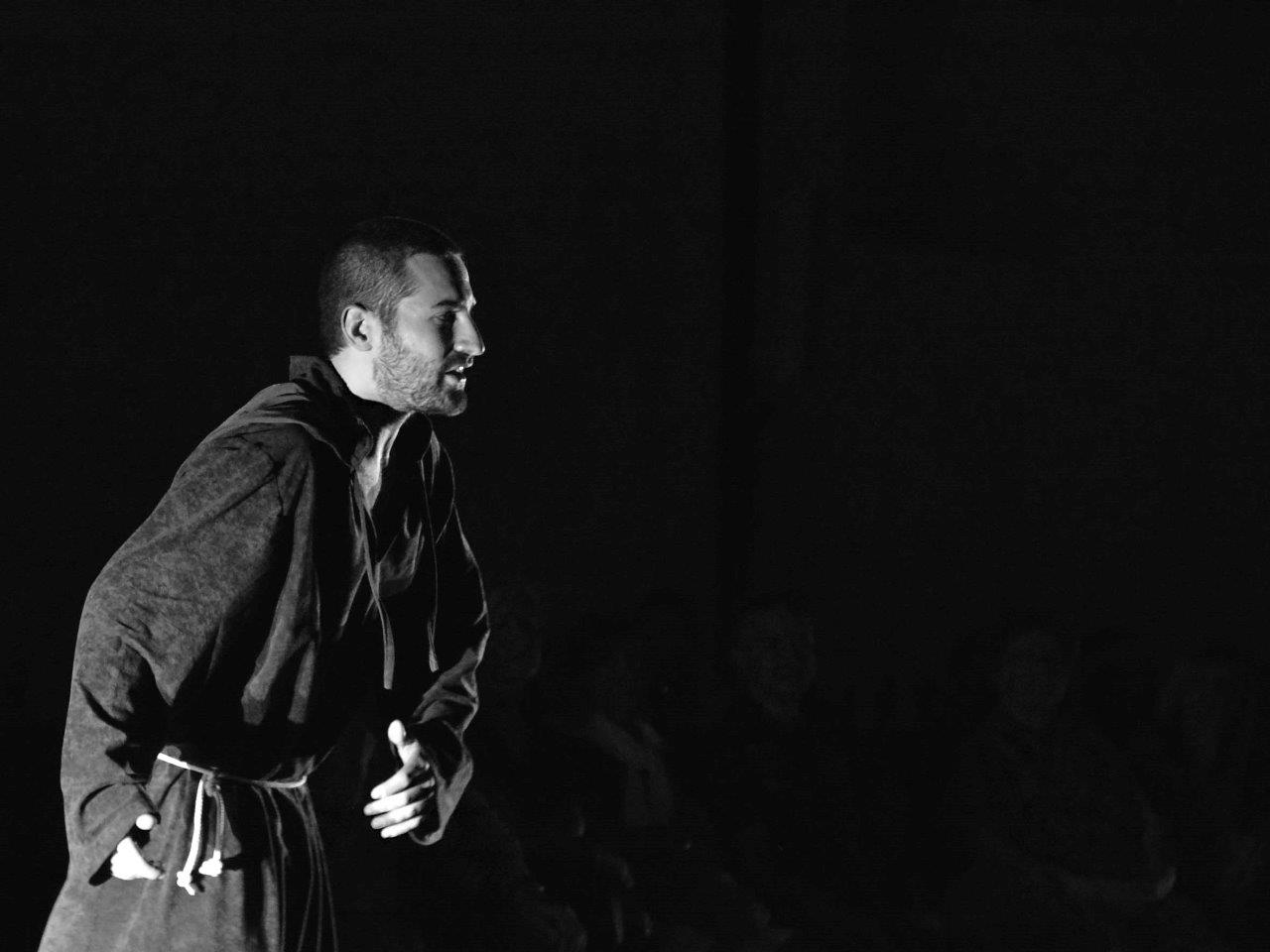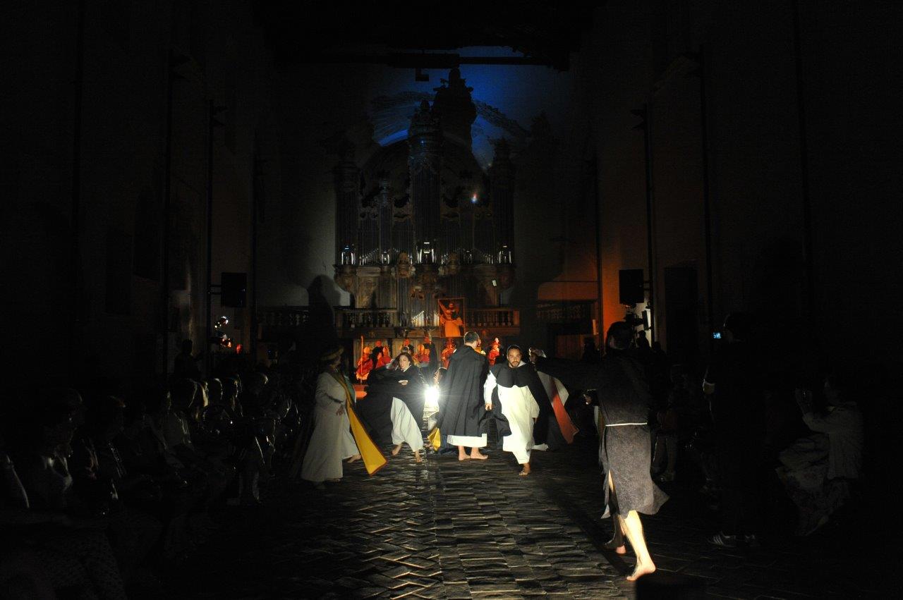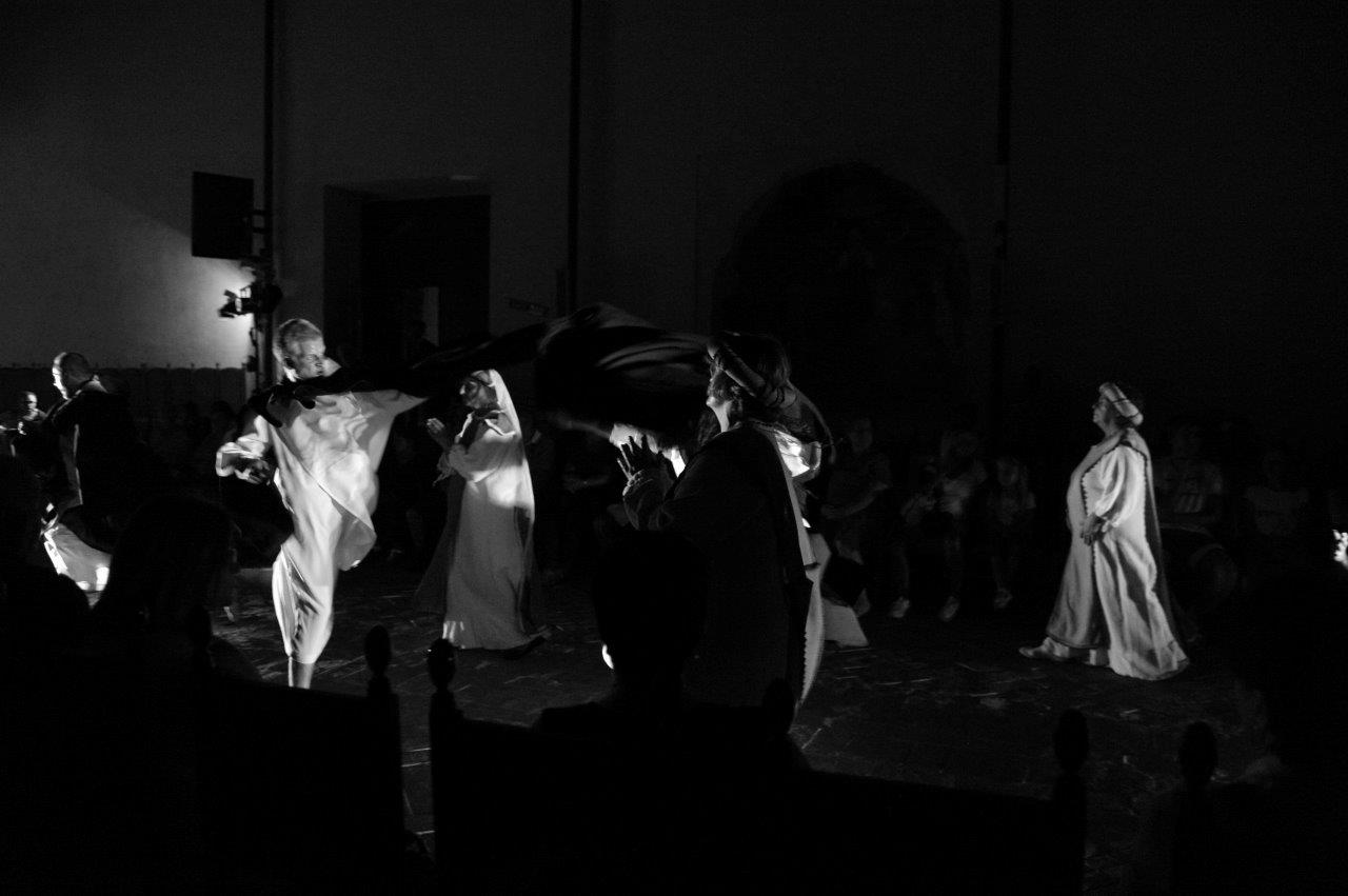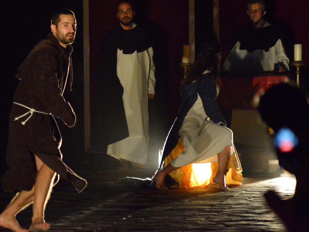 La trasposizione scenica è stata infatti giocata sul contrappunto delle voci e dei movimenti degli attori, su un uso misurato della musica e della danza, e sulla personificazione in due figure femminili dell’anima di san Domenico e del diavolo, che prova a sedurre il religioso o a introdurre inciampi nel suo cammino.