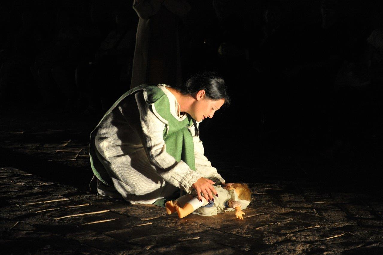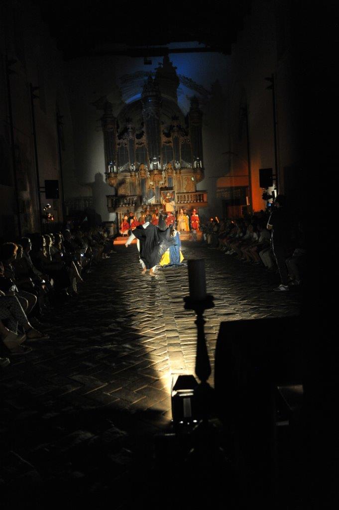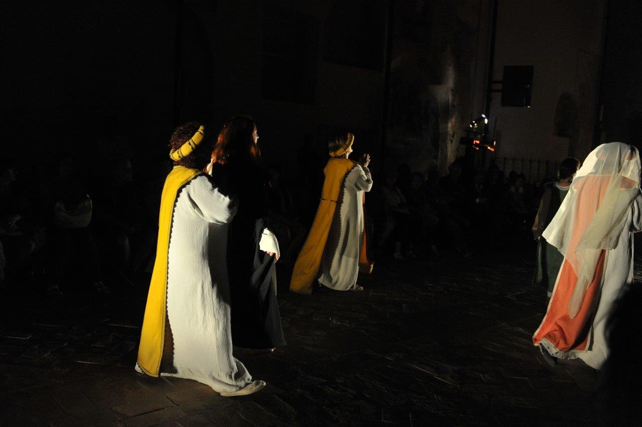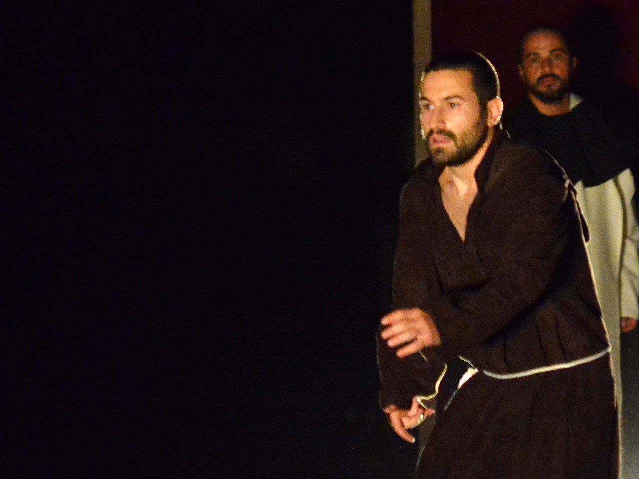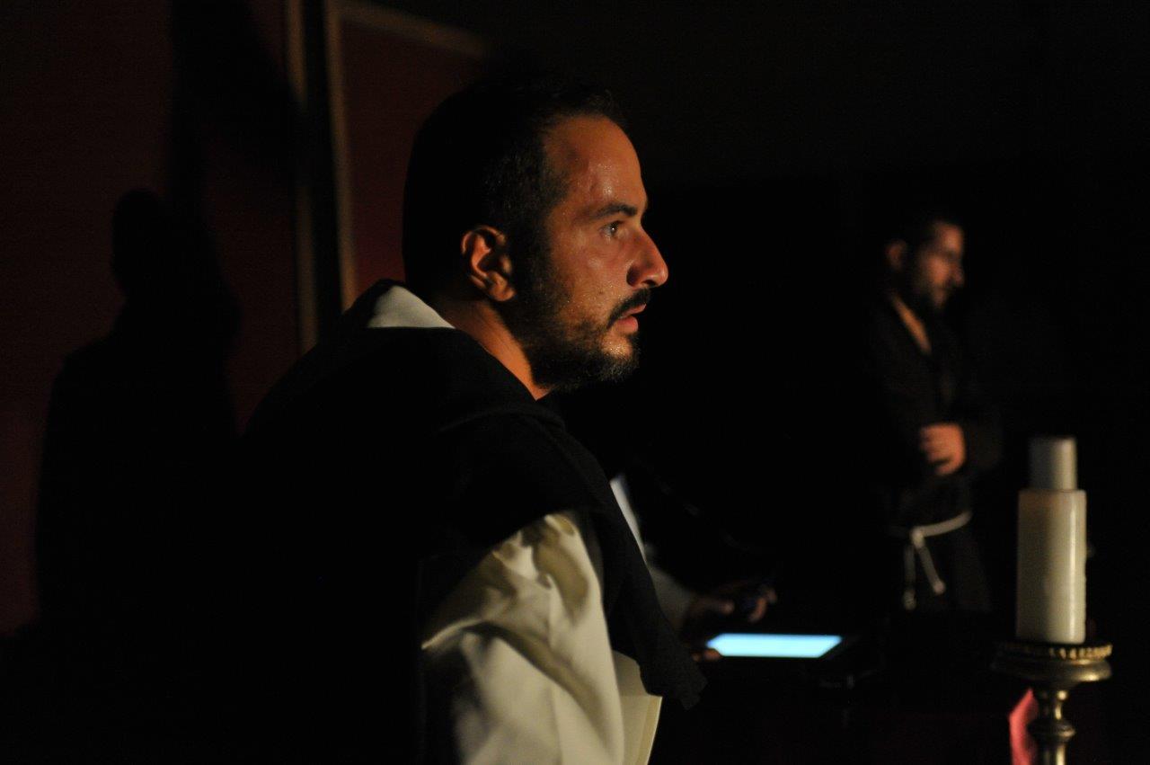 La trasposizione scenica è stata infatti giocata sul contrappunto delle voci e dei movimenti degli attori, su un uso misurato della musica e della danza, e sulla personificazione in due figure femminili dell’anima di san Domenico e del diavolo, che prova a sedurre il religioso o a introdurre inciampi nel suo cammino.