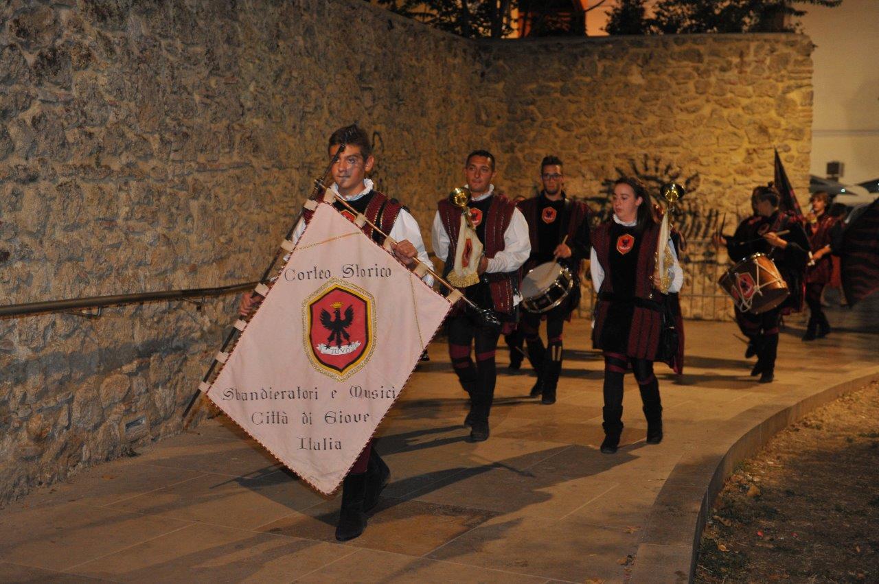 Tutto ha inizio con l’ingresso di papa Gregorio IX, pontefice cui si devono tre canonizzazioni fortemente legate a Rieti: quella di Francesco di Assisi, nel 1228, quella di Antonio di Padova, nel 1232, e quella, appunto, di Domenico di Guzman, nel 1234. Nella messa in scena, il Santo Padre è preceduto da un lungo corteo. Per l’evento si sono date convegno «persone di ogni età; e il piccolo v’è col grande, e il servo col libero»: sono gli stessi reatini, vestiti secondo l’uso del tempo. A dare il ritmo alla processione – partita oltre Velino e giunta in San Domenico attraverso il centro storico – sono stati il Gruppo Sbandieratori e Musici della Città di Sangemini e il Gruppo Sbandieratori e Musici della Città di Giove, che durante il tragitto e alla fine della rappresentazione hanno offerto un ulteriore spettacolo di musica e giocoleria.