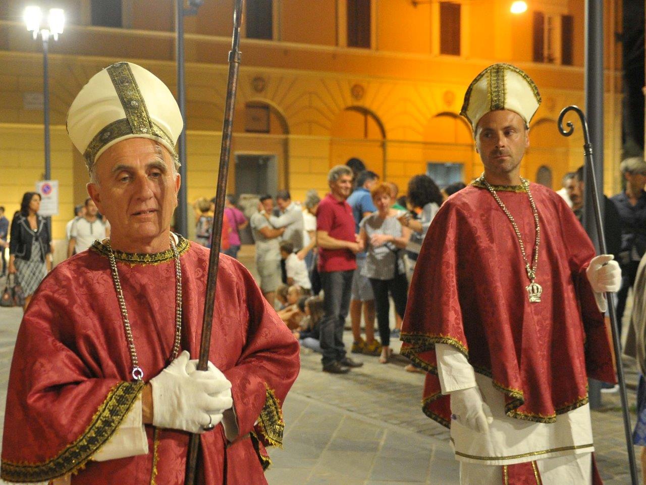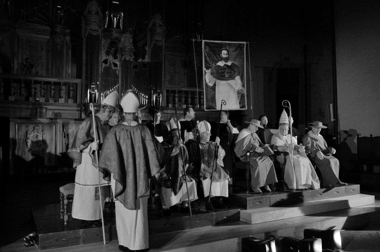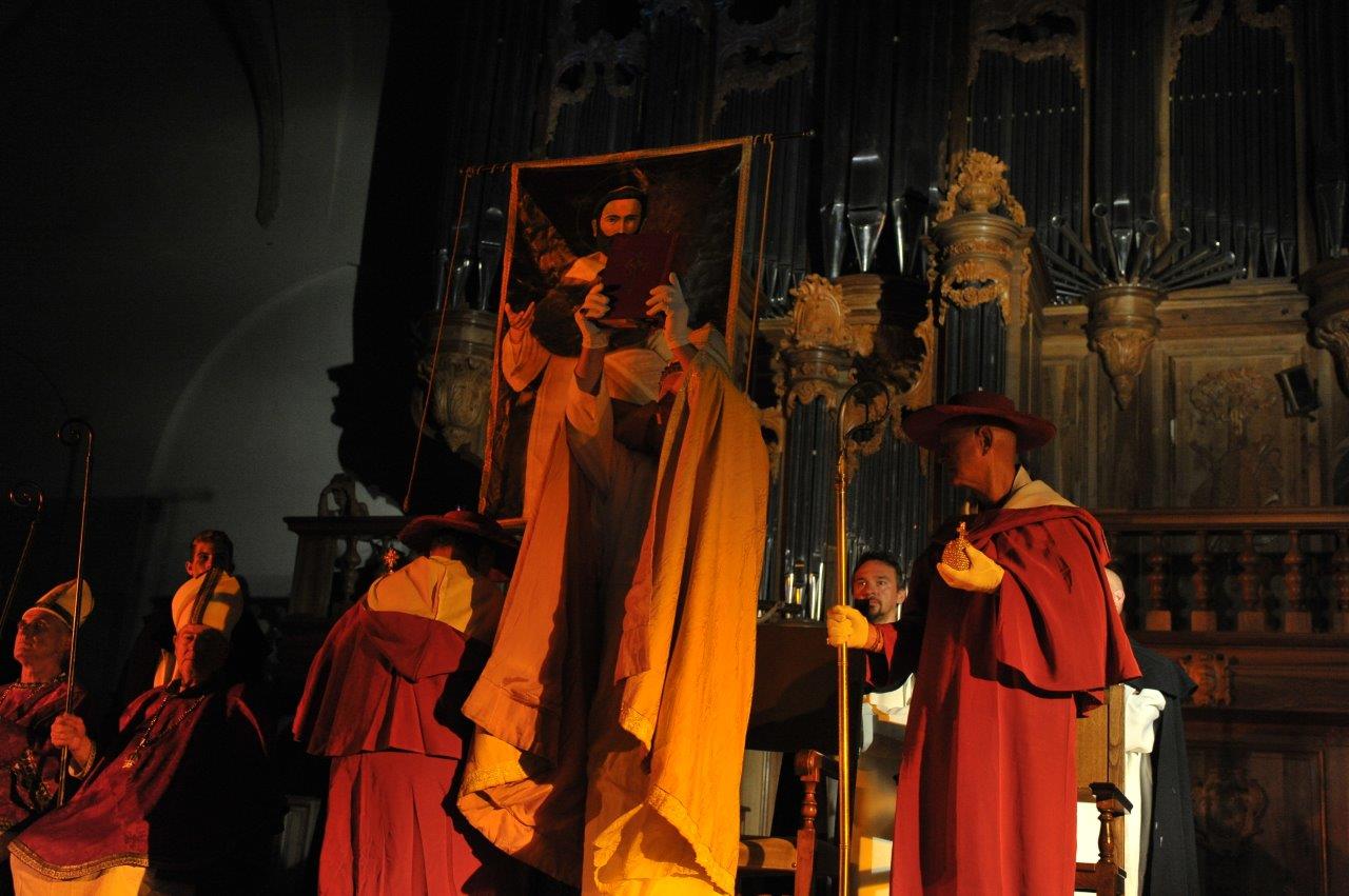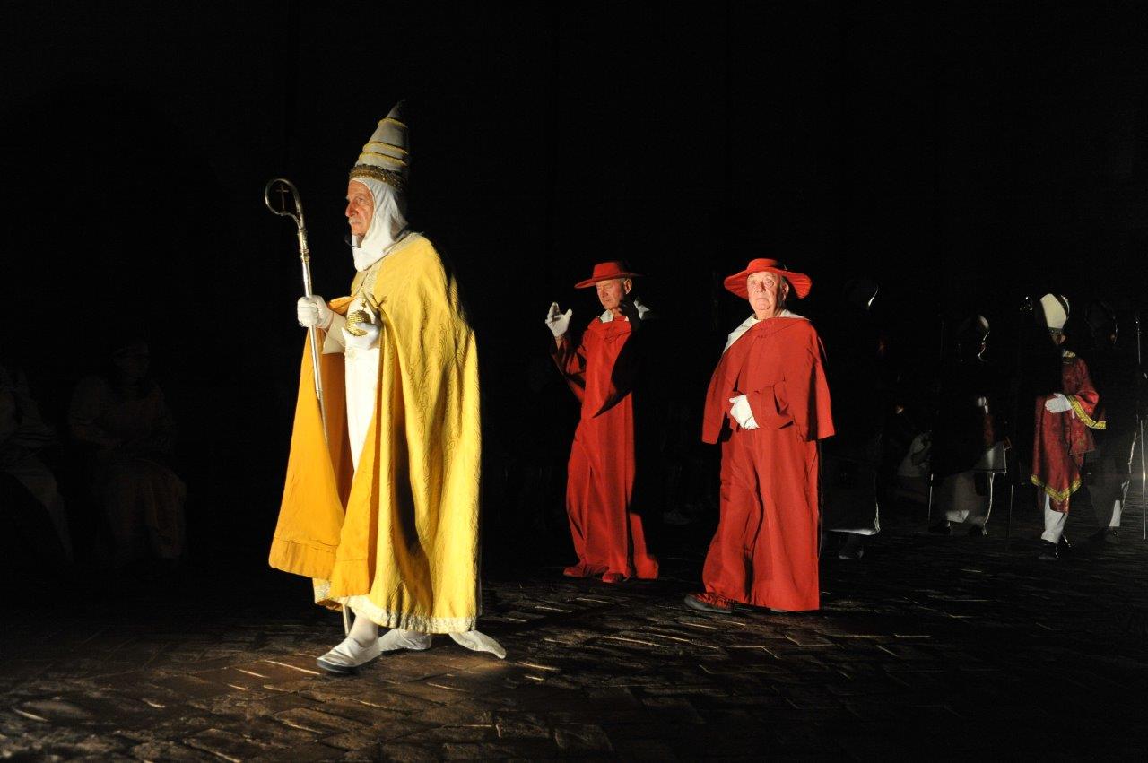 I figuranti vestiti da vescovi, abati, prelati, frati, nobili e popolani sono stati accolti dal suono potente del Pontificio Organo Dom Bedos Ruobo, suonato per l’occasione da Roberto Menossi. Dal vivo anche le altre musiche di scena, eseguite dall’ensemble dell’Anonima Frottolisti.