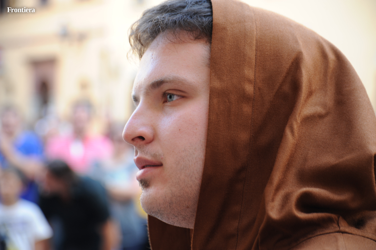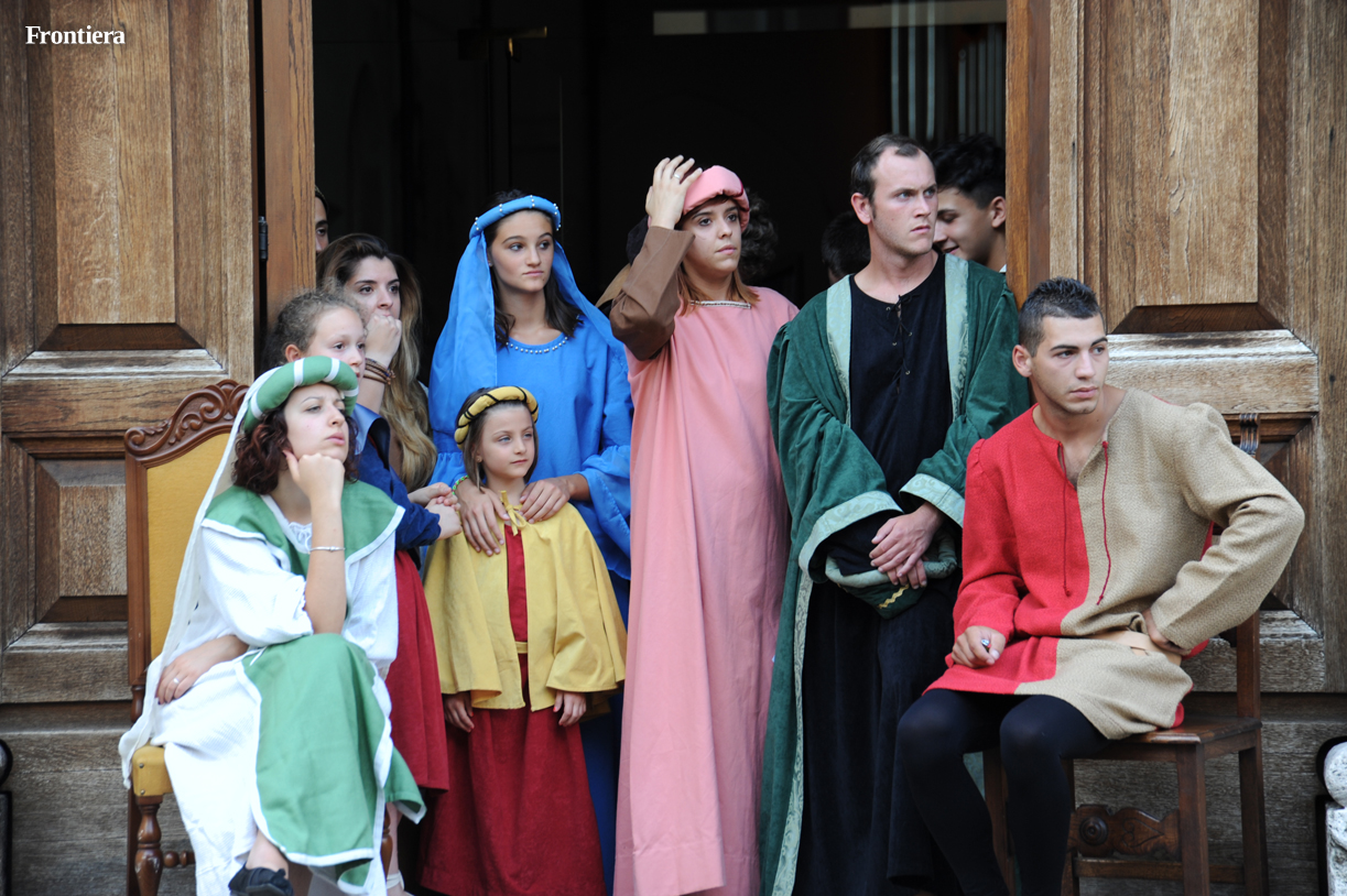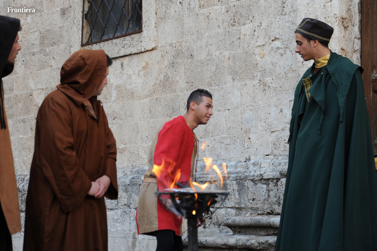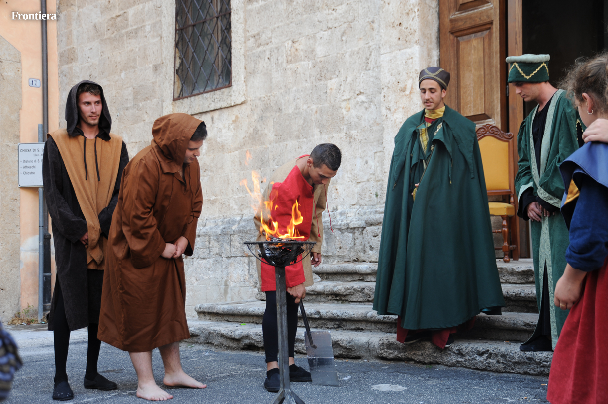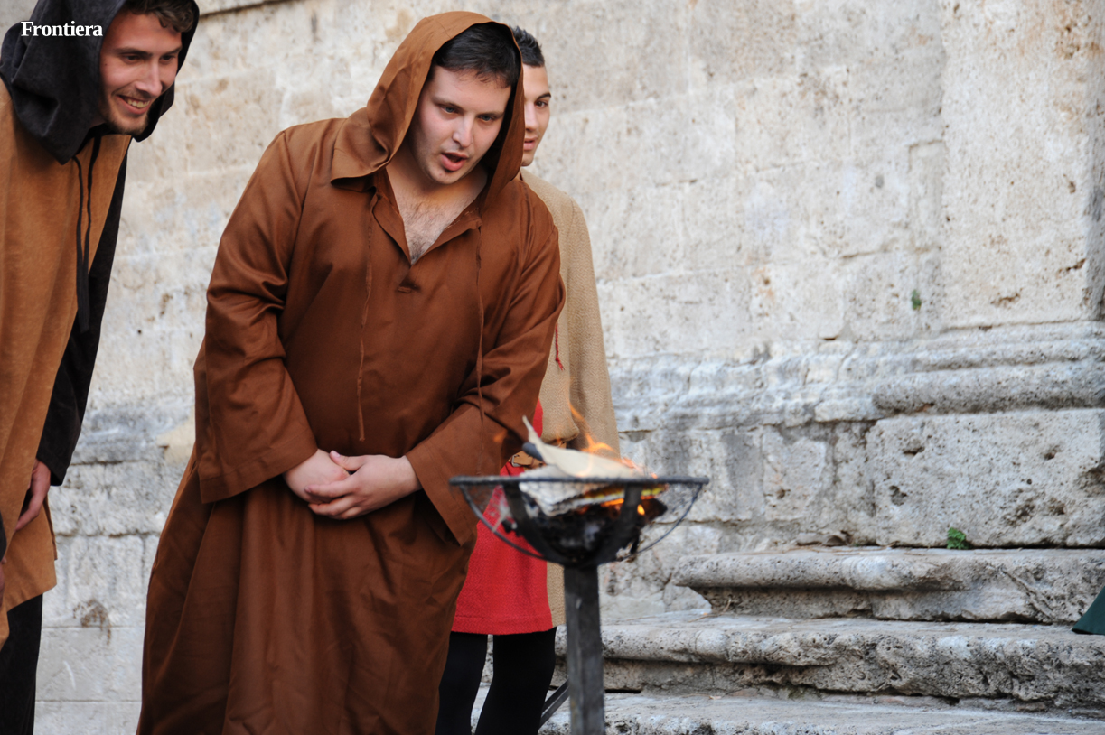 La scena è stata riprodotta in piazza Beata Colomba, all’ingresso della monumentale chiesa di San Domenico. Un braciere è stato posto al centro della scena. Gli eretici assistono increduli al miracolo del libro di Domenico risparmiato dalle fiamme.