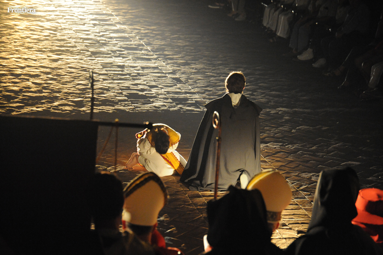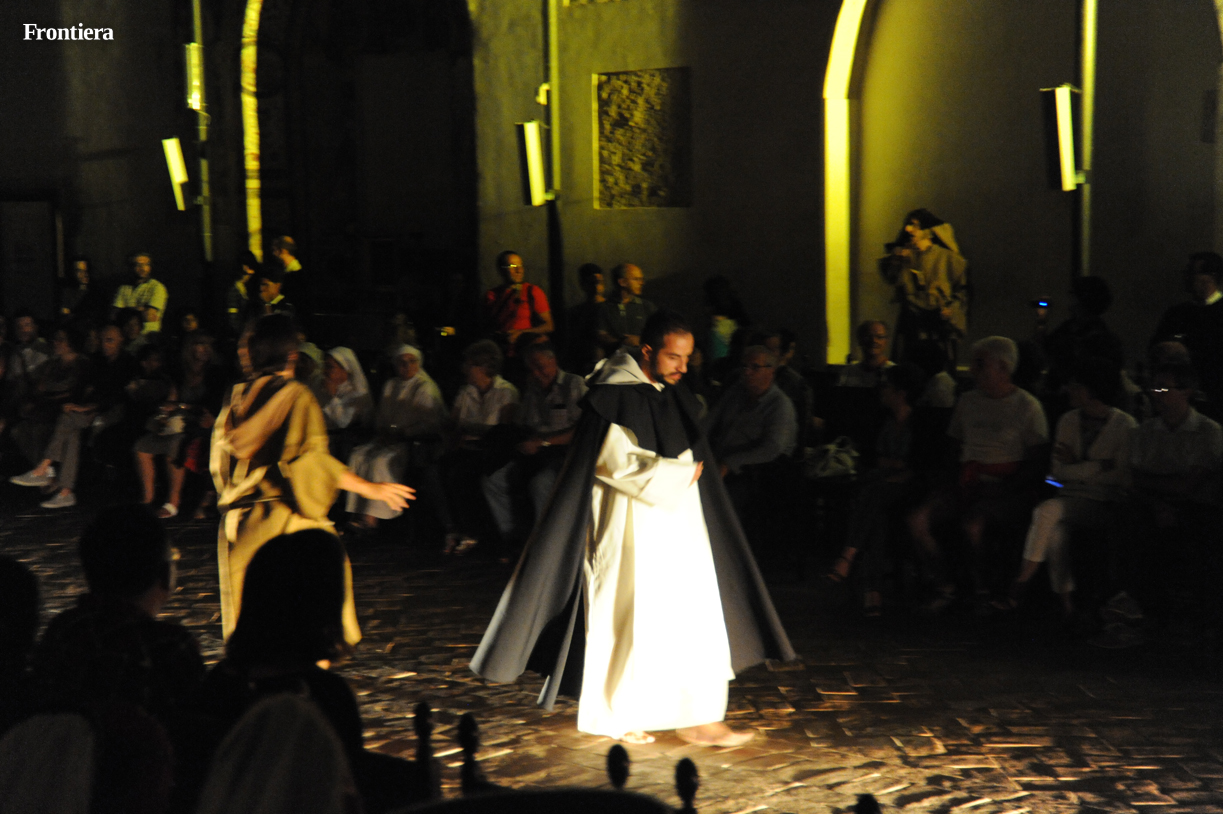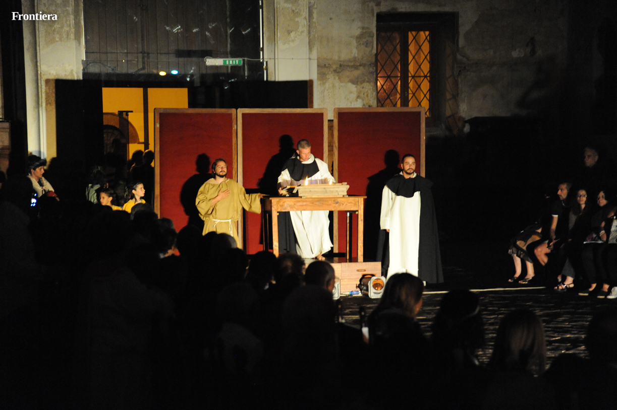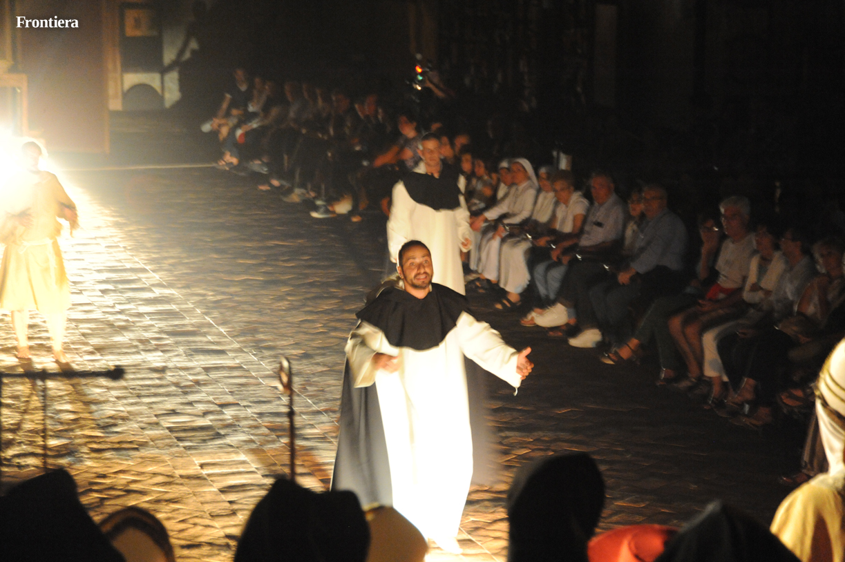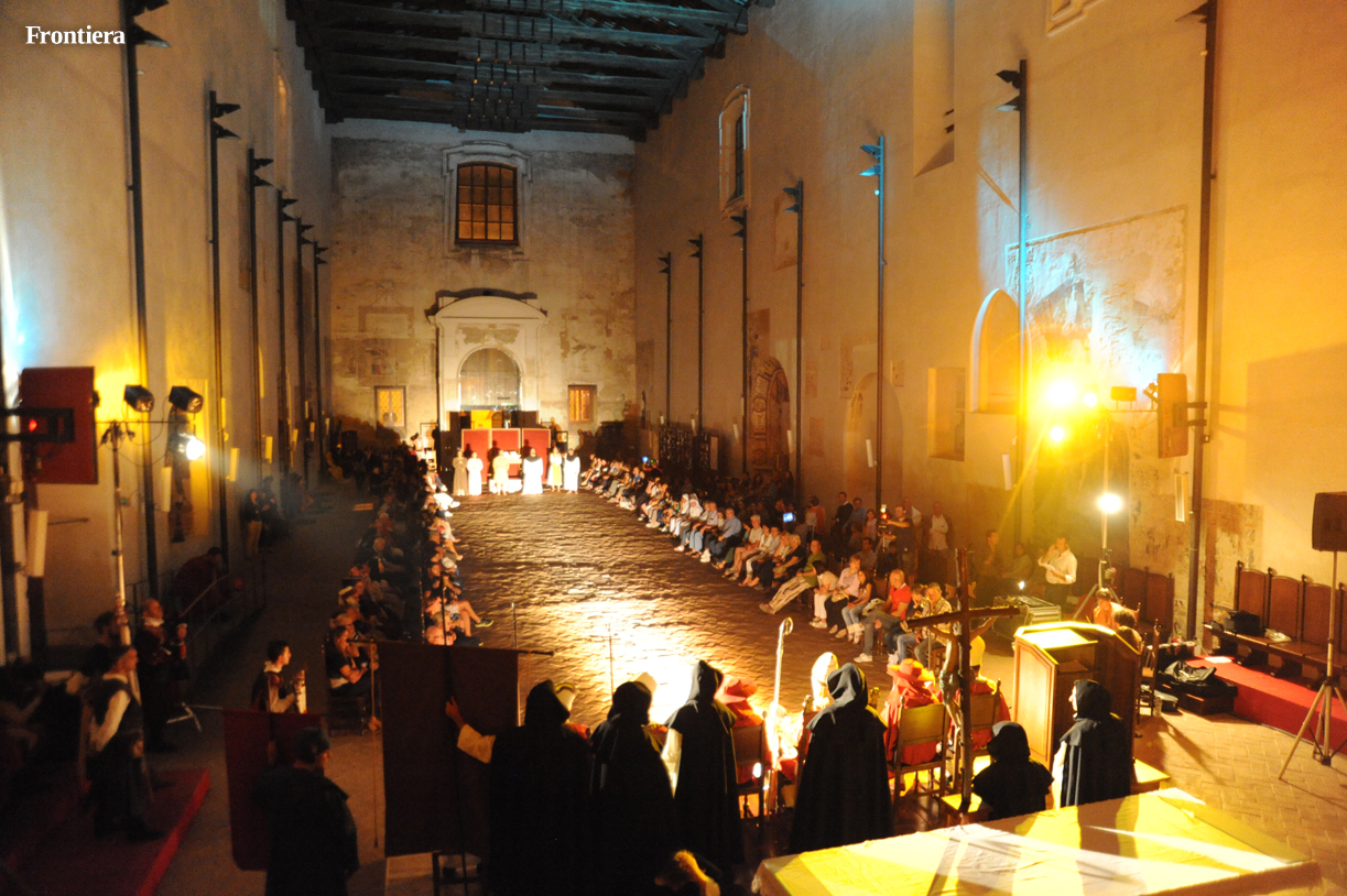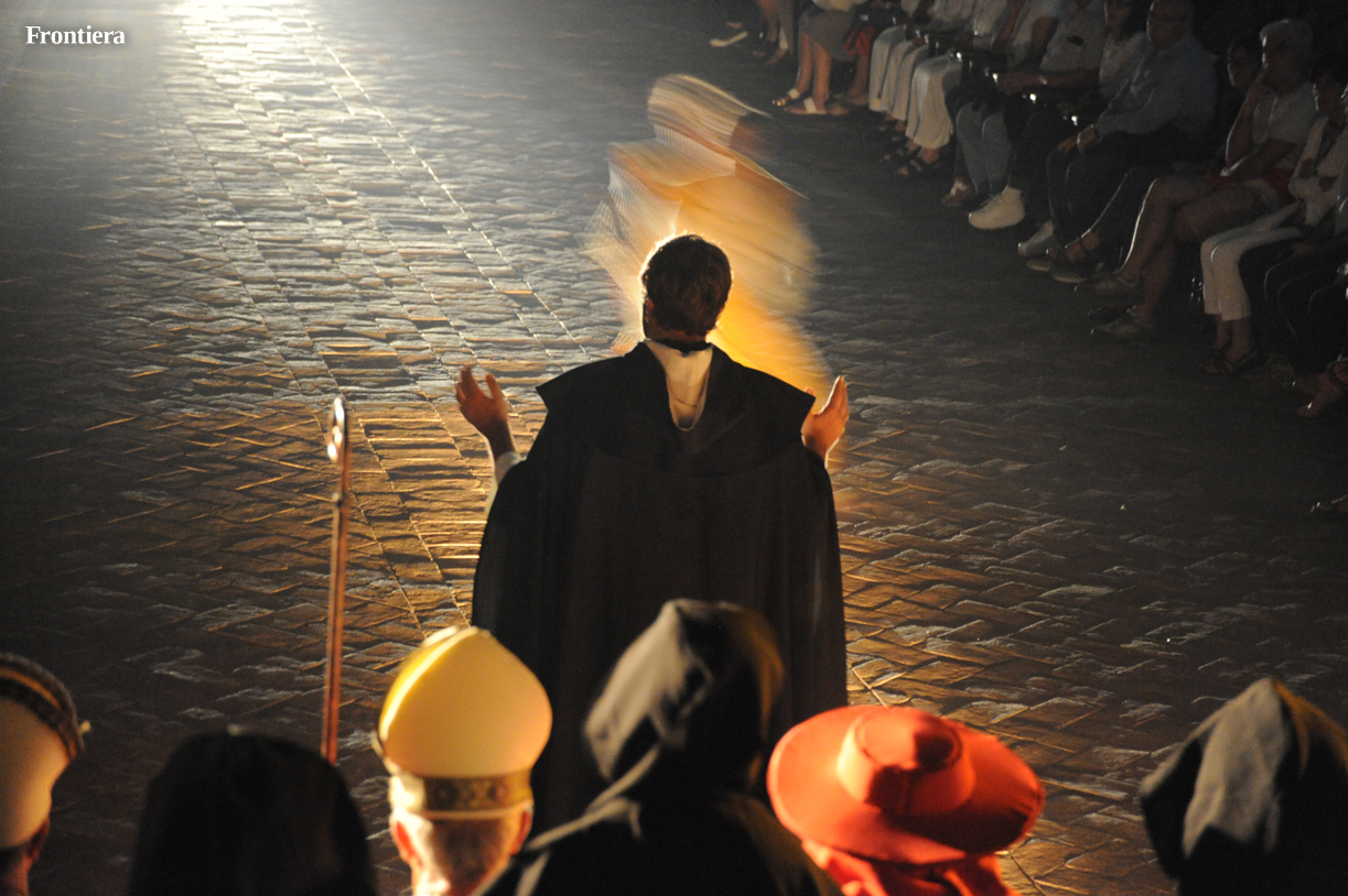 Con le sedie disposte ai lati, la grande navata della chiesa di San Domenico è divenuta un grande palcoscenico, sul quale le testimonianze attorno alla vita del santo hanno preso vita, aggiungendo profondità alla narrazione.