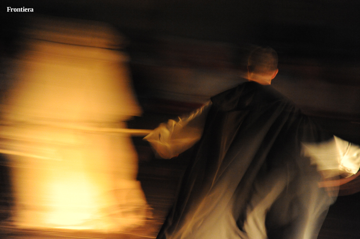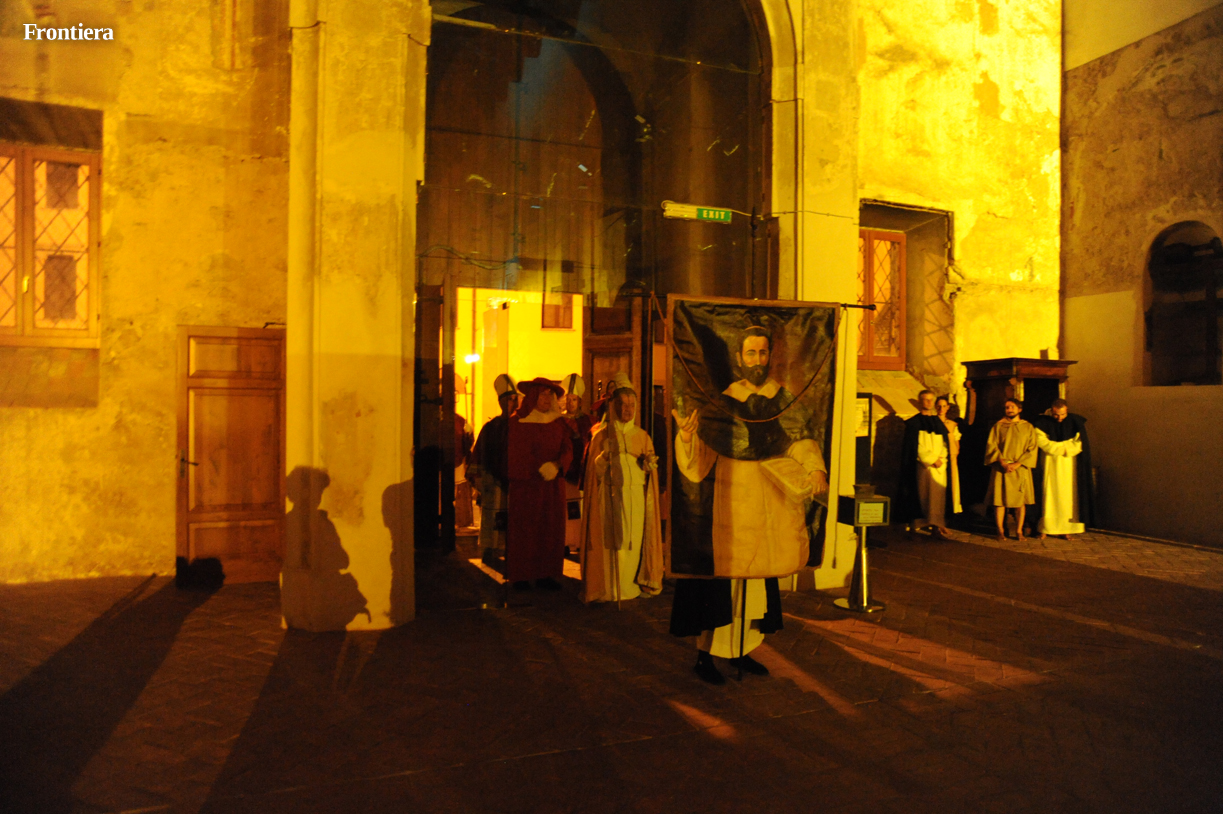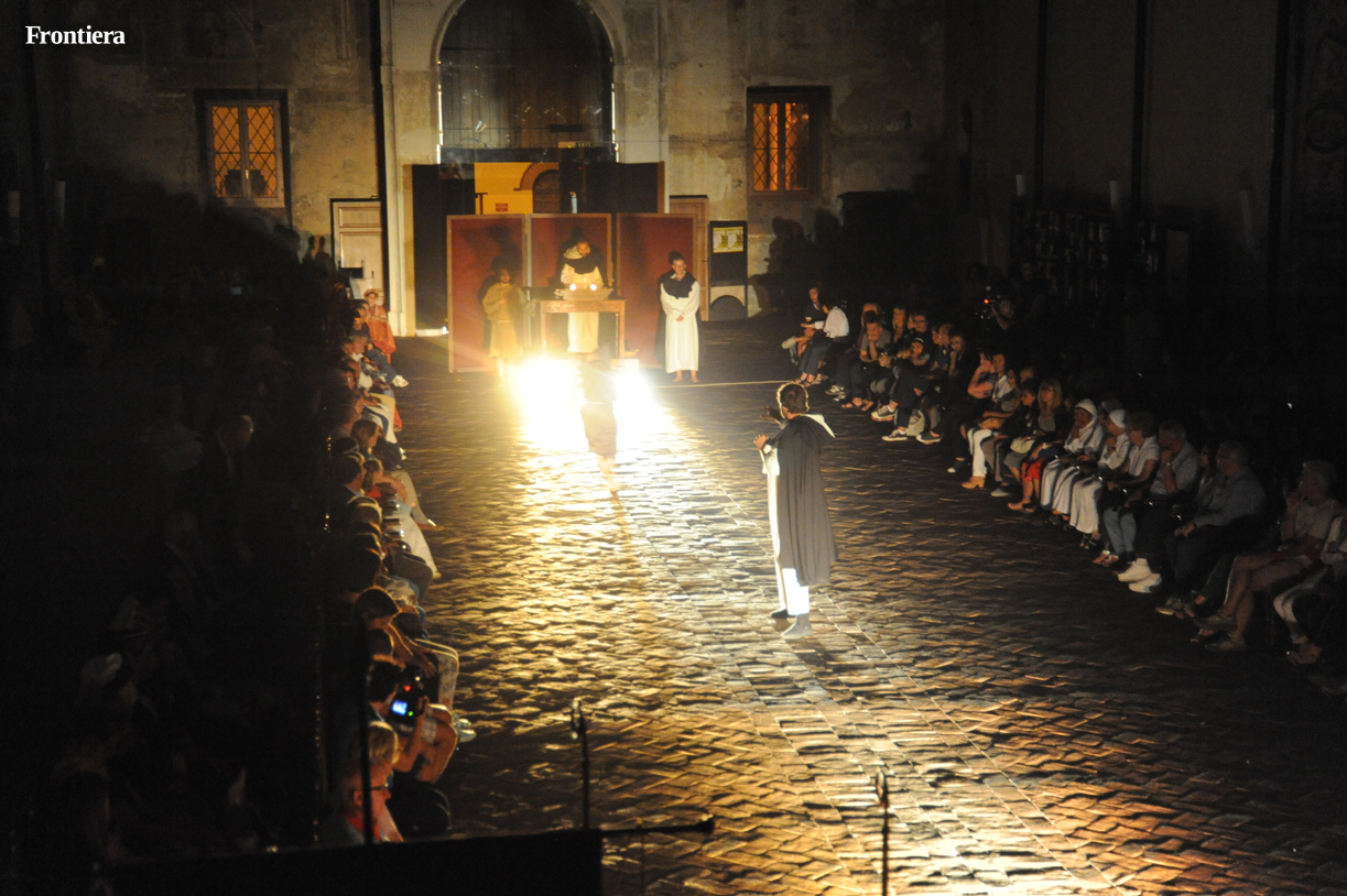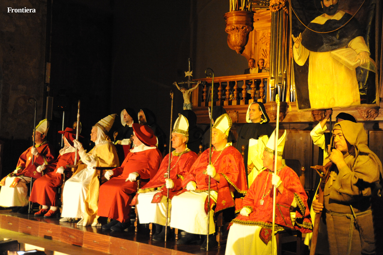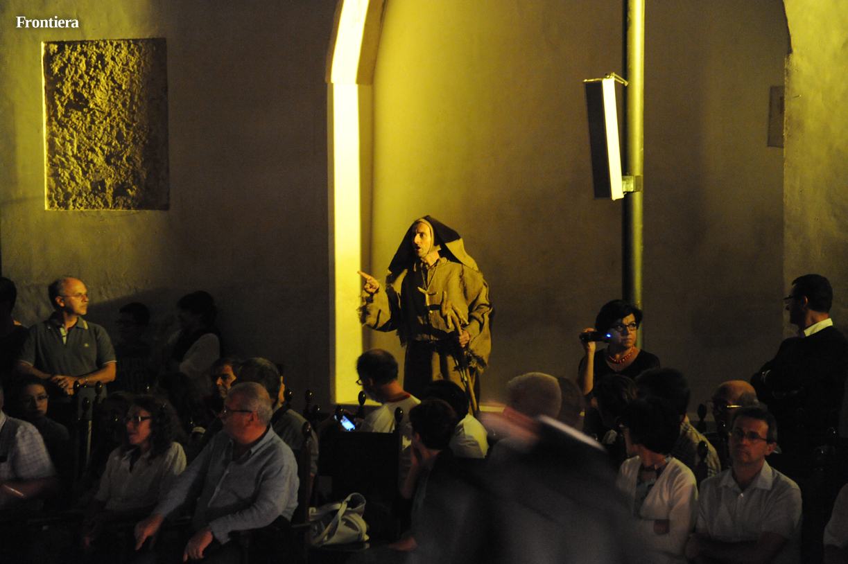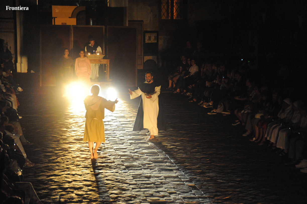 Con le sedie disposte ai lati, la grande navata della chiesa di San Domenico è divenuta un grande palcoscenico, sul quale le testimonianze attorno alla vita del santo hanno preso vita, aggiungendo profondità alla narrazione.