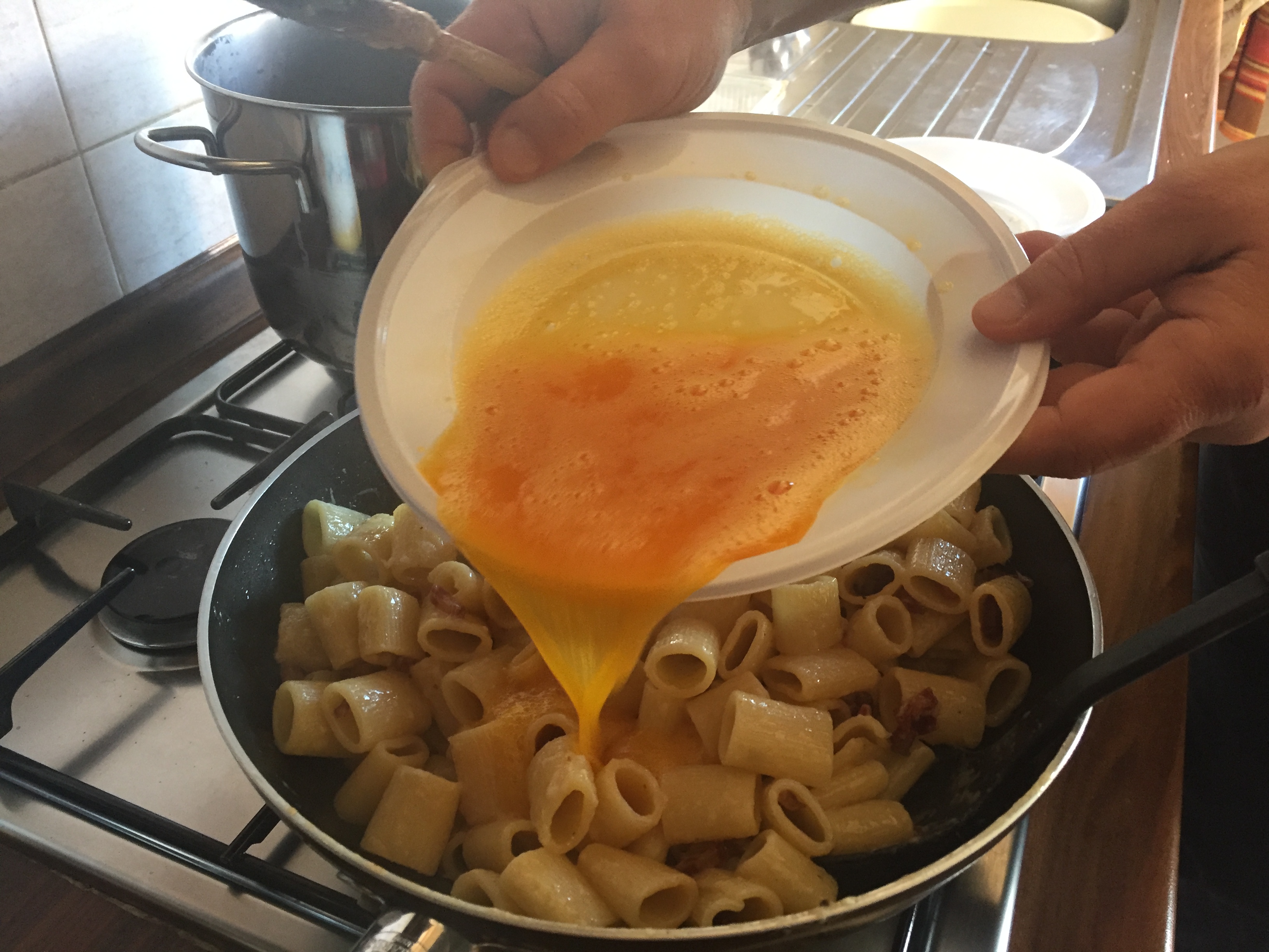 Intanto in una bacinella sbattere le uova insieme al pepe, il sale e il grana fino ad ottenere una consistenza cremosa con gli ingredienti tutti incorporati tra loro. Scolare la pasta al dente e mantecare il tutto nella padella a fiamma bassa. Il segreto è continuare a mescolare fino a che non si addenserà leggermente l’uovo, ma facendo attenzione a non farlo diventare “frittata”.