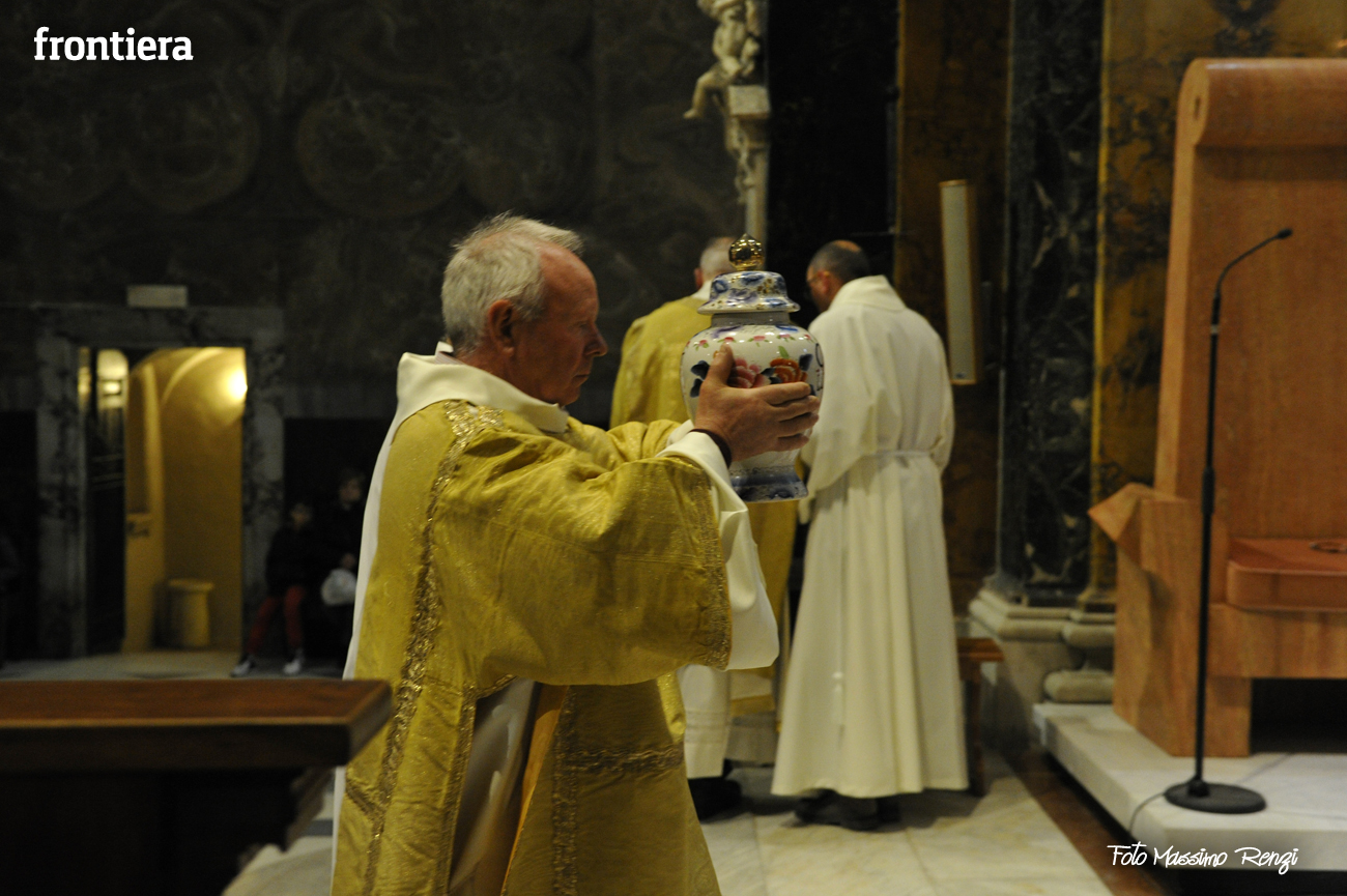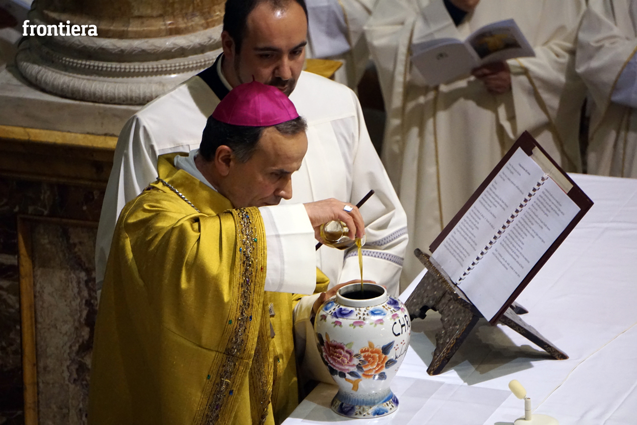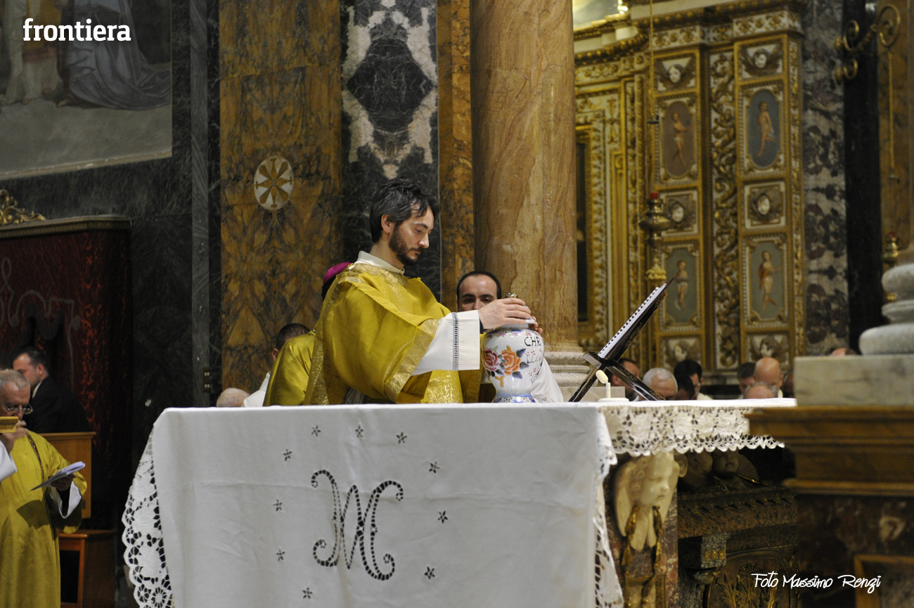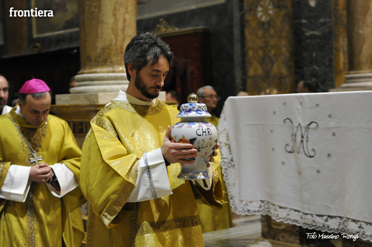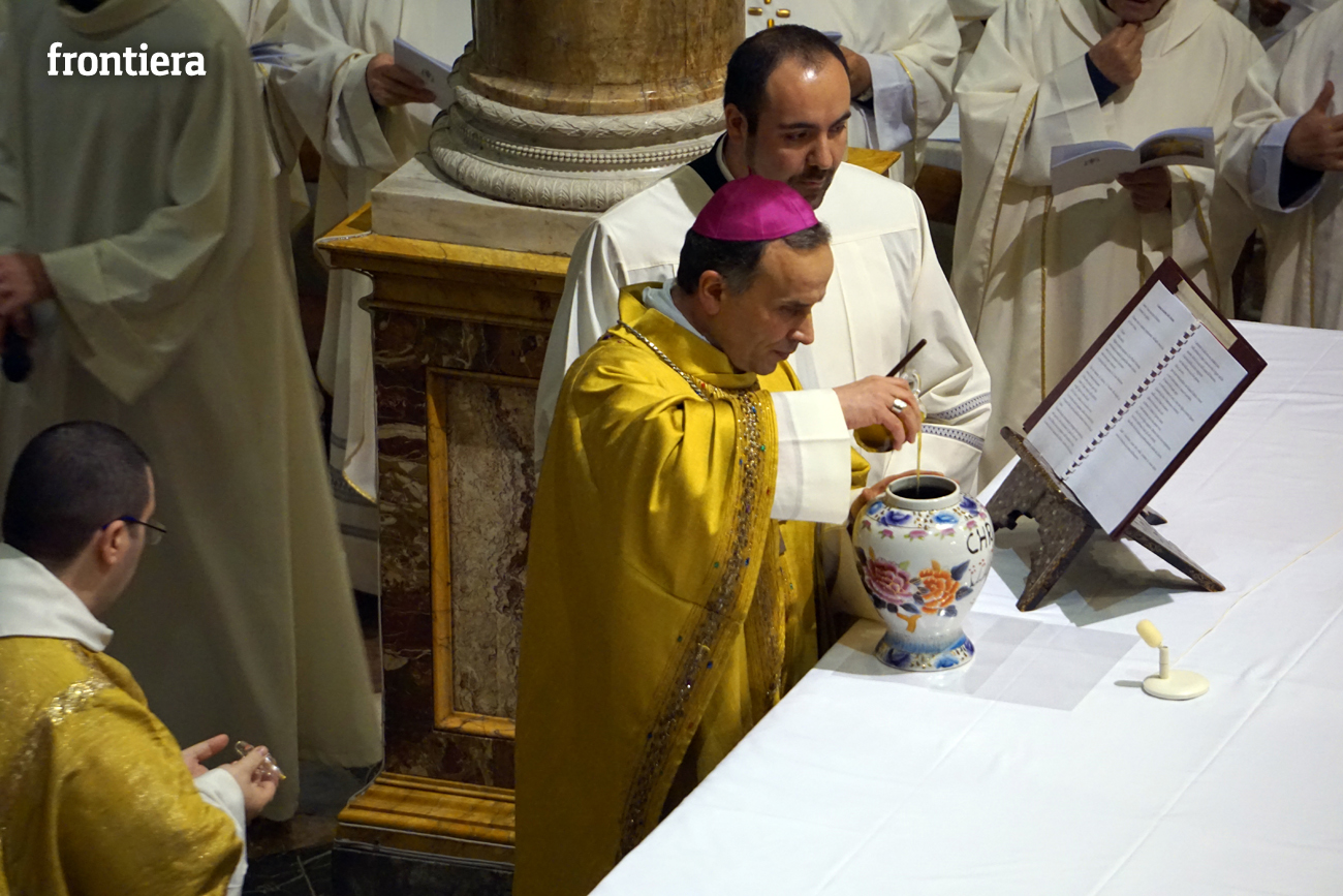 È stata celebrata in Santa Maria nel pomeriggio del 23 marzo, Mercoledì Santo, la Messa del Crisma. Non soltanto i presbiteri della diocesi, ma anche tantissimi fedeli laici hanno preso parte alla liturgia solenne: i primi in forza del sacerdozio ministeriale, tutti quanti in virtù della consacrazione battesimale.